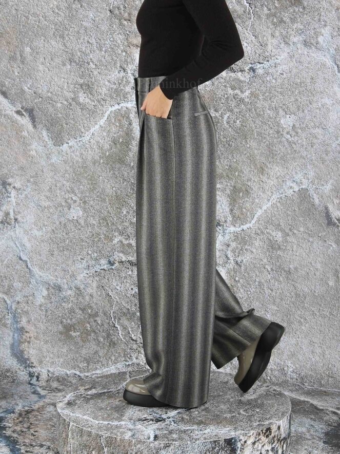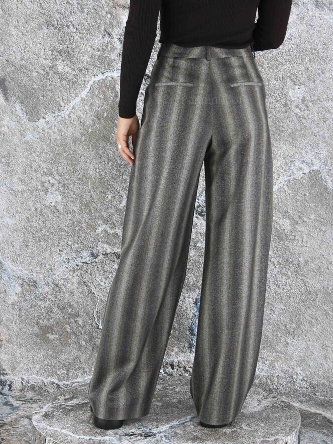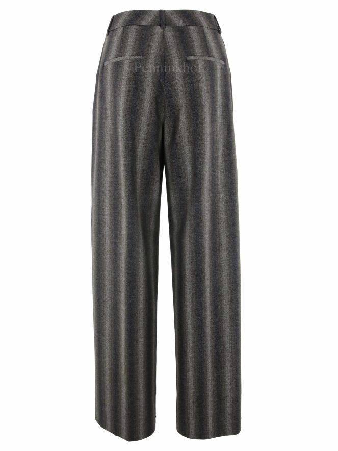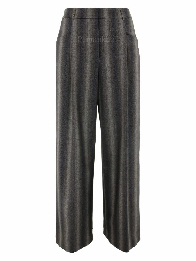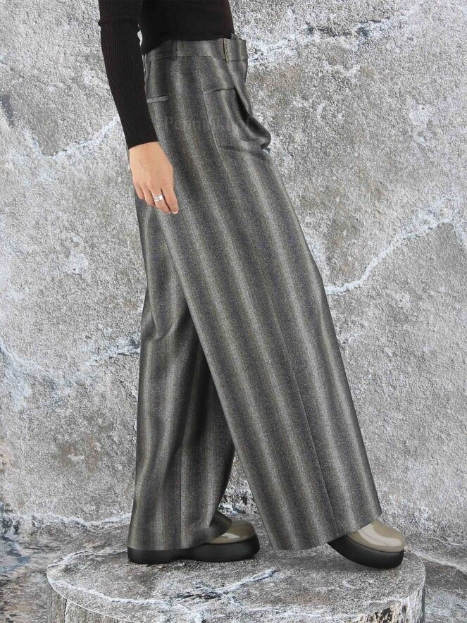 Pantalon à jambes larges de la marque Peserico, dans une structure à rayures mixtes aux multiples nuances de gris foncé et brun foncé. Un fin fil d'argent est inséré dans le tissu. Le pantalon est doté de deux plis qui apportent au tissu de la jambe un "look" souple et ondulé. Lavage déconseillé.