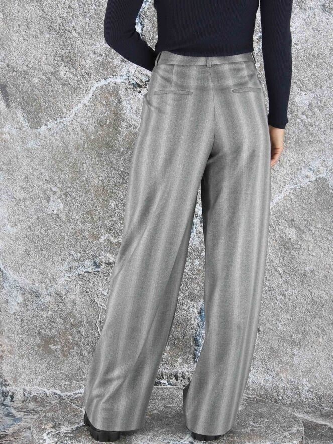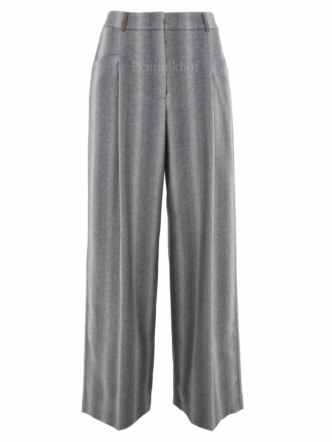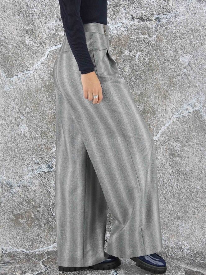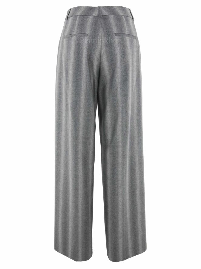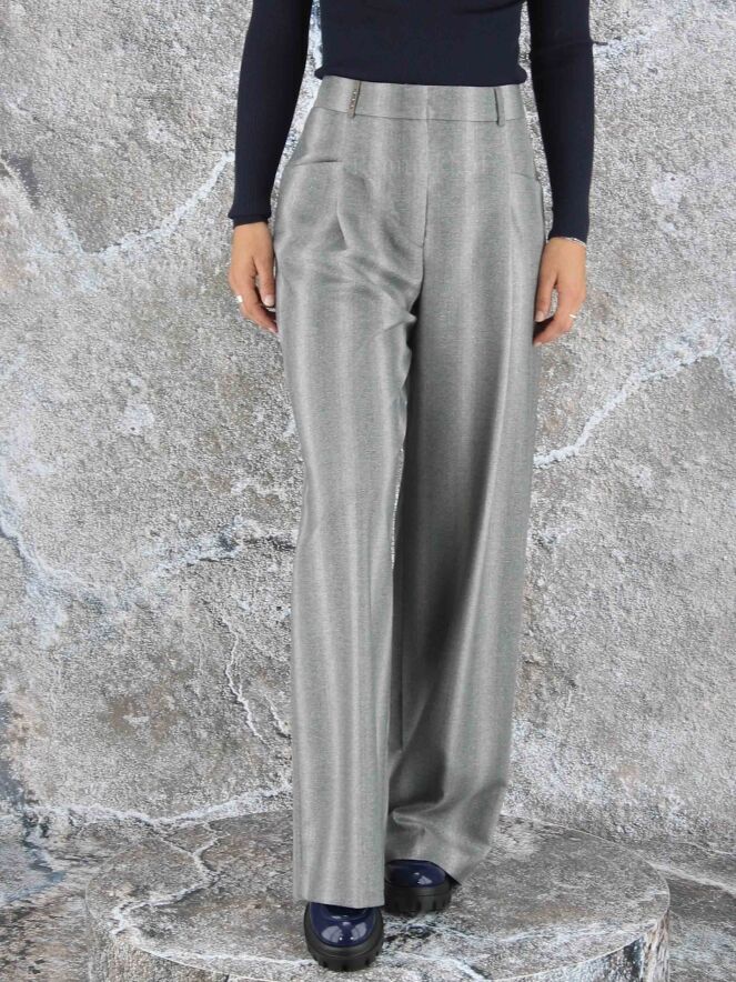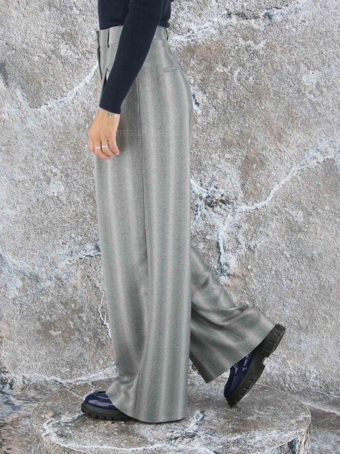Pantalon à jambes larges de la marque Peserico, dans une structure à rayures mixtes aux multiples nuances de gris clair. Un fin fil d'argent est inséré dans le tissu. Le pantalon est doté de deux plis qui apportent au tissu de la jambe un "look" souple et ondulé. Lavage déconseillé.