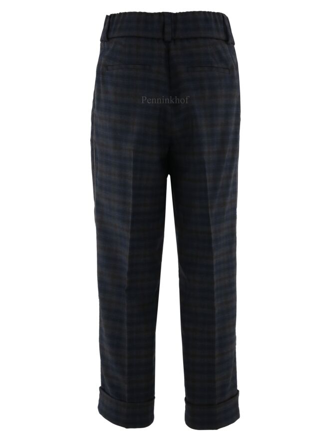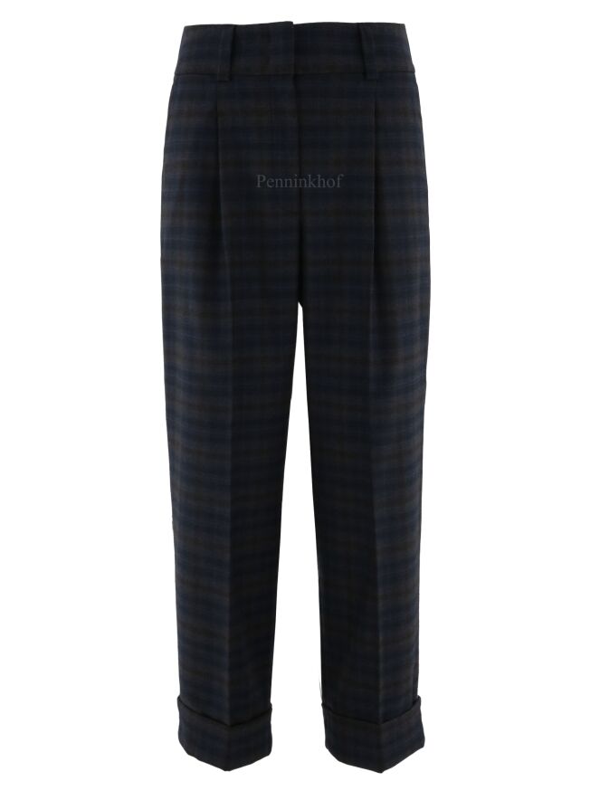Pantalon large de la marque Peserico, à imprimé de carreaux aux multiples nuances de bleu foncé et de brun. Au dos, la taille est équipée d'une bande élastique à fronces. Le bas des jambes présente de larges revers. Une garniture de strass argentée orne l'intérieur des jambes. Lavage déconseillé.
