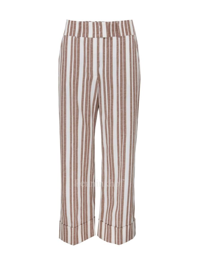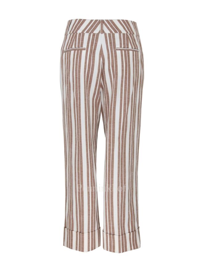 Pantalon de la marque Peserico, à rayures marron sur un fond de couleur blanc crème. Large bande à la taille pour un meilleur confort. Le pantalon est doté de poches fendues latérales et d'un revers de 10 cm au bas des jambes. Lavage à 30 degrés.
