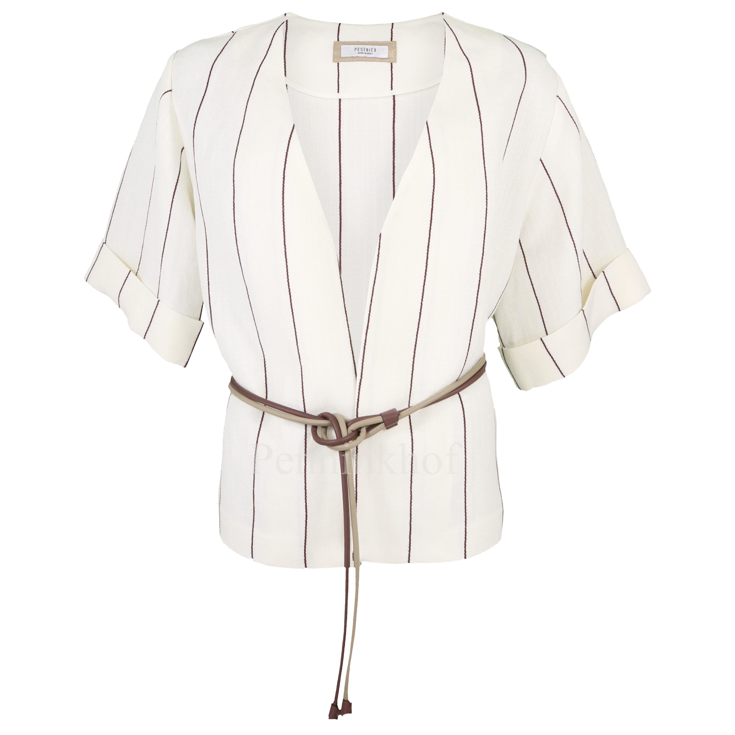 Veste courte sans fermeture de la marque Peserico, à fines rayures marron sur un fond de couleur blanc crème. Les manches courtes ont un large revers. 2 cordons de cuir beige et marron sont porté au-dessus des hanches pour se nouer négligement au niveau de la taille. Lavage déconseillé.