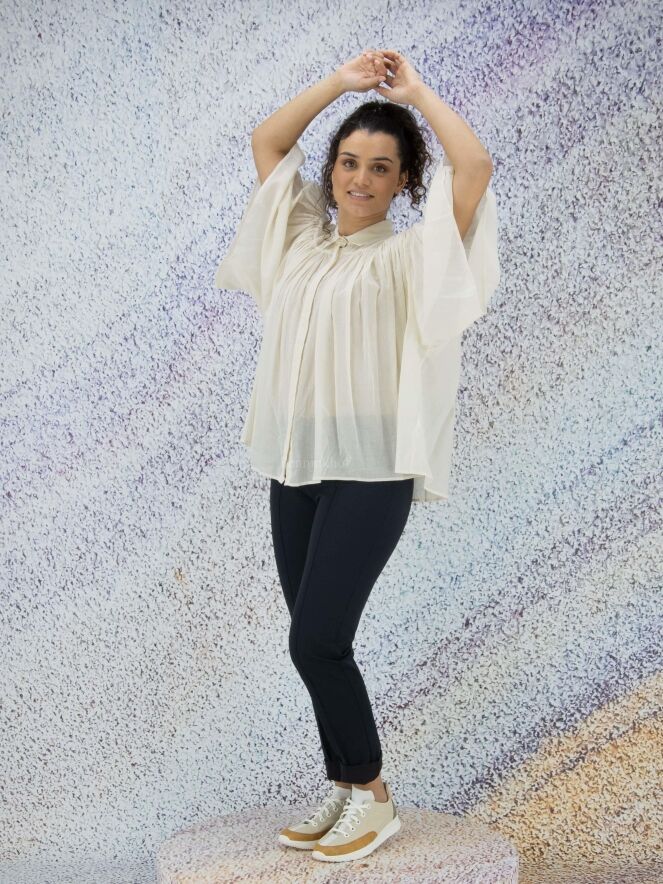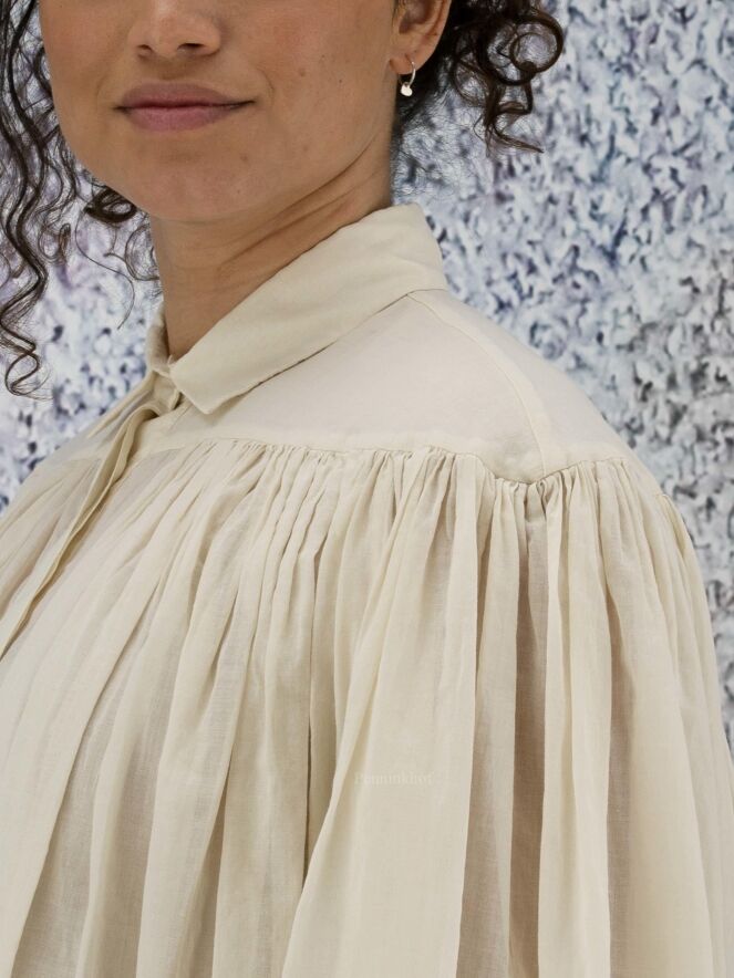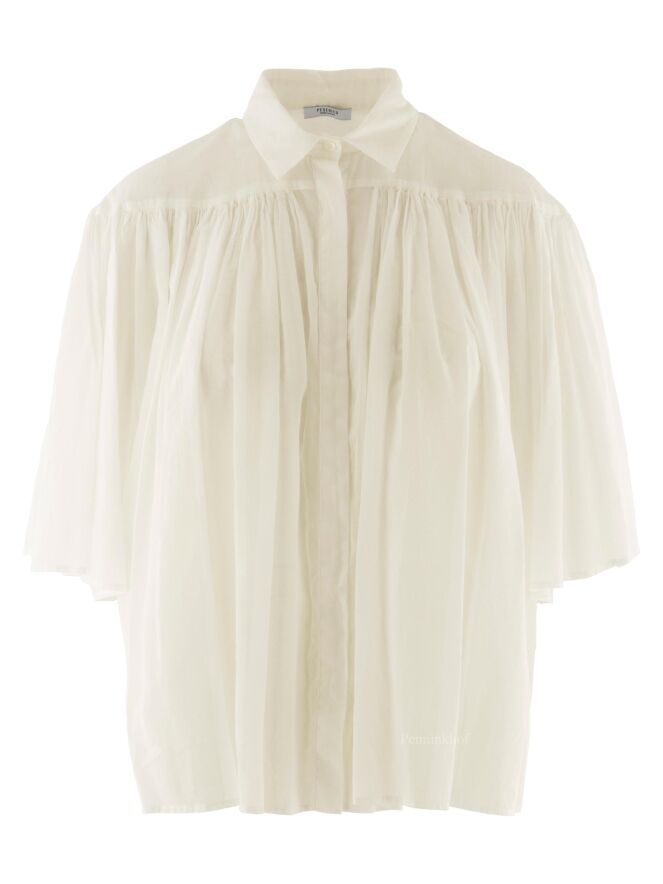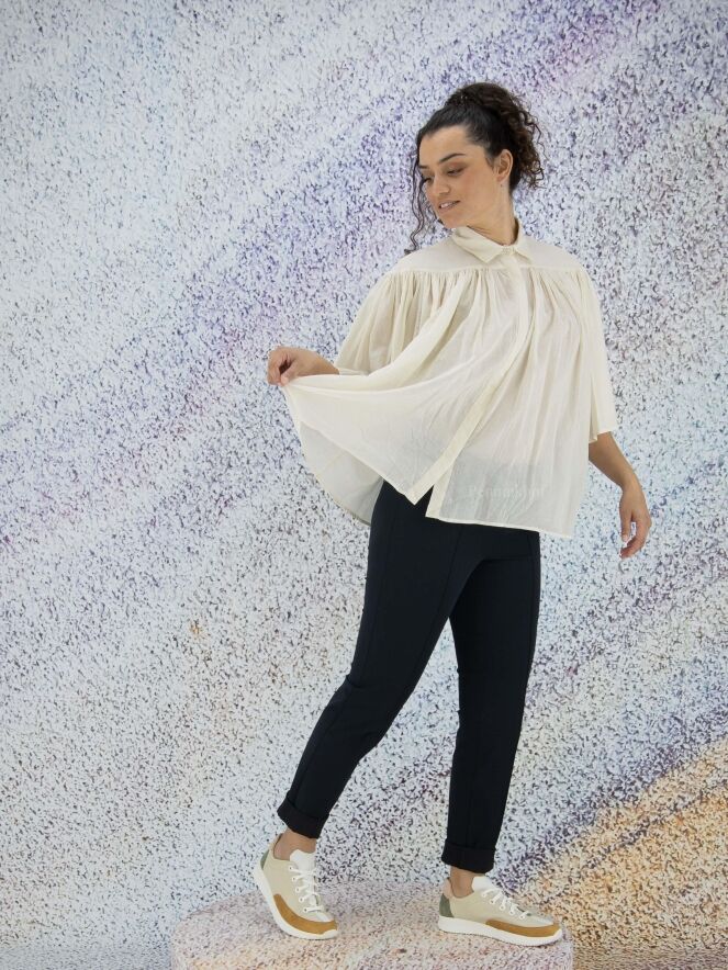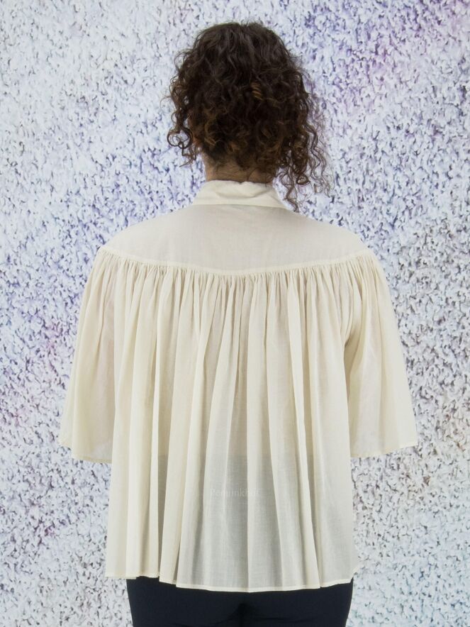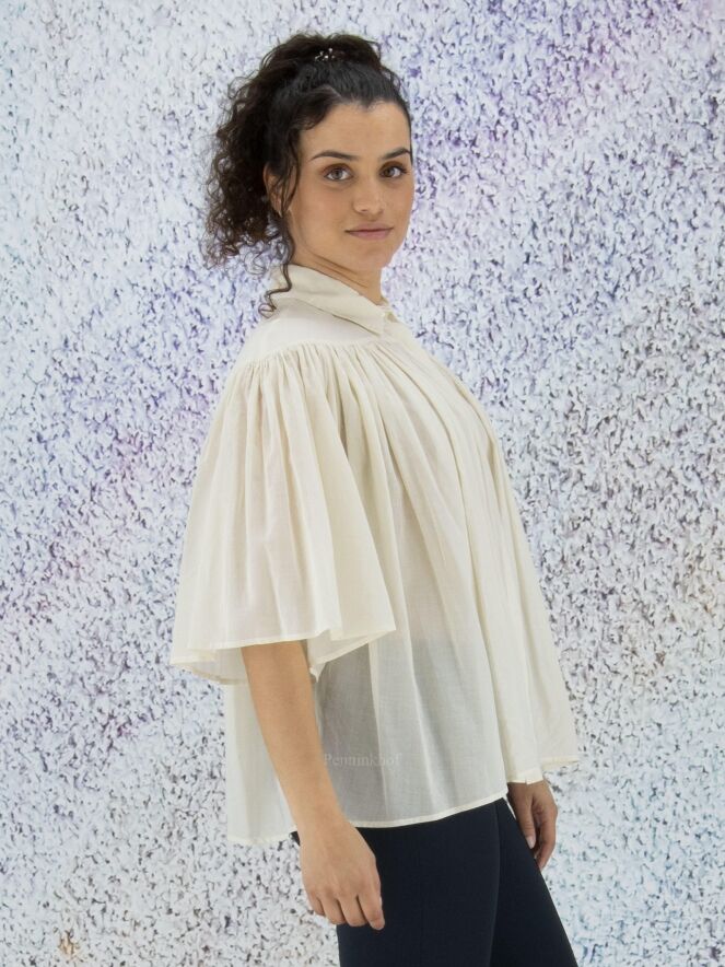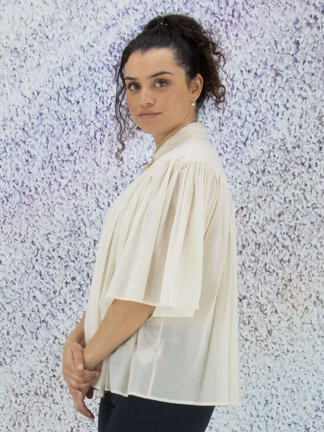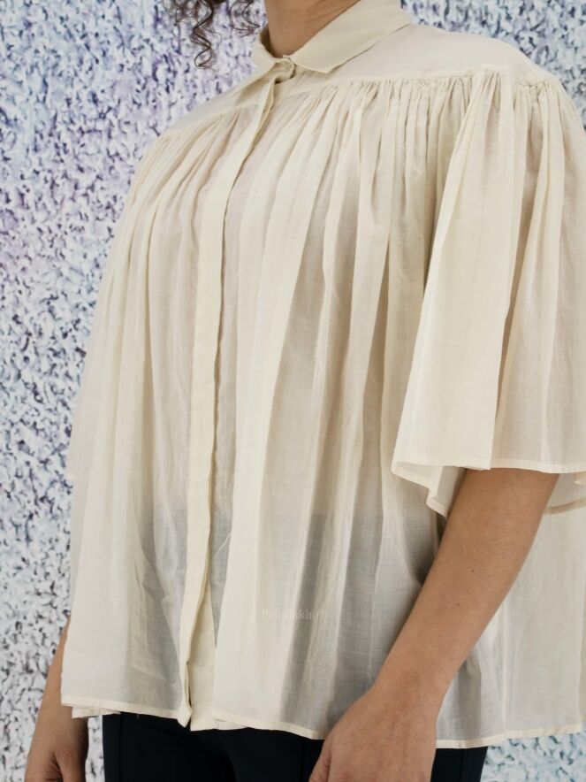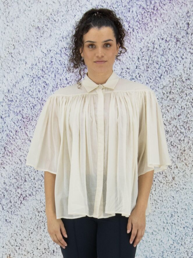 Chemise légèrement transparente de la marque Peserico, de couleur blanc crème. La chemise prend toute son amplitude à l'avant et à l'arrière grâce aux nombreux plis créés par la couture horizontale située au-dessus de la poitrine. La chemise est dotée d'une patte de boutonnage cachée. Lavage à 30 degrés.