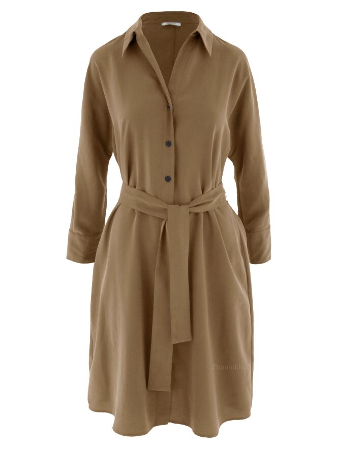 Luxueuse robe boutonnée de la marque Peserico, de couleur chamois. La robe est dotée d'une ceinture à nouer dans le même tissu, ornée de rayures horizontales en strass à l'arrière. Les manches sont à poignet boutonné. Lavage à la main.