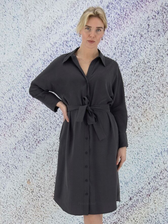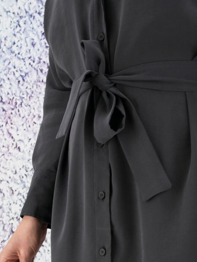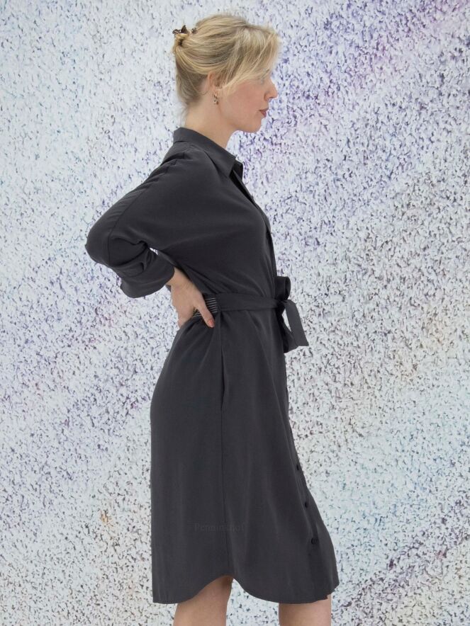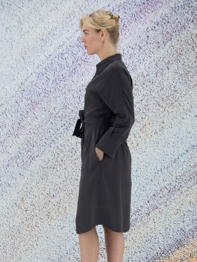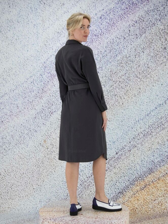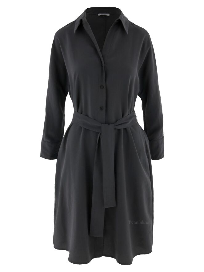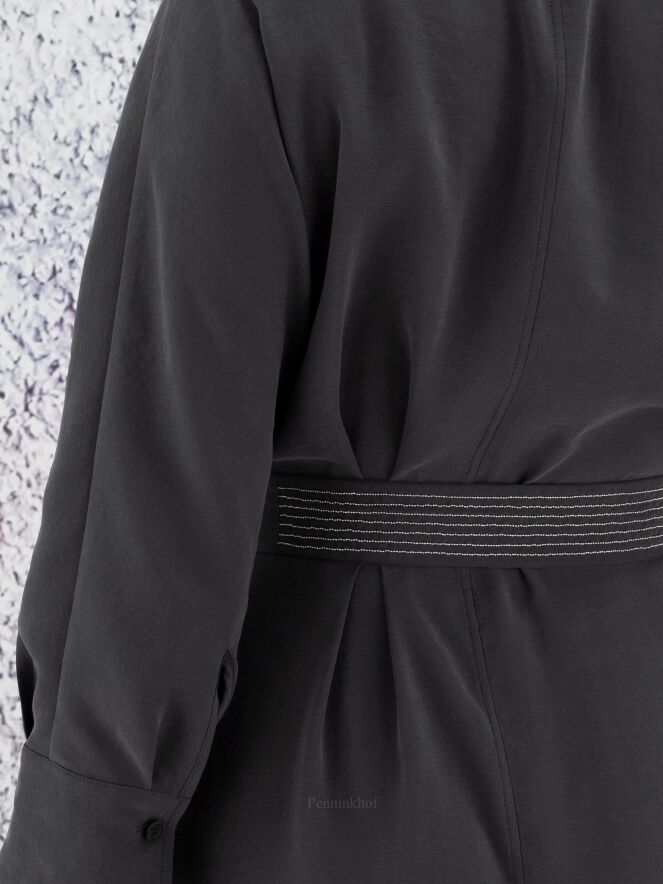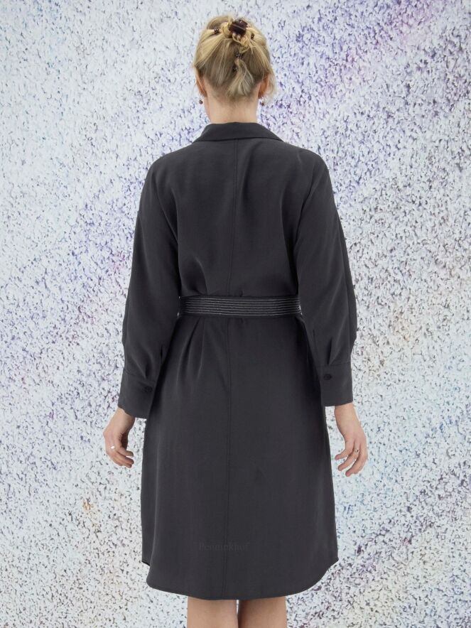 Luxueuse robe boutonnée de la marque Peserico, de couleur gris foncé. La robe est dotée d'une ceinture à nouer dans le même tissu, ornée de rayures horizontales en strass à l'arrière. Les manches sont à poignet boutonné. Lavage à la main.