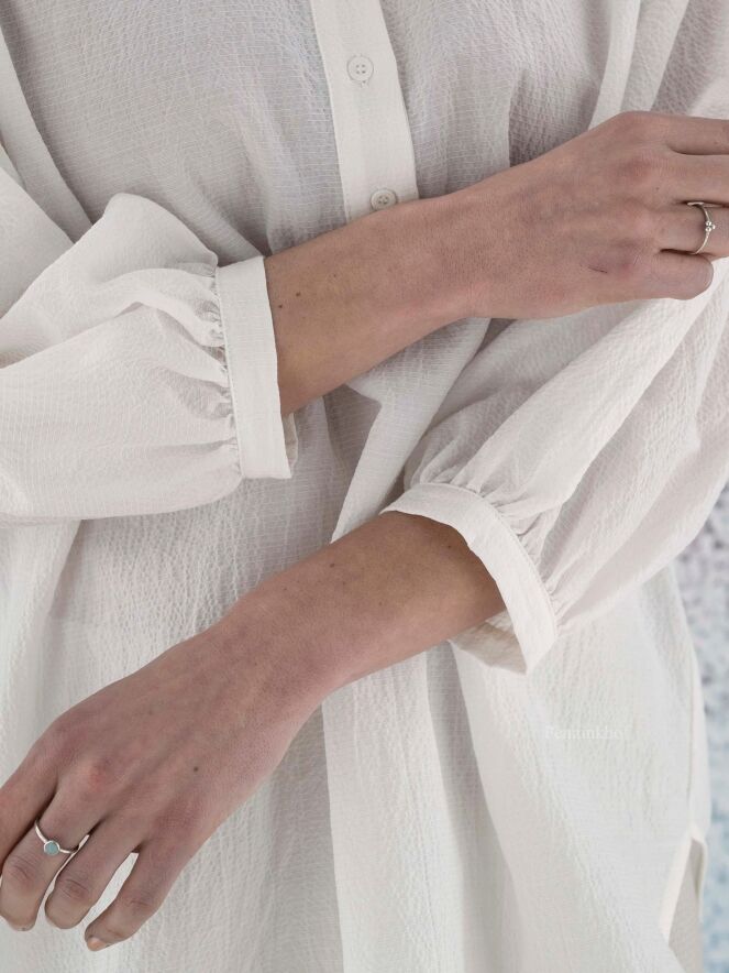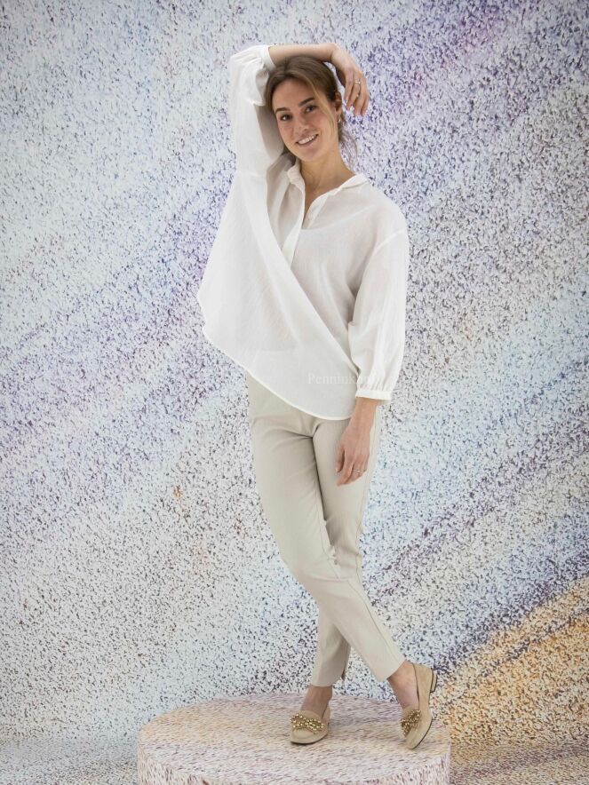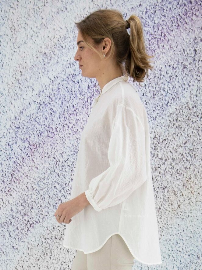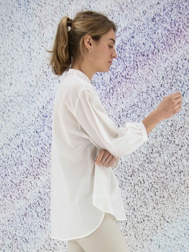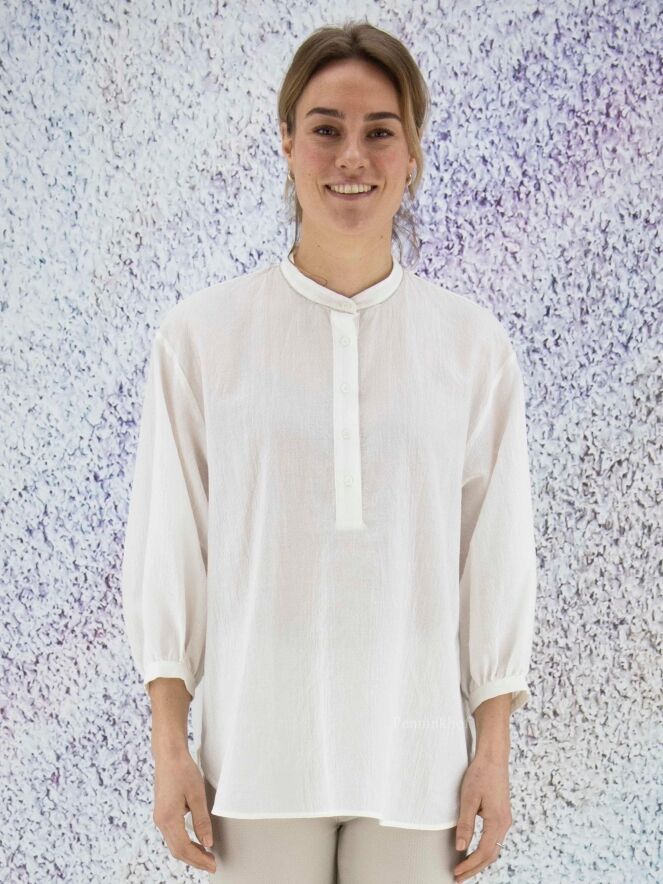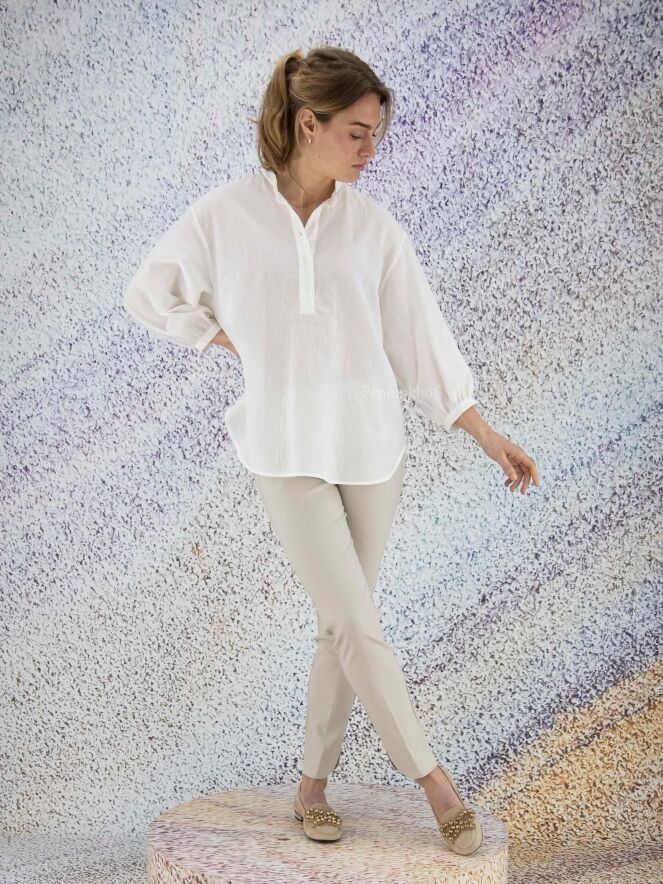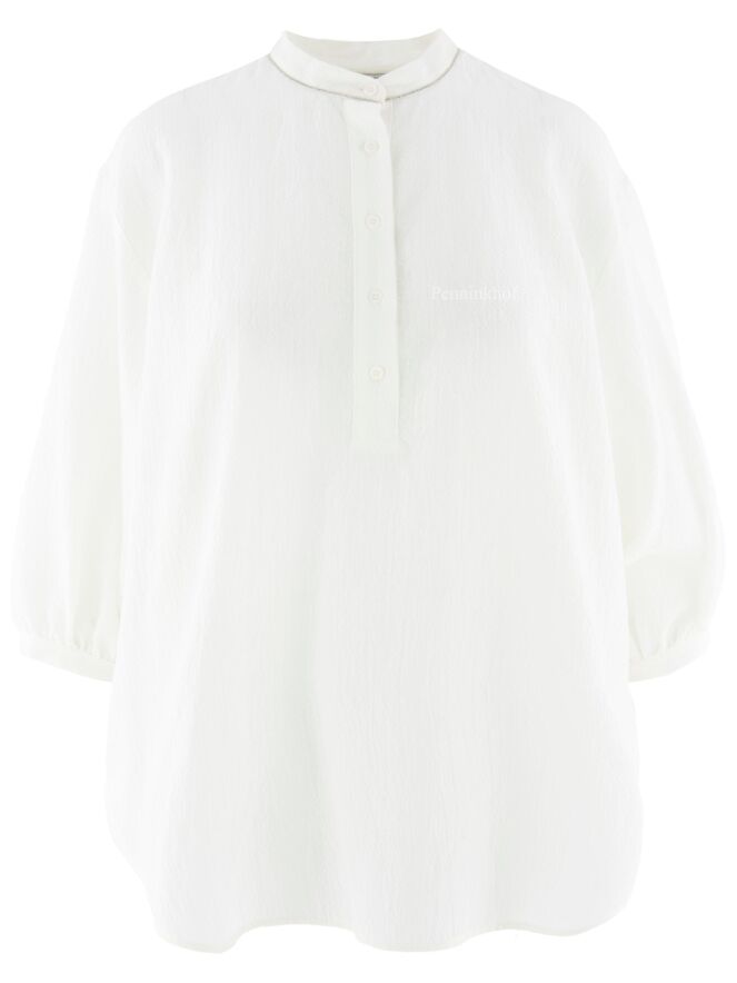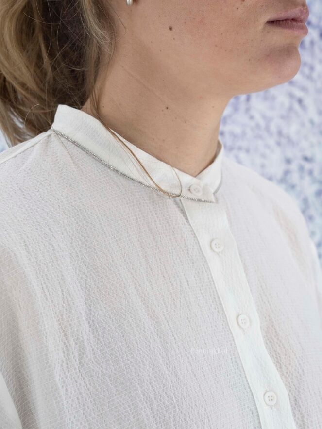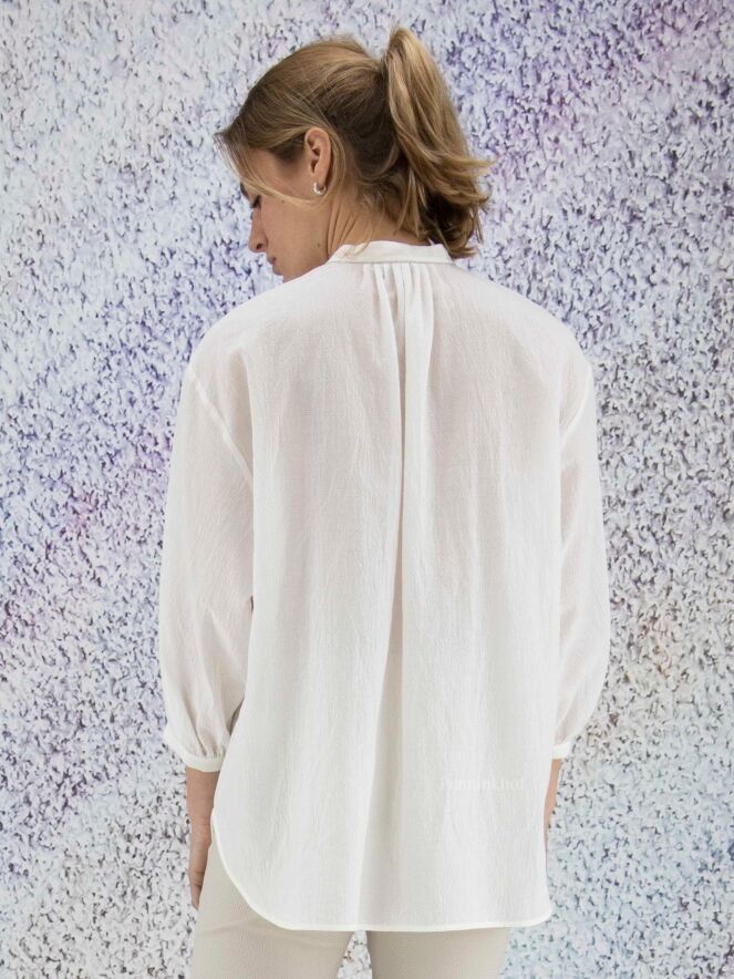 Chemise ample et légèrement transparente de la marque Peserico, à fines côtes froissées de couleur écrue. L'encolure boutonnée est ornée de strass. La chemise présente des manches mi-longues fermées et de larges fentes latérales au bas. Lavage déconseillé.