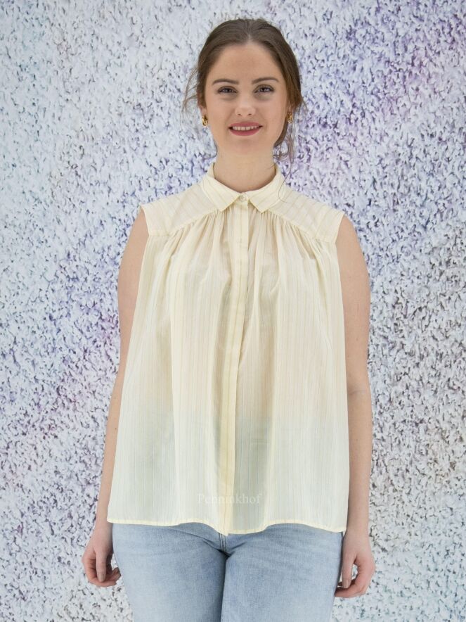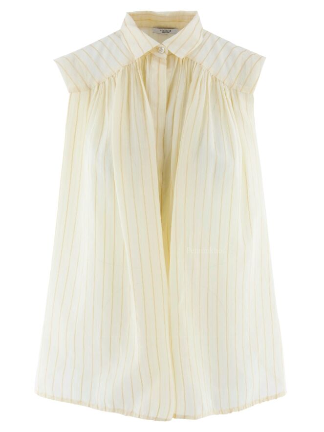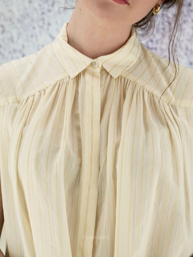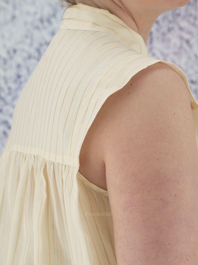 Chemisier large sans manches de la marque Peserico, à fines rayures beige sur un fond couleur sable. A l'avant et à l'arrière, de nombreux plis partent des épaules pour élargir la coupe dans une ligne A. Lavage à 30 degrés.
