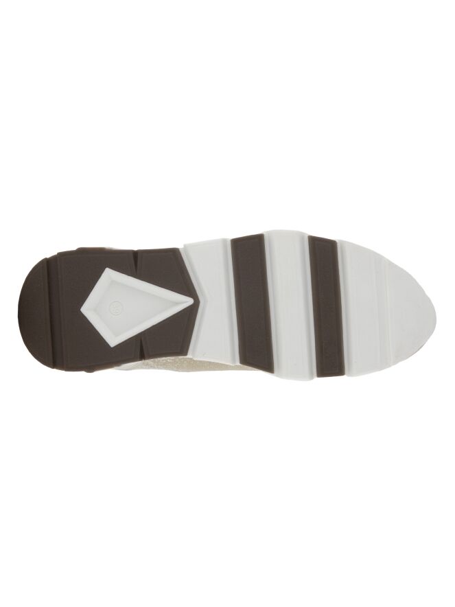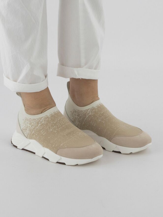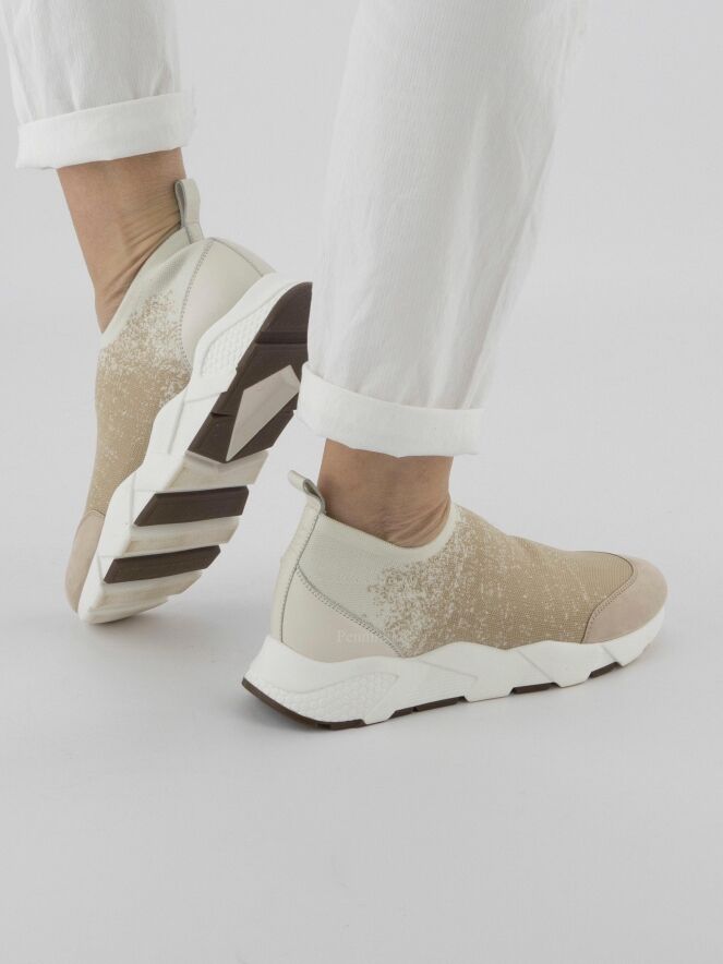 Sneaker design de la marque Peserico, à imprimé aux couleurs beige et blanc crème. Une large garniture beige en nubuck est présente sur le nez. Sur l'avant-pied et autour du pied, le tissu est élastique. Le talon est doté d'un empiècement en cuir de couleur kit. La semelle blanche présente un imprimé en relief.