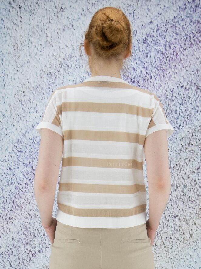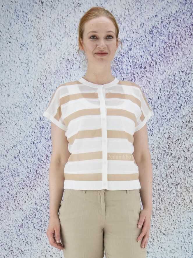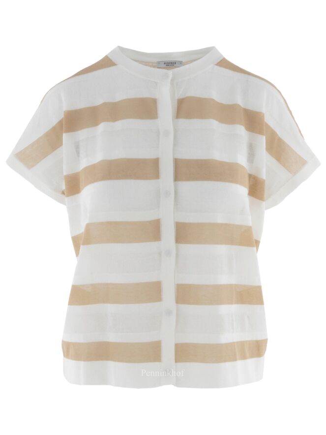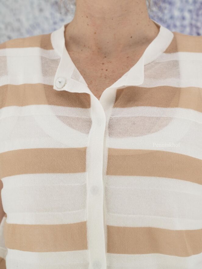 Cardigan légèrement transparent de la marque Peserico, à larges rayures beige beige sur fond blanc crème. Le cardigan présente des manches courtes. Il ferme avec une longue patte de boutonnage. Lavage à la main.