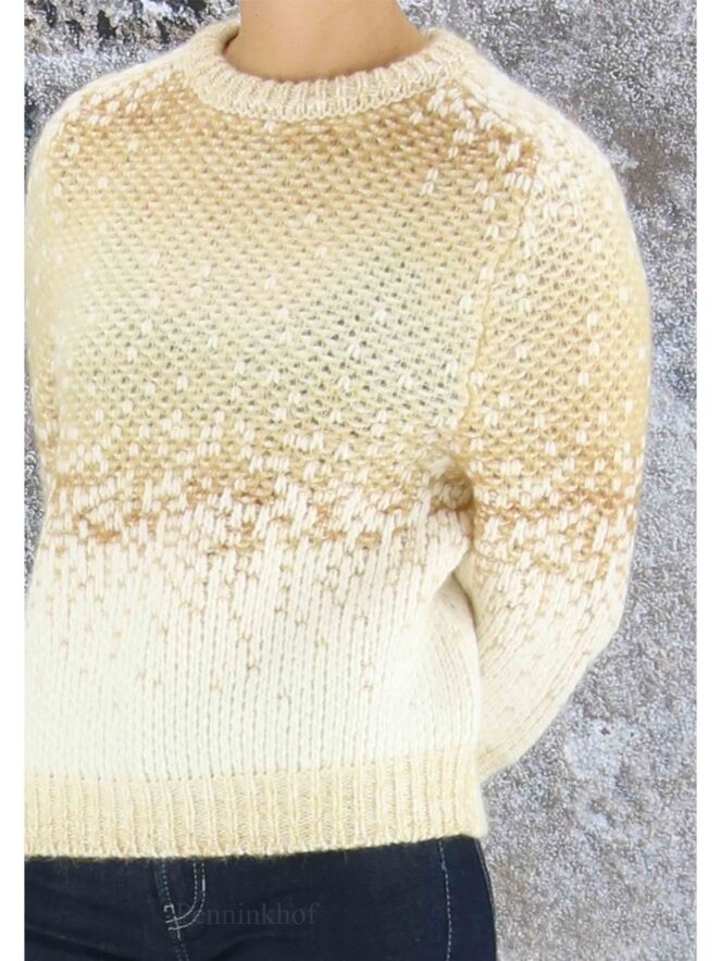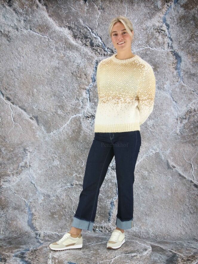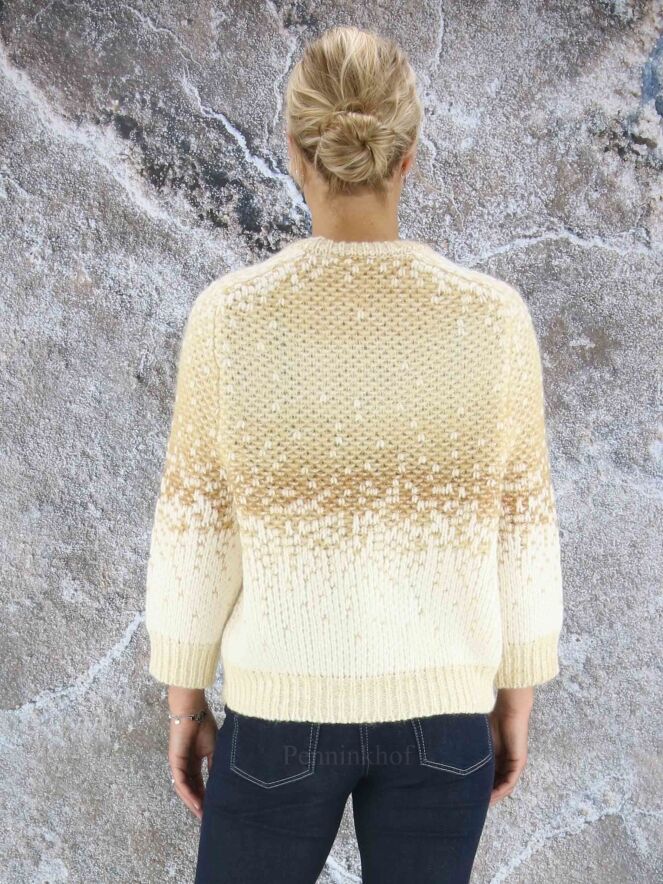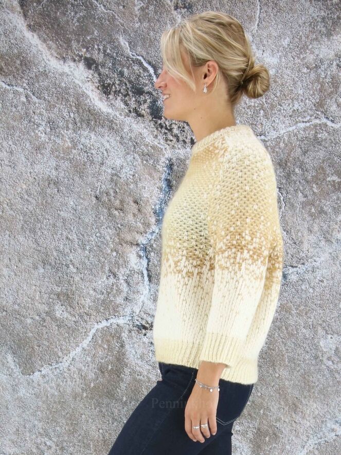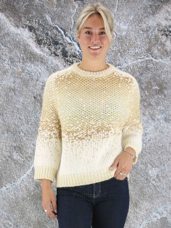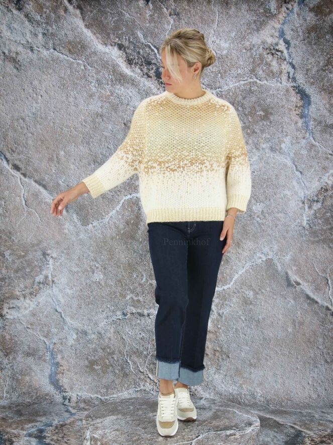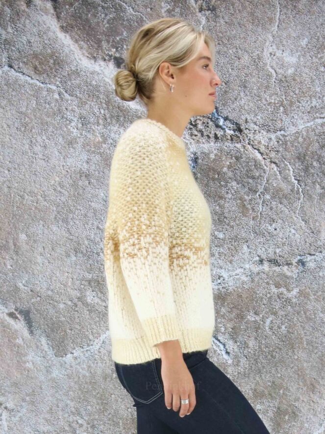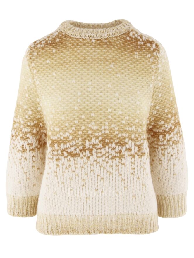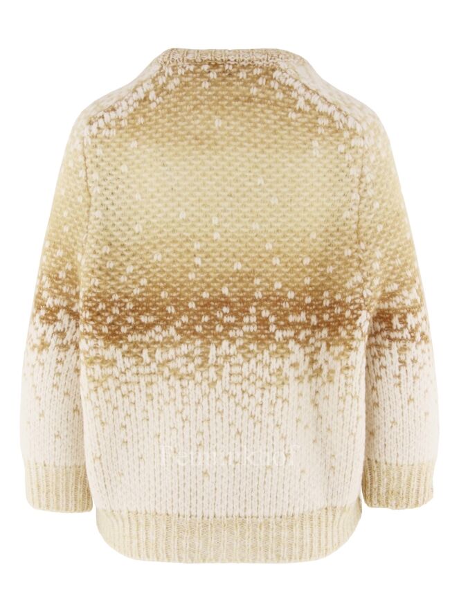 Luxueux pull en matières mélangées de la marque Peserico, imprimé d'un dégradé de couleurs chamois et blanc crème. Le pull-over est doté d'un col cheminée bas et de manches mi-longues. Lavage à la main.