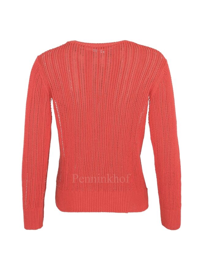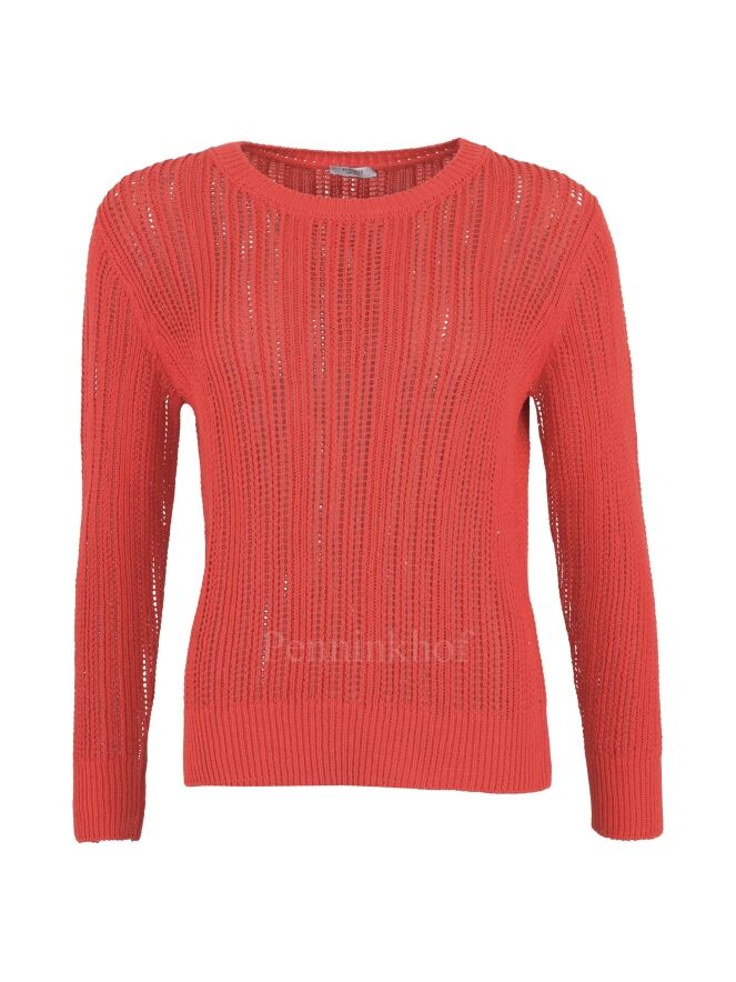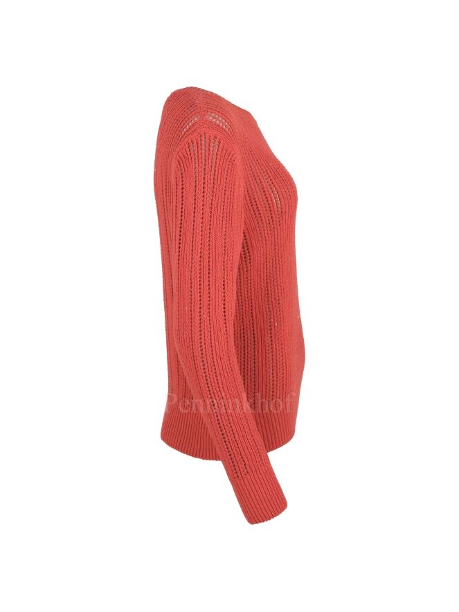 Pull-over en tricot ajouré de la marque Peserico, de couleur rouge corail. Des paillettes de la couleur du tricot sont disséminées sur le pull. L'extrémité des manches et le bas du pull sont en tricot à maille pleine. Lavage à la main.