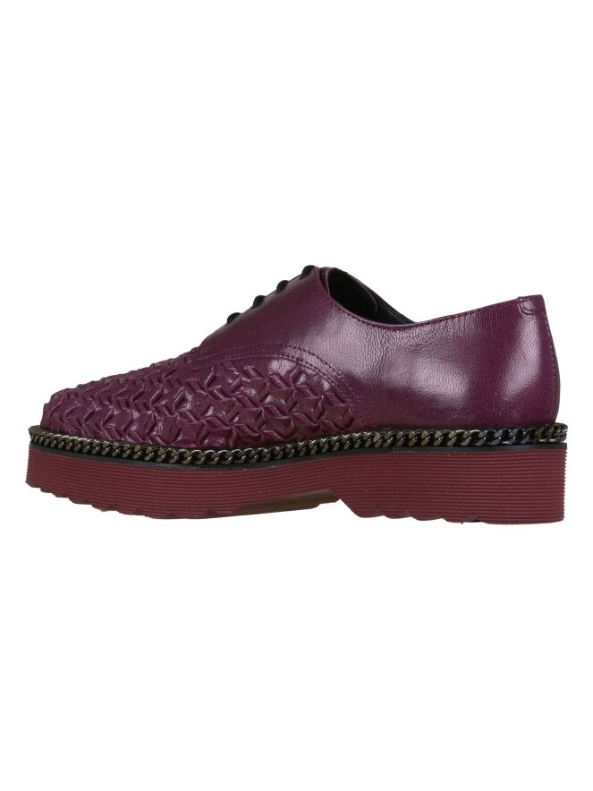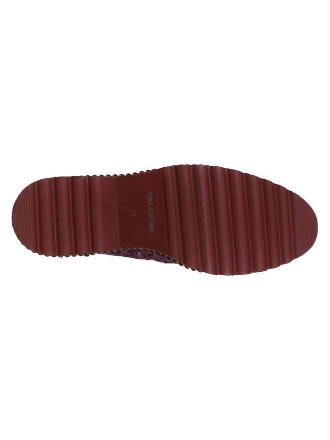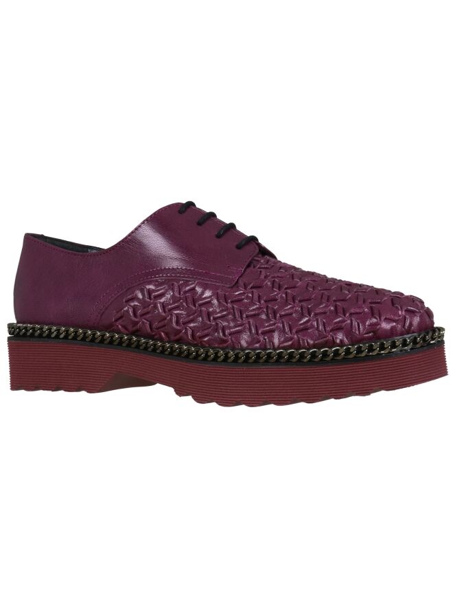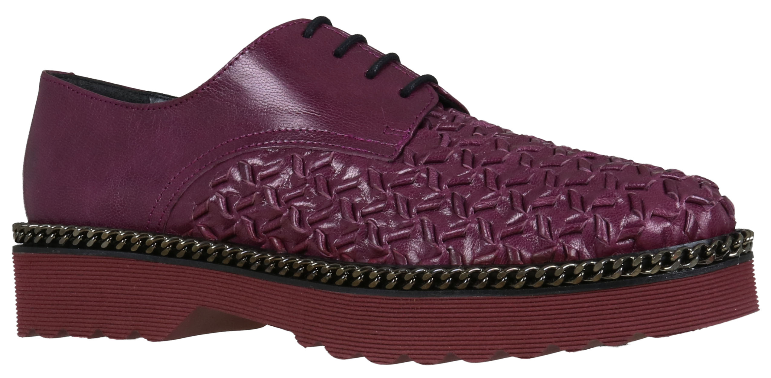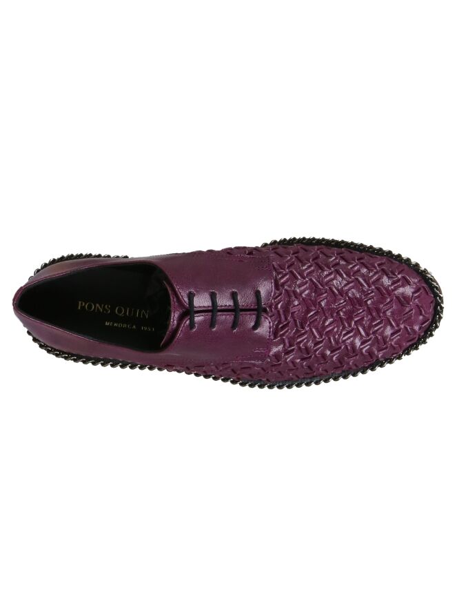Une chaussure de luxe à lacets de la marque Espagnole Pons Quintana, de couleur rouge bordeaux. Le cuir tressé décore l'avant-pied et les côtés. La partie arrière de la chaussure est en cuir nappa. Le long du bord de la semelle présente une chaîne gourmette de couleur nickel. Intérieur doublé cuir.