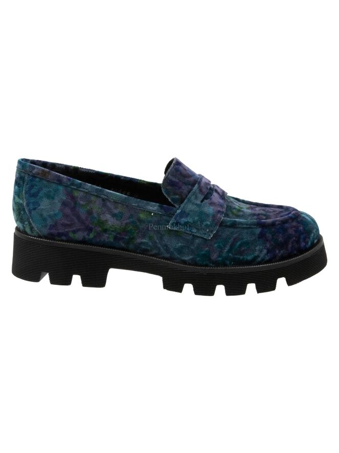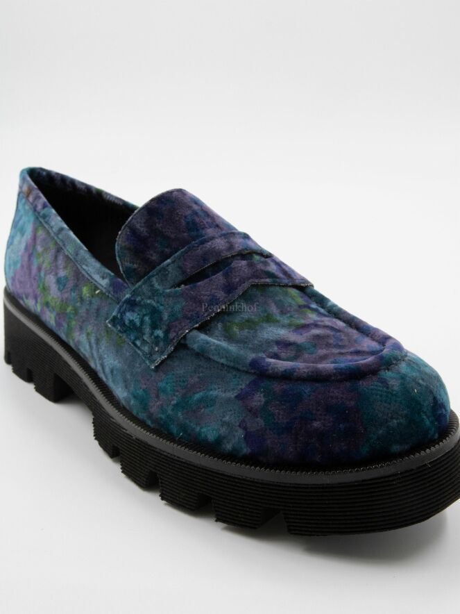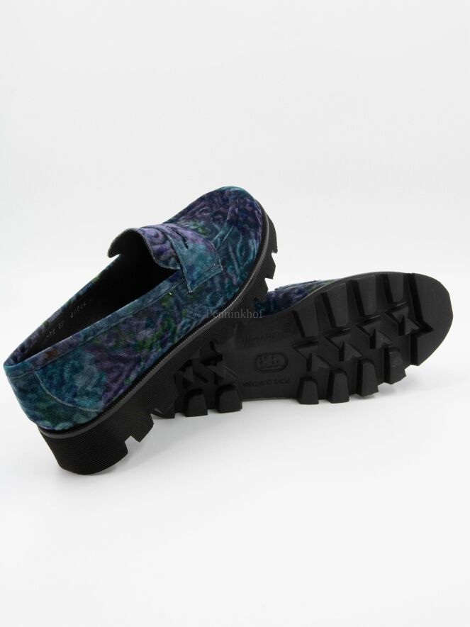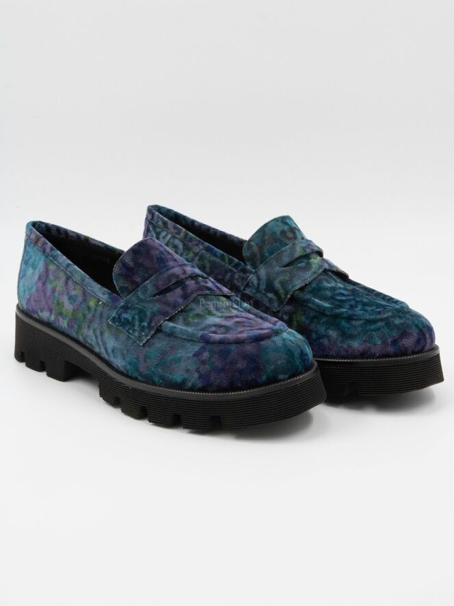 Une chaussure plate de Pons Quintana dans une quallité de velours présentant un imprimé graphique aux multiples nuances de violet, de turquoise et de vert. La semelle noire est grossièrement crantée et l'intérieur est doublé de cuir.