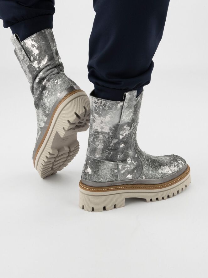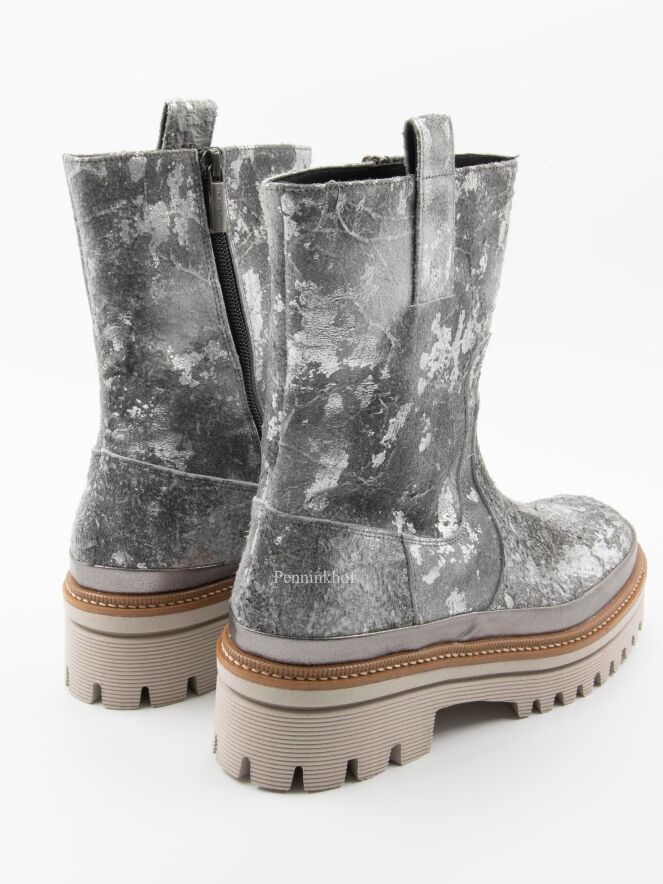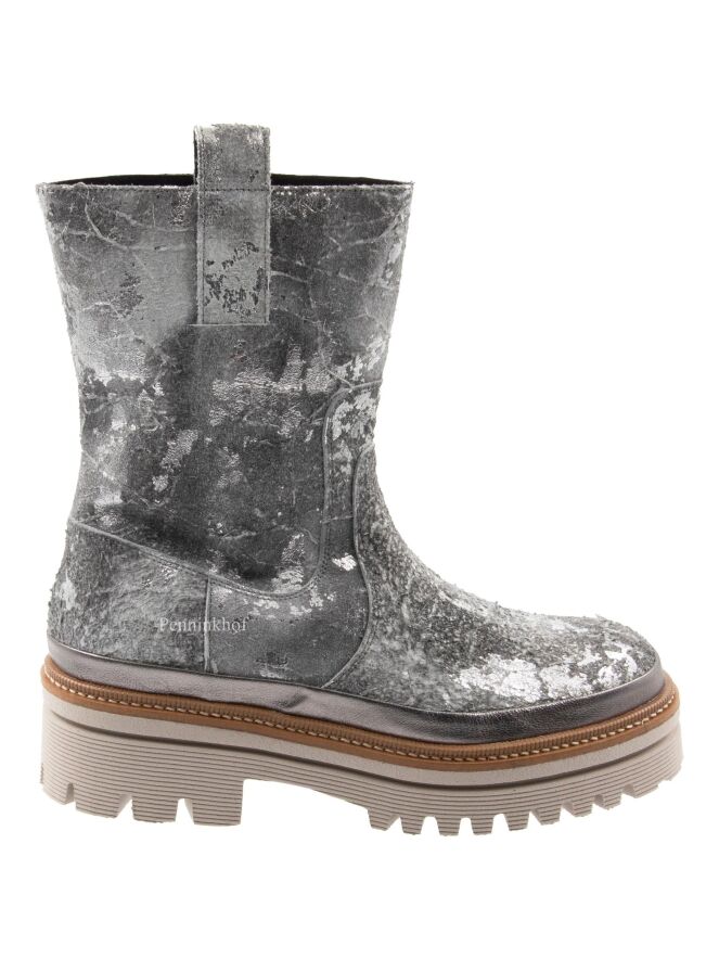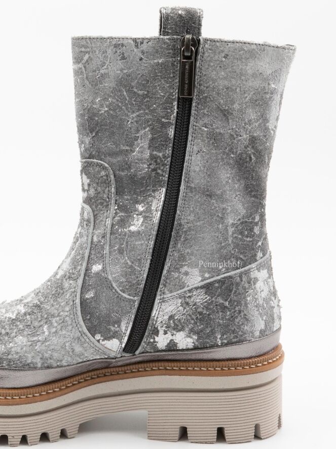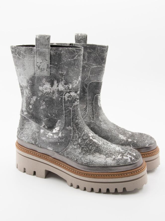 Cette botte mi-haute de Pons Quintana est réalisée en cuir éraflé avec de multiples nuances d'argent et de gris. La semelle compensée est dans plusieurs tons de gris avec une garniture de couleur camel avec une couture décorative.