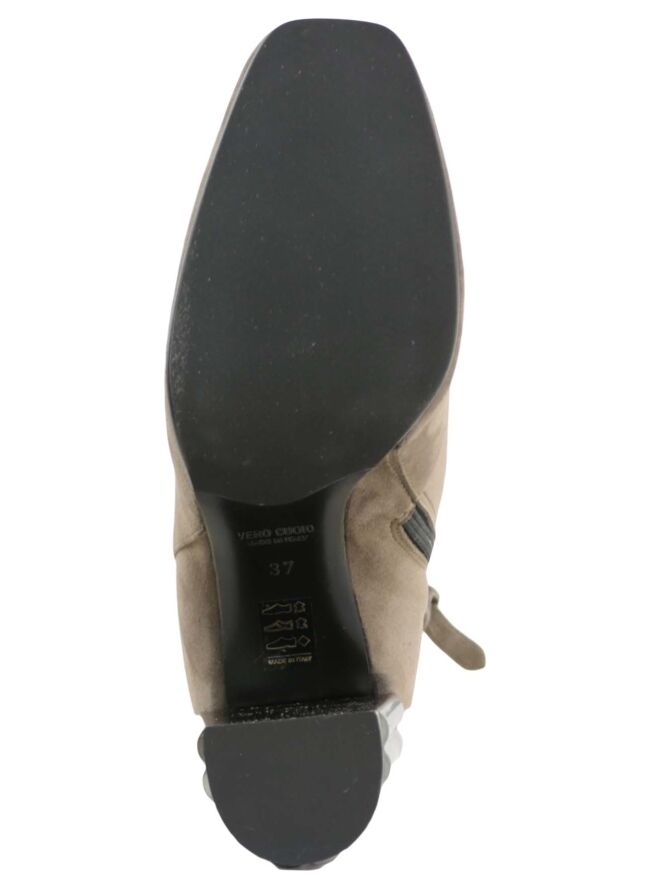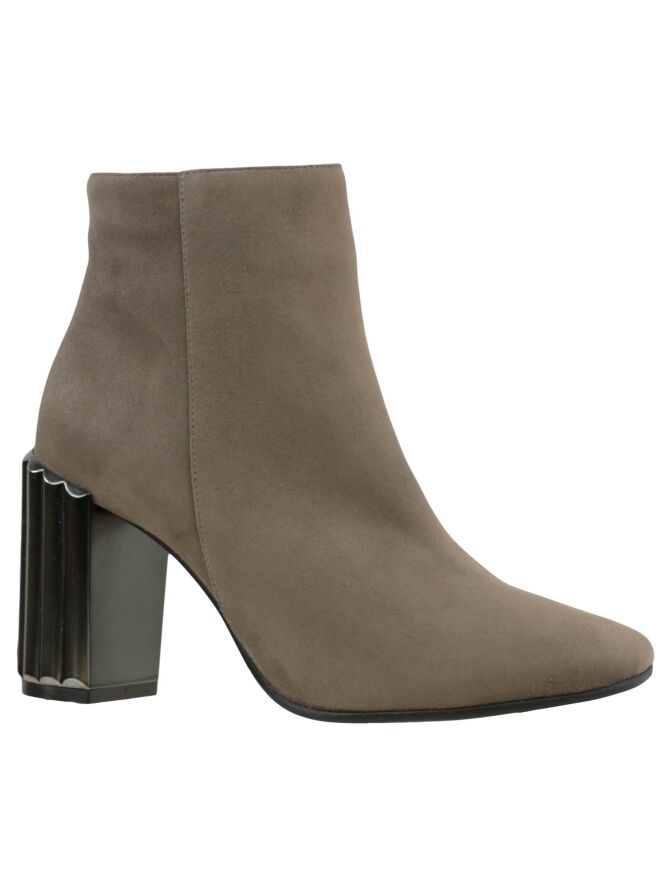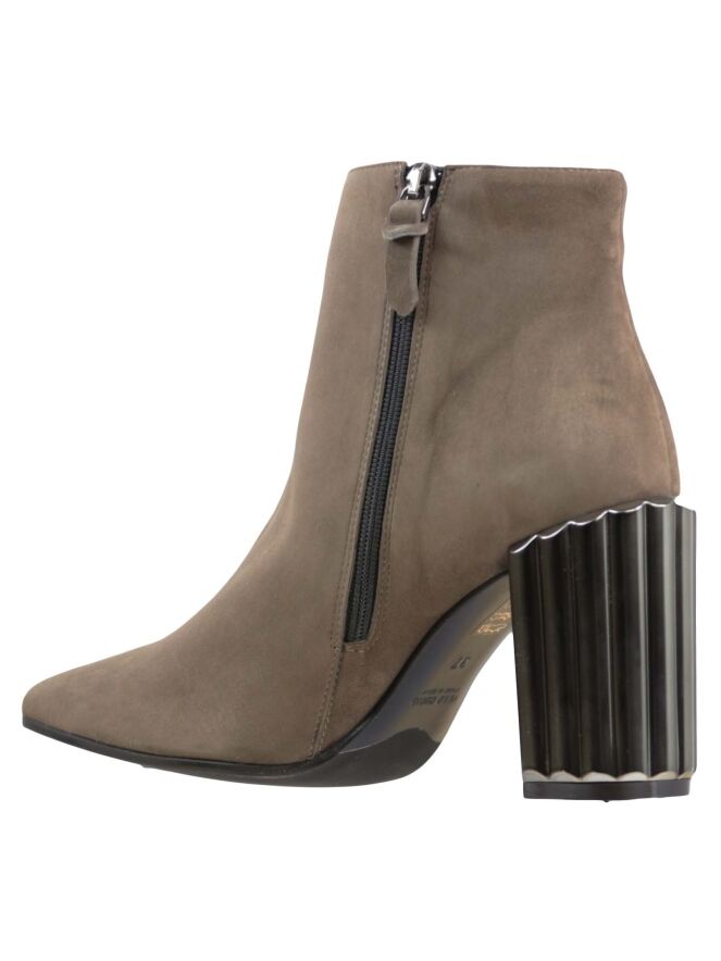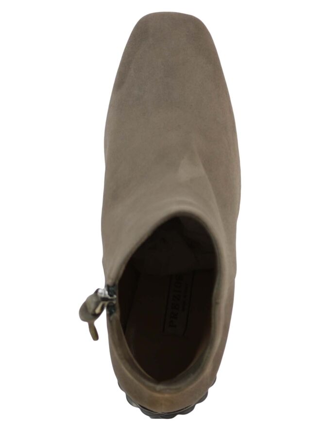 Bottine en nubuck couleur taupe, de la marque Prezioso. La bottine a un bout carré arrondi. Le talon de 8 cm est de structure décorative. La fermeture se trouve sur le côté intérieur de la bottine. Intérieur doublé cuir.