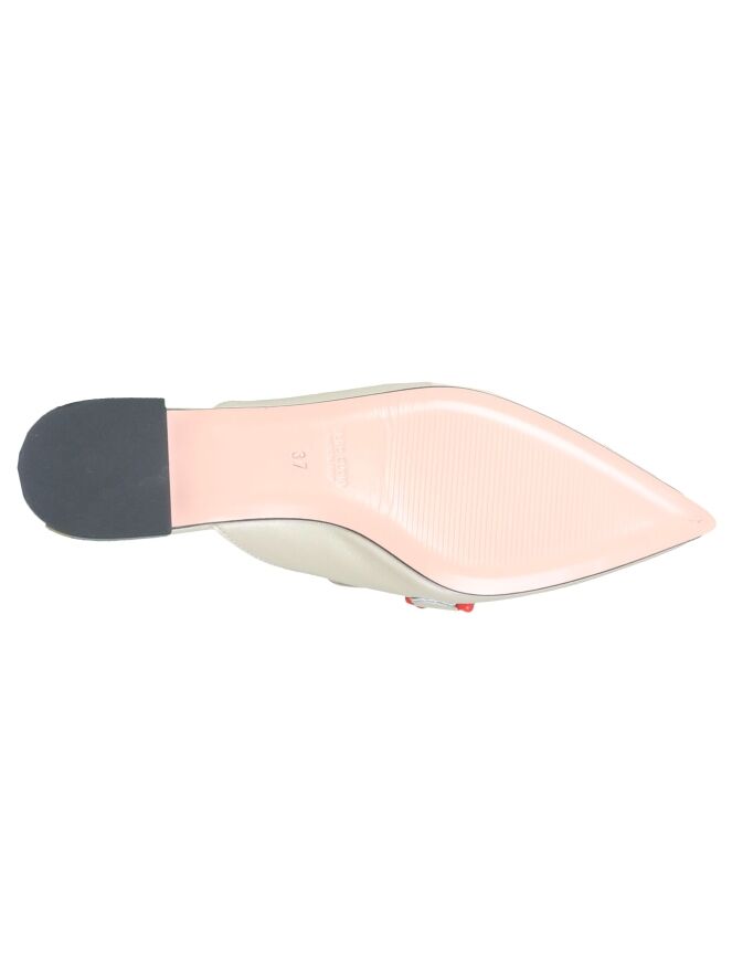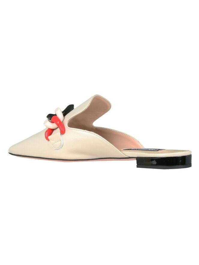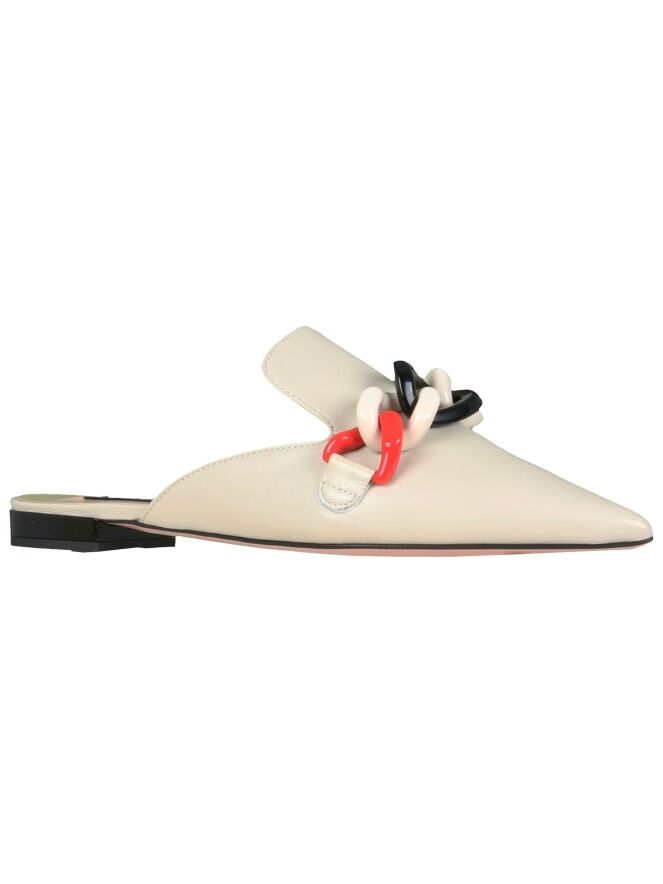 Pantoufle en cuir Nappa beige de la marque Prezioso. L'avant du pied est orné d'une chaîne à maillons grossiers aux couleurs rouge, noir et beige. Le talon est noir brillant et le dessous en cuir.