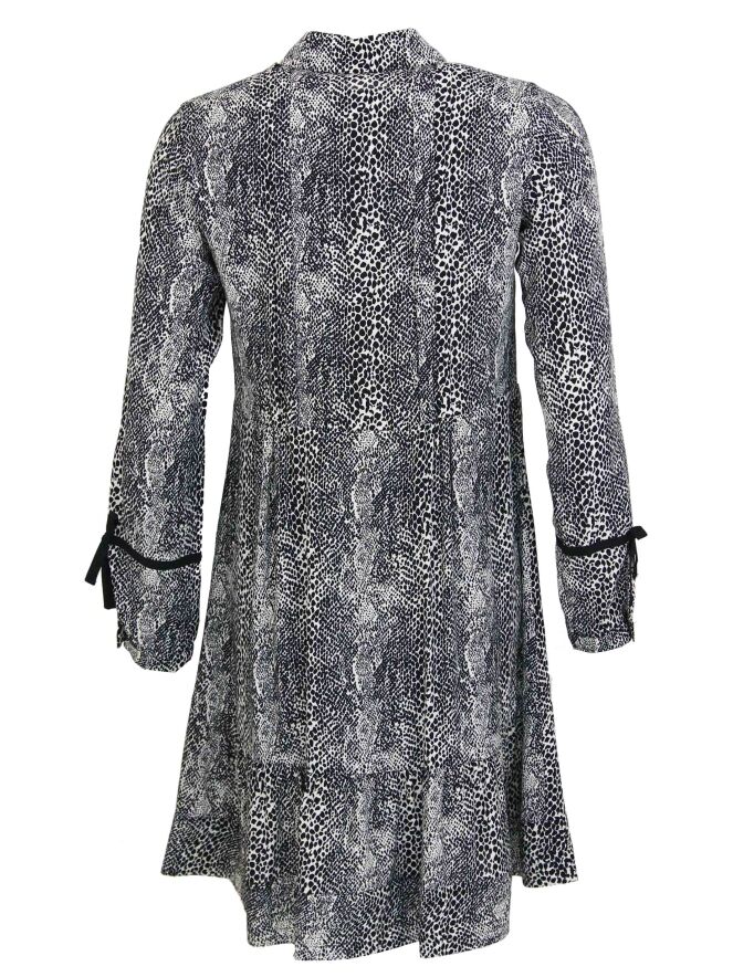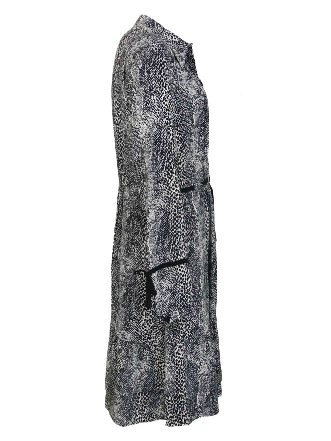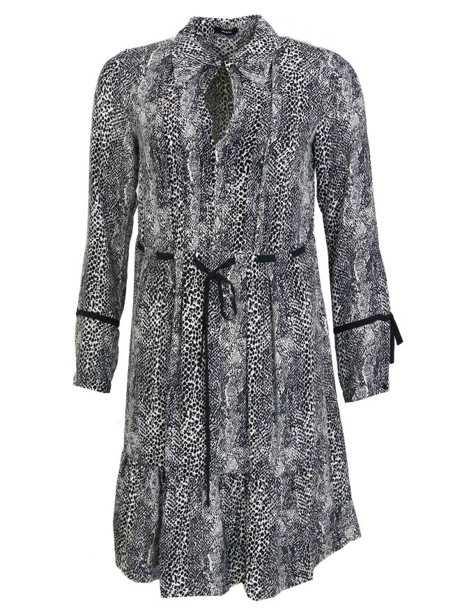 Robe légère au tombé fluide, de la marque Riani, imprimée d'un motif peau de serpent aux couleurs noir et blanc. Une fine ceinture en tissu noir apparaît en pointillé autour de la taille. Le tissu est marqué de plis fluides à l'avant comme à l'arrière. Le bas des manches est orné d'une fine bande décorative noire avec un nœud. Sous l'aisselle gauche se trouve une fermeture Eclair. Lavage à la main.
