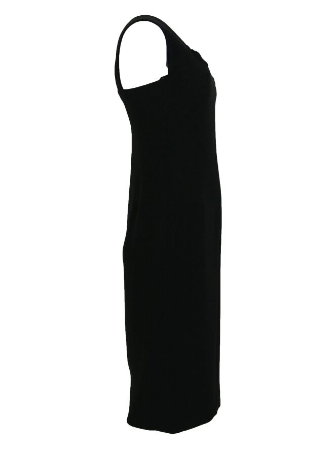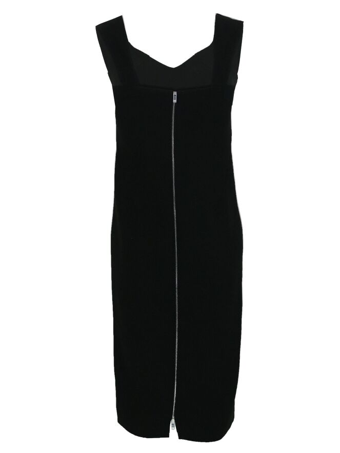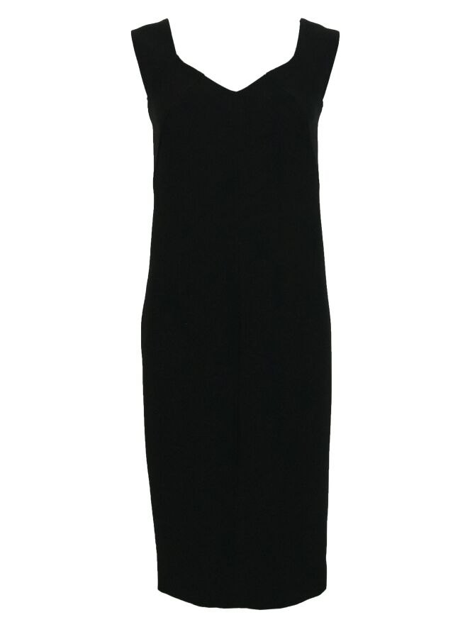 Robe droite de la marque Riani, de couleur noire. La robe est à bretelles larges de 8 cm et envolure en V avant et arrière. A l'arrière, une longue fermeture Eclair traverse la robe en son milieu. Lavage déconseillé.