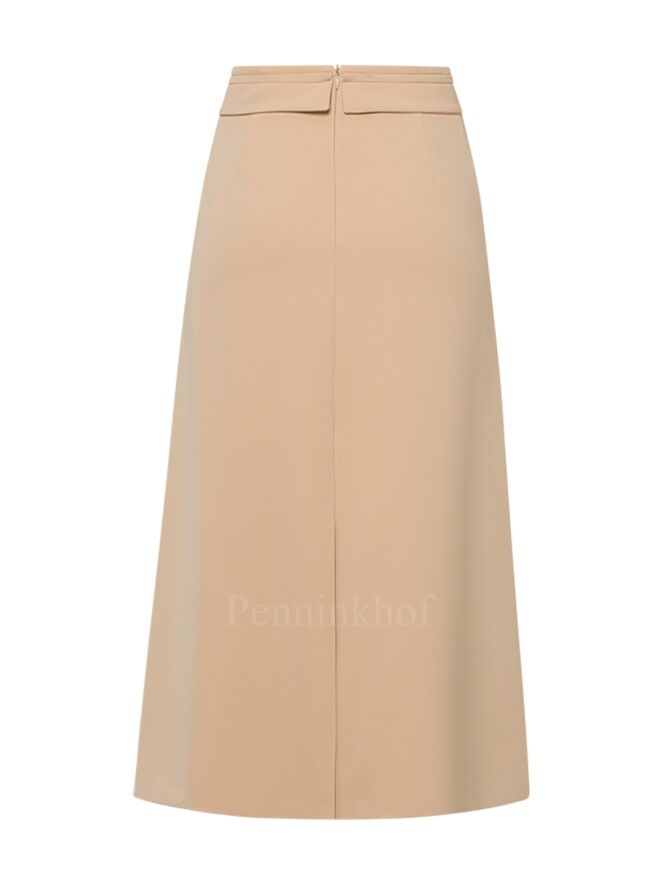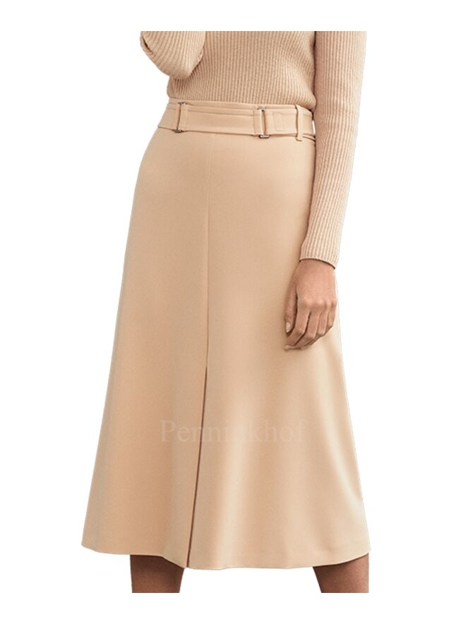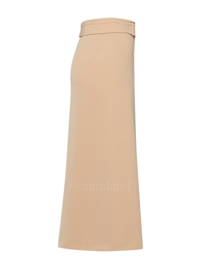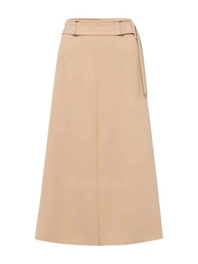 Jupe de la marque Riani de couleur sable. Sa coupe en forme de A présente une longue fente à l'avant et à l'arrière. Elle est équipée d'une large ceinture à sa taille. Lavage à la main.
