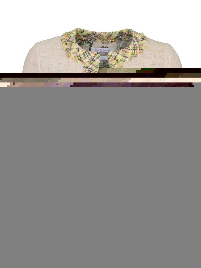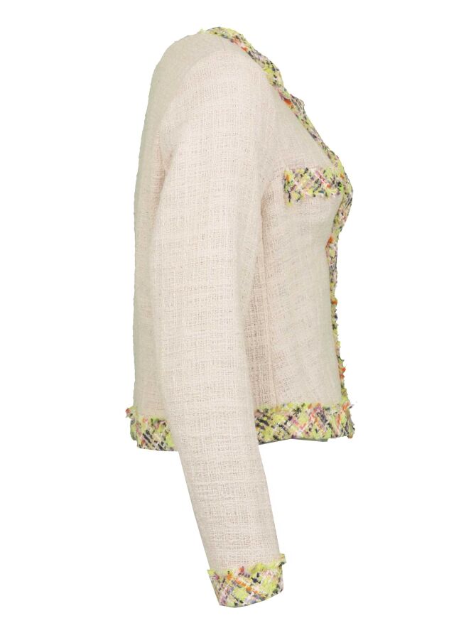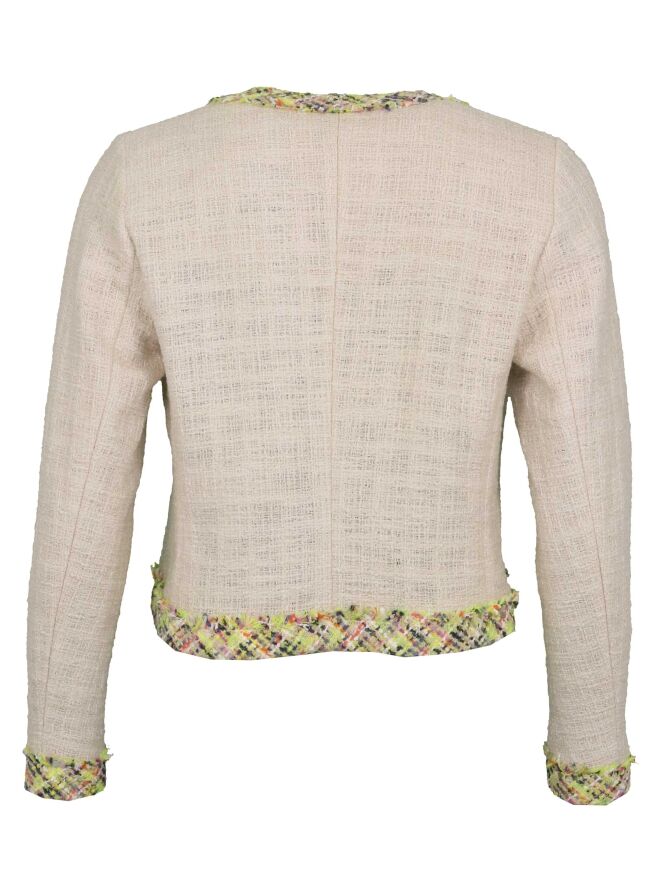 Veste courte de la marque Riani, de couleur sable. Elle est entièrement bordée d'un tissu à motif de croisillons aux couleurs fraîches et extrémités finement effilochées, motif décorant également les deux poches factices. Veste fermant à l'aide de 3 boutons-pression. Modèle non doublé. Lavage déconseillé.