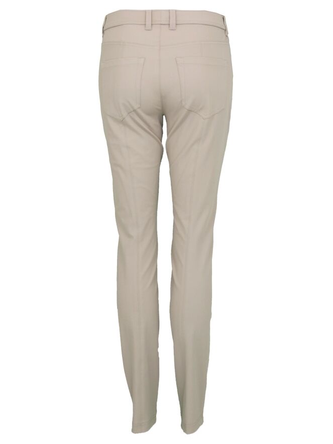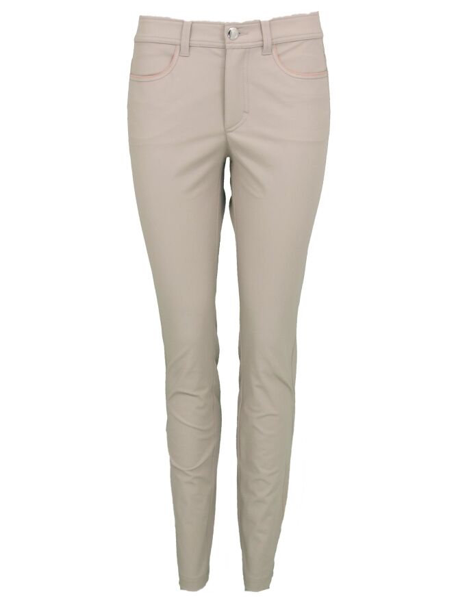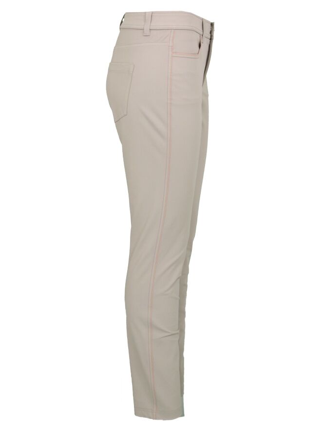 Pantalon de coupe ajustée près du corps, de la marque Riani, de couleur kaki pastel. De fines coutures orange décorent les deux poches avant et les côtés des jambes. Lavage à 30 degrés.