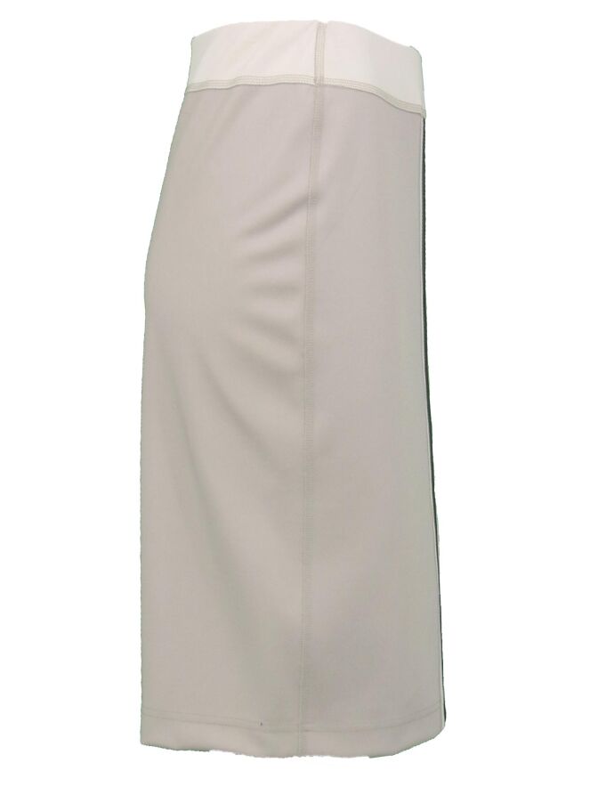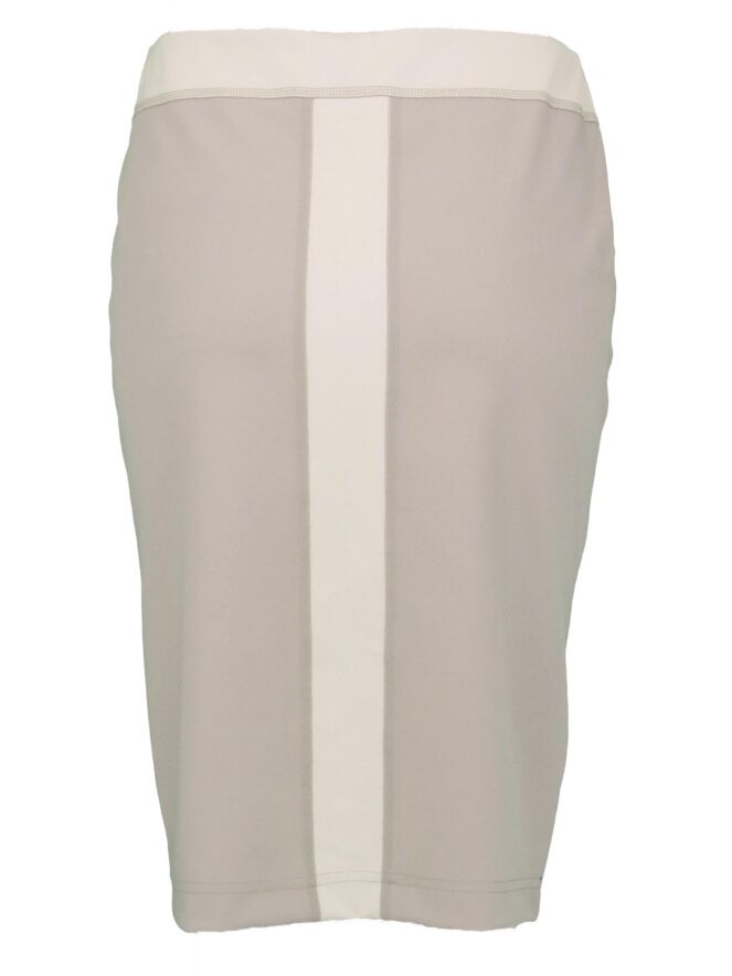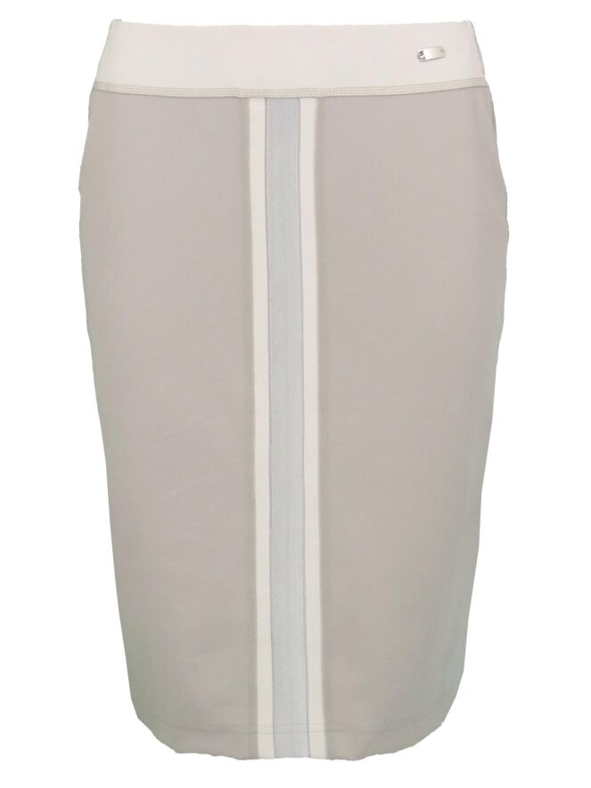 Jupe crayon tombant au-dessus du genou, de la marque Riani, de couleur kaki pastel et sable. De larges bandes centrales traversent l'avant et l'arrière, dans une couleur plus claire et métallisée à l'avant. A la taille, un élastique de 4 cm lui donne un grand confort. Modèle doublé. Lavage à 30 degrés.