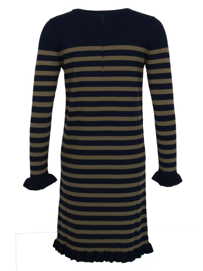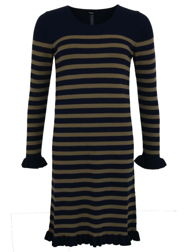 Robe de la marque Riani, à larges rayures de couleurs bleu marine et kaki. Les extrémités des manches longues et le bas de la robe présentent un ourlet généreusement froufroutant. Lavage à la main.