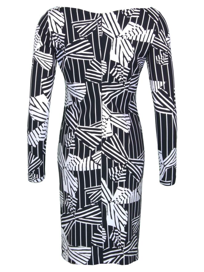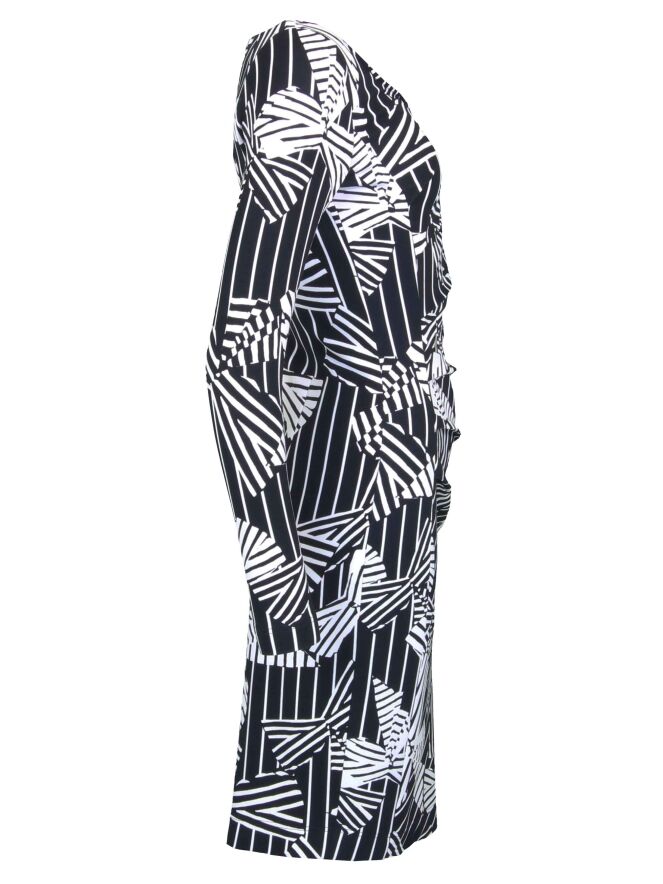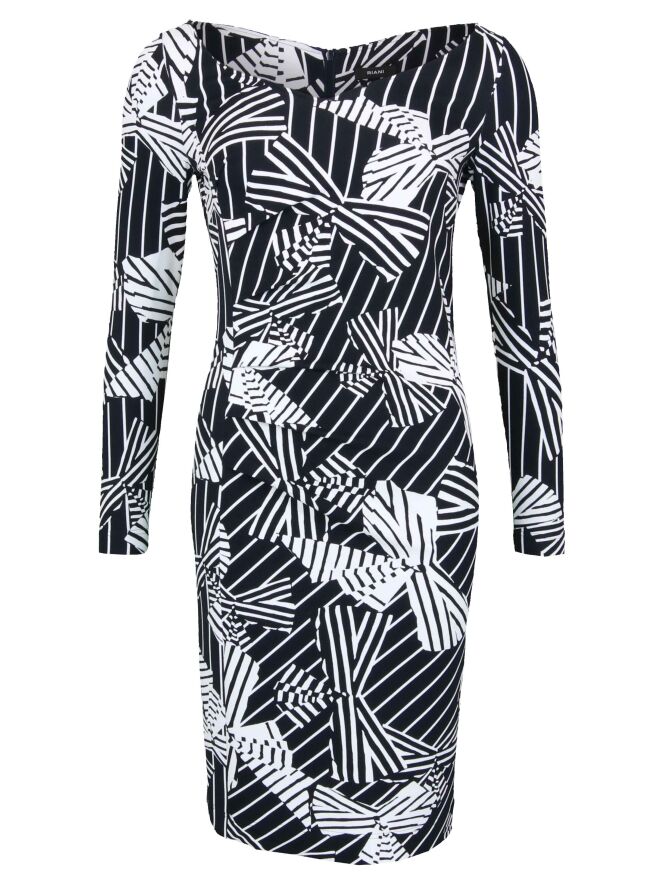 Robe à large col de la marque Riani, imprimée d'un motif graphique de nœuds dans les couleurs bleu marine et blanches. Sur le côté droit, un effet drapé est apporté par plusieurs plis à la taille. Lavage déconseillé.
