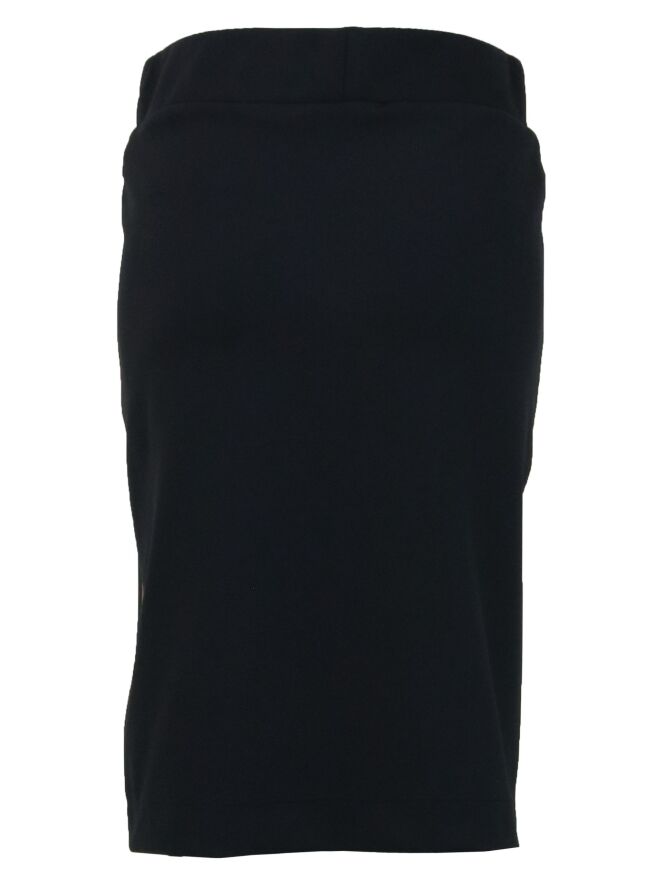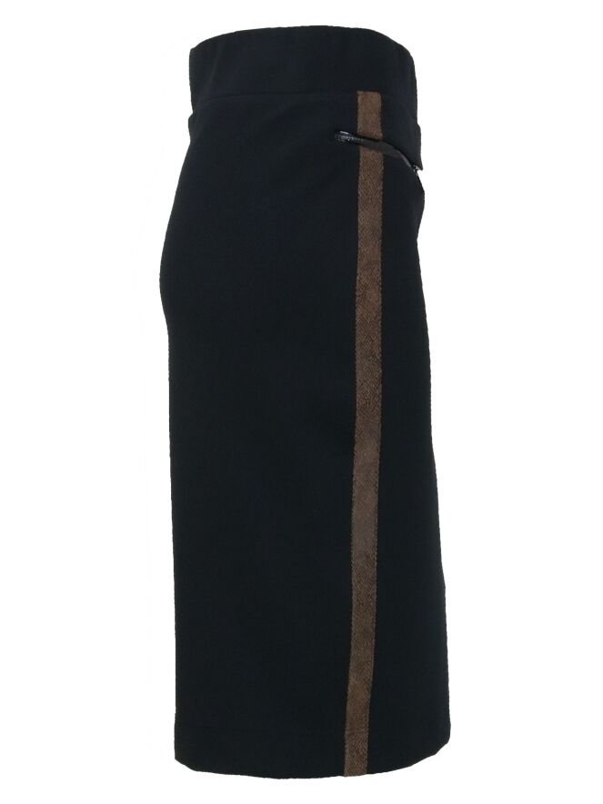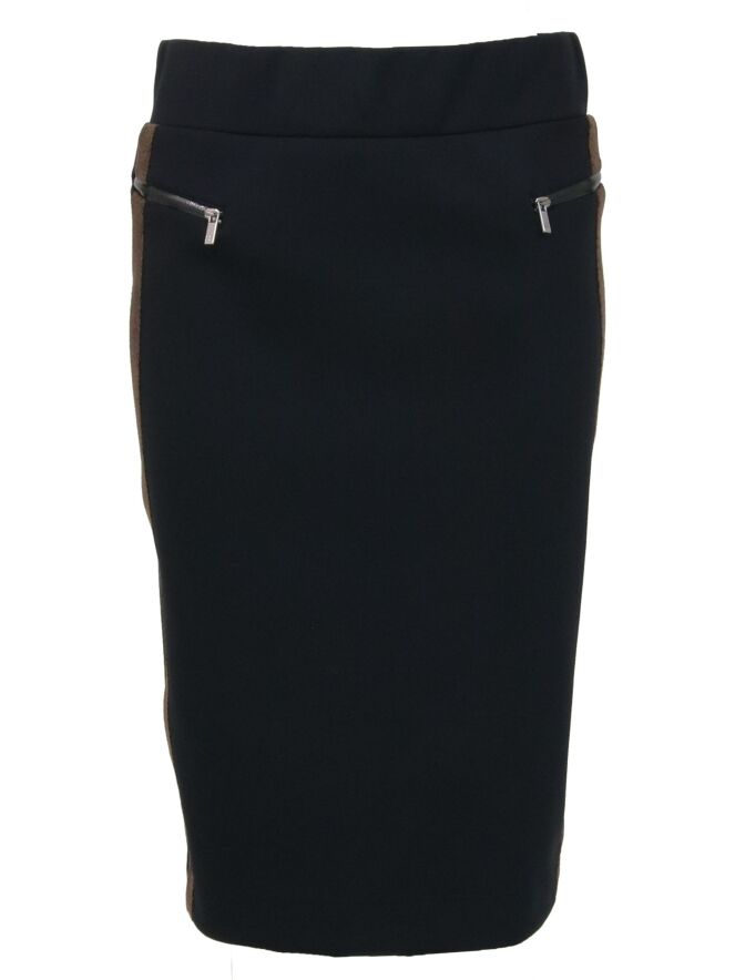 Jupe tombant sous le genou de couleur noire, de la marque Riani. Elle est équipée d'un large élastique à la taille. Sur le devant, 2 élégants zip à bordure en laque de couleur noire. Une bande à imprimé reptile marron orne les côtés. La jupe est non doublée et peut être lavée à la main.