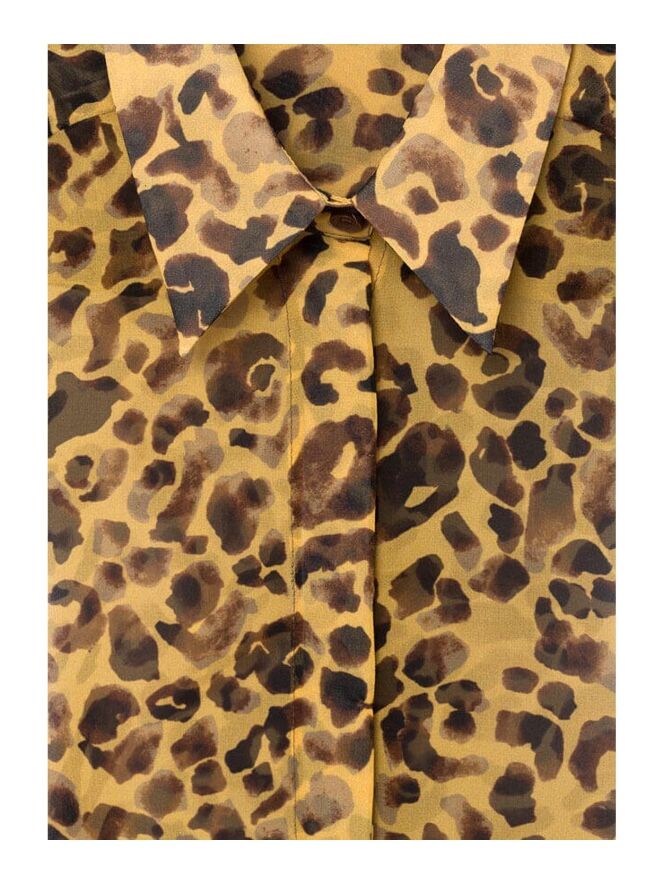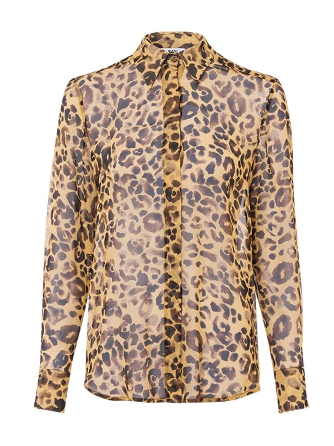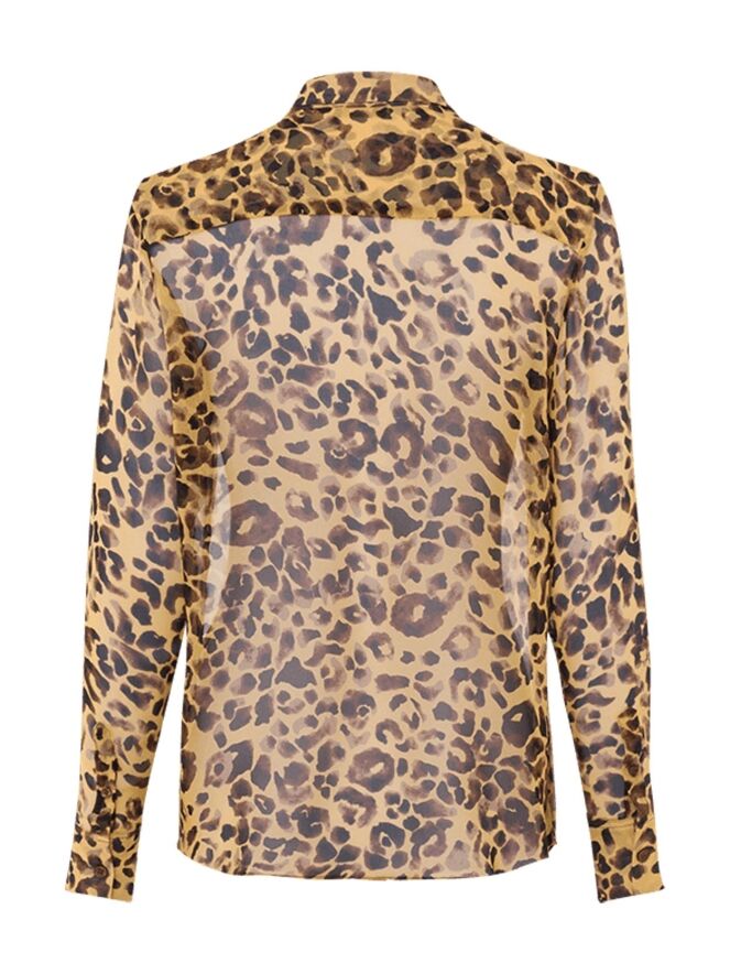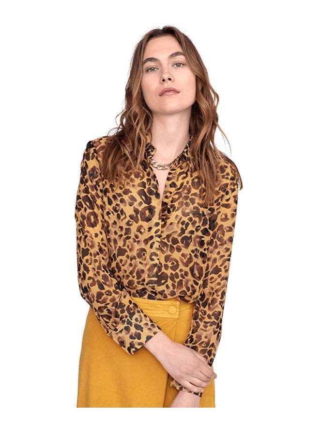 Luxueux chemisier en soie transparent de la marque Riani, imprimé d'un motif léopard aux couleurs noir et nuancées du marron sur un fond ocre jaune. Lavage à la main.