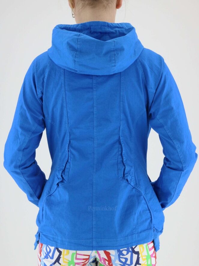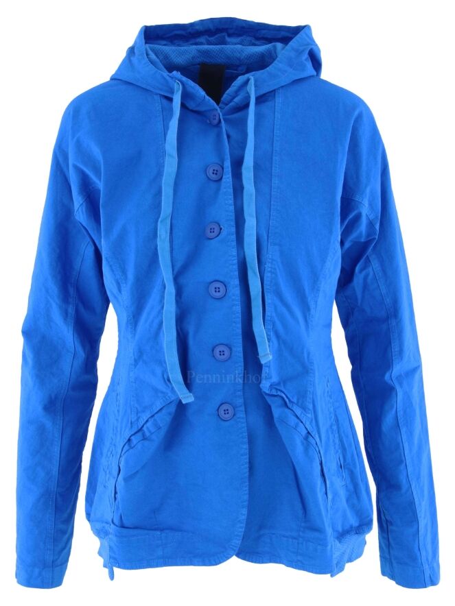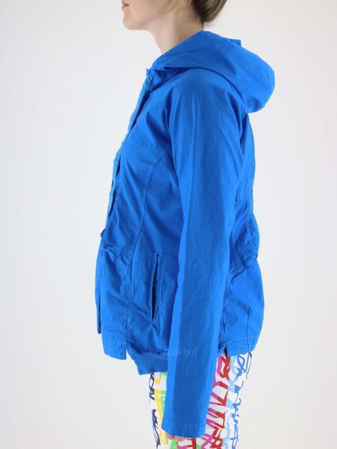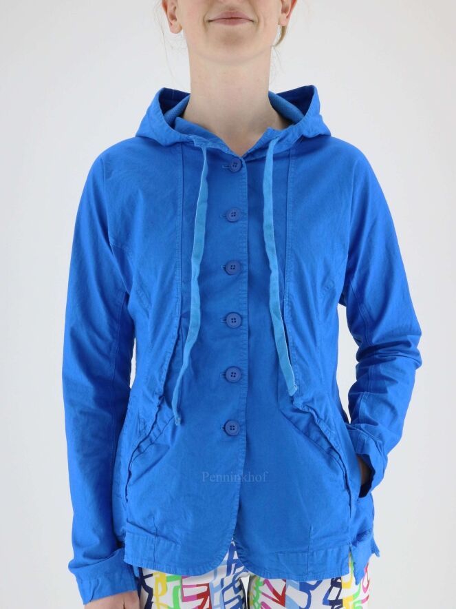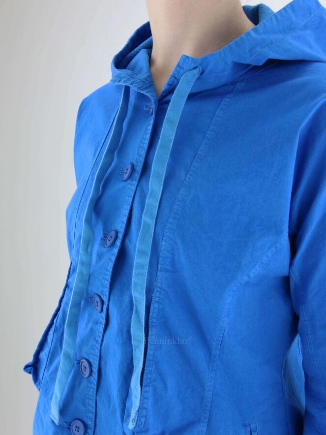 Veste à capuche de la marque Rundholz black label, de couleur bleue. La veste se ferme à l'aide de six boutons. Une bande en mesh dépasse au bas des côtés. La veste s'élargit à partir de la taille et présente des poches latérales en fente. La veste n'est pas doublée et peut être lavée à 30 degrés.