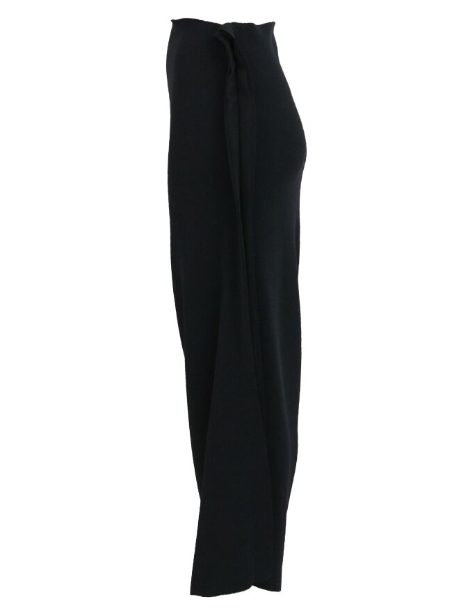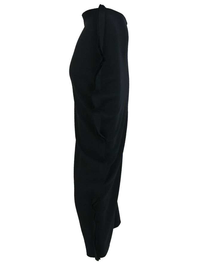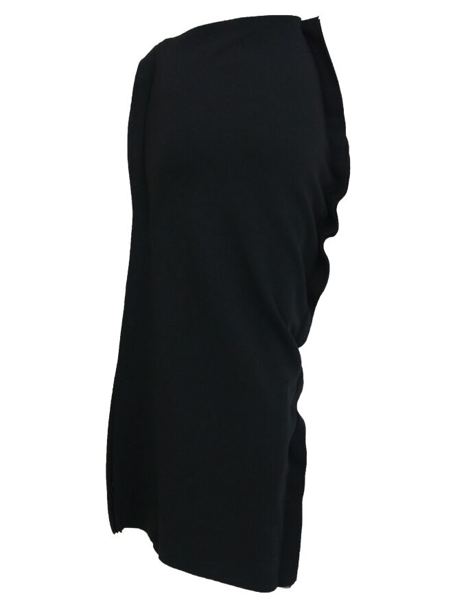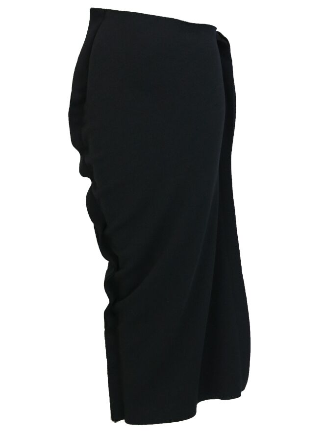 Longue jupe chaude de couleur noire, de la marque Rundholz. Tissu cousu de manière inversée sur le côté gauche de la jupe ainsi qu’un bel effet de plissé sur tout le côté droit. Lavage déconseillé.