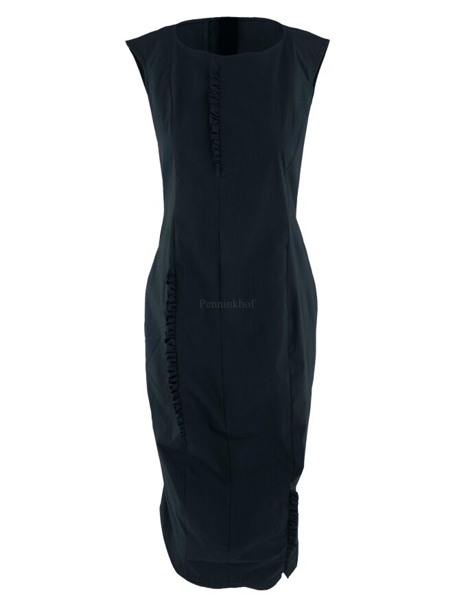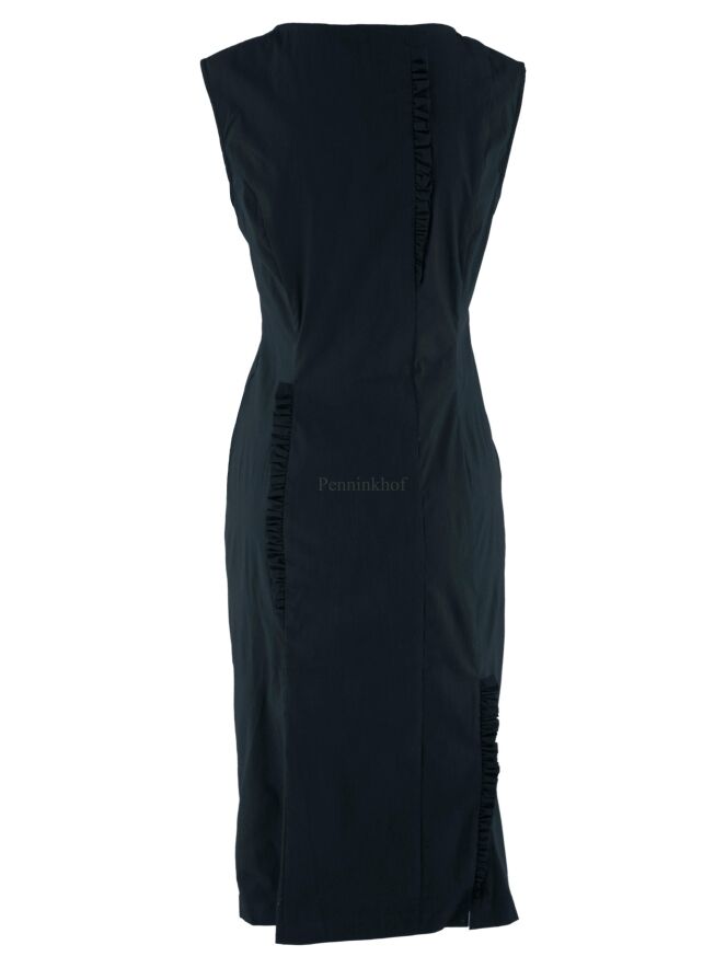 Robe de la marque noire Rundholz, de couleur bleu pétrole. Des passepoils smockés sont présents à plusieurs endroits le long des coutures sur le devant et dans le dos. Cette robe peut être lavée à 30 degrés.