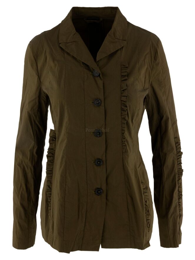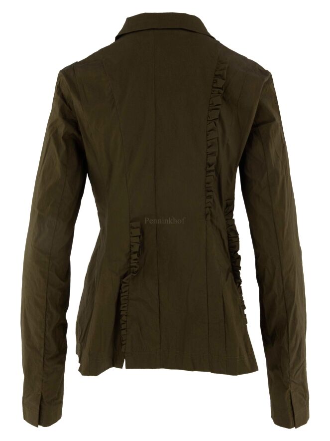 Veste de la marque noire Rundholz, de couleur vert olive. Il y a des passepoils smockés à plusieurs endroits le long des coutures sur le devant et dans le dos.Au niveau de la taille, il y a des poches fendues et le blazer n'est pas doublé. Cette veste peut être lavée à 30 degrés.