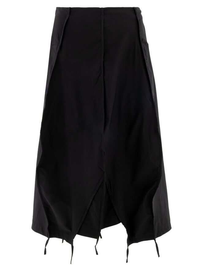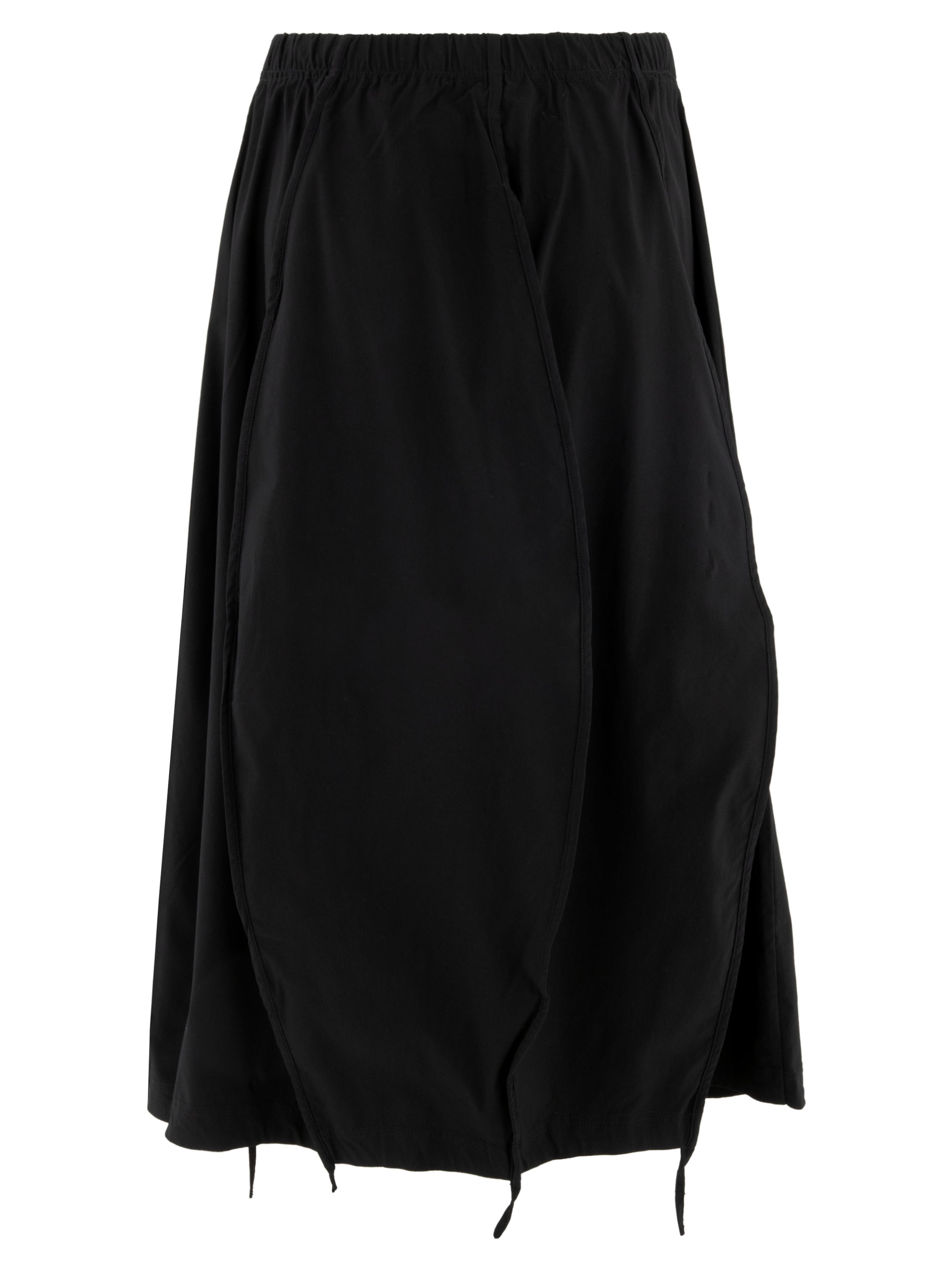 Jupe de Rundholz Black Label en noir. La taille est dotée d’une ceinture élastique finement plissée, offrant confort et silhouette subtilement féminine. La jupe s’évase légèrement vers le bas en une forme ballon discrète. Trois coutures inversées avec galon sont placées à l’avant comme à l’arrière, dont une petite partie dépasse sous l’ourlet sous forme de ruban délicat. Des poches latérales sont intégrées juste sous la ceinture. Non doublée, cette jupe de créateur exclusive peut être lavée à 30 degrés.