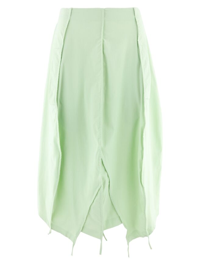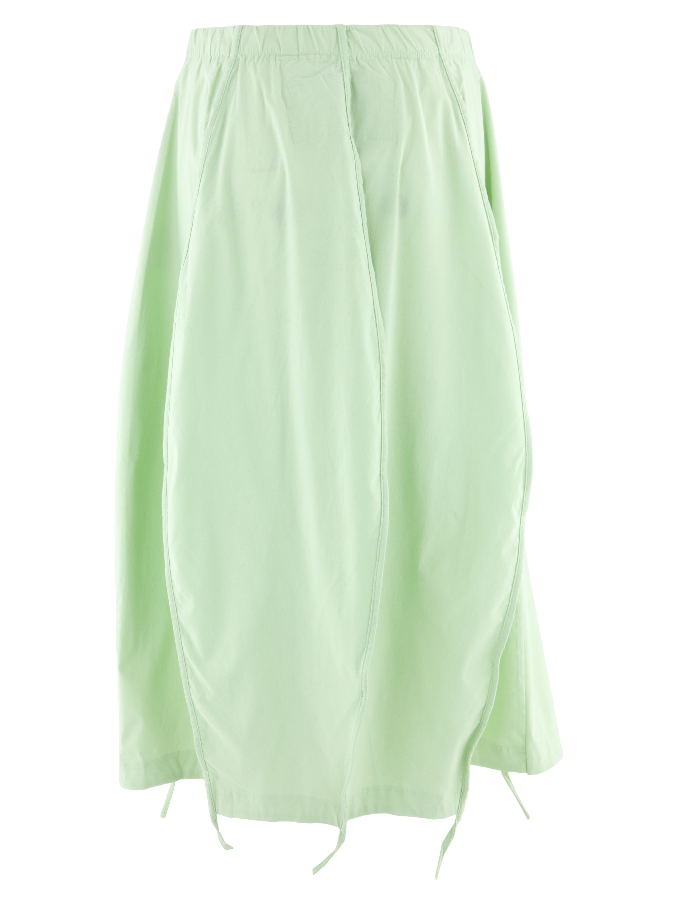 Jupe de Rundholz Black Label dans une teinte vert pistache fraîche. La ceinture élastique finement plissée offre un ajustement confortable et féminin. La silhouette se termine par une légère forme ballon vers le bas. Trois coutures inversées avec galon sont présentes à l’avant comme à l’arrière, dont l’une se prolonge légèrement sous l’ourlet en un court ruban pour une touche originale. Des poches sont intégrées sous la ceinture. La jupe est non doublée et peut être lavée à 30 degrés.