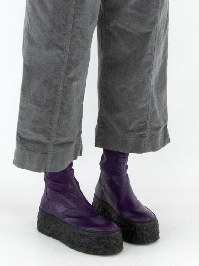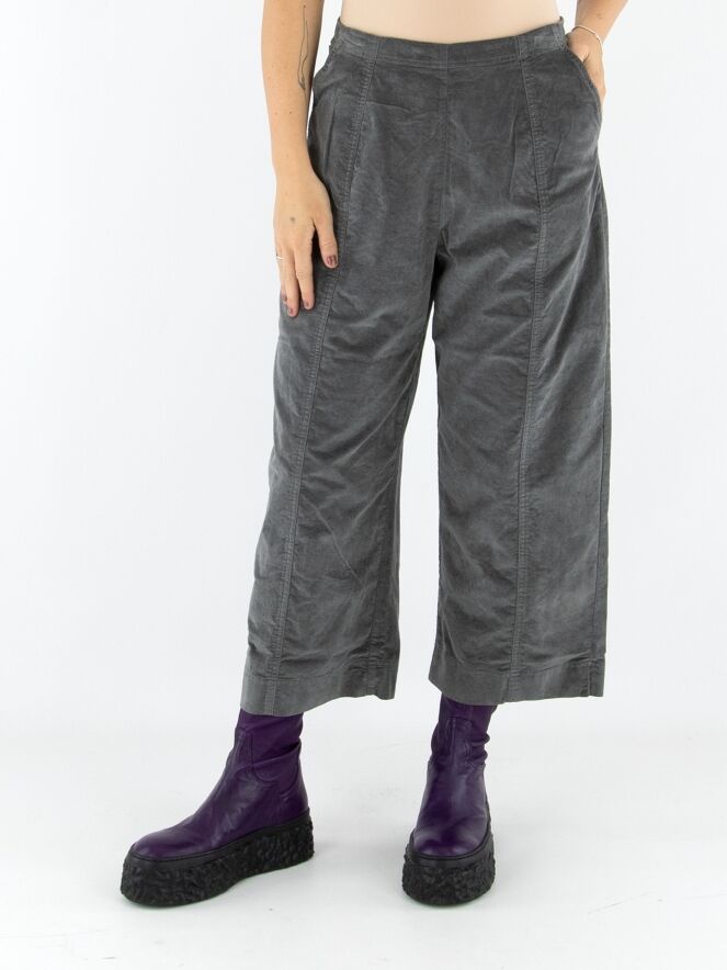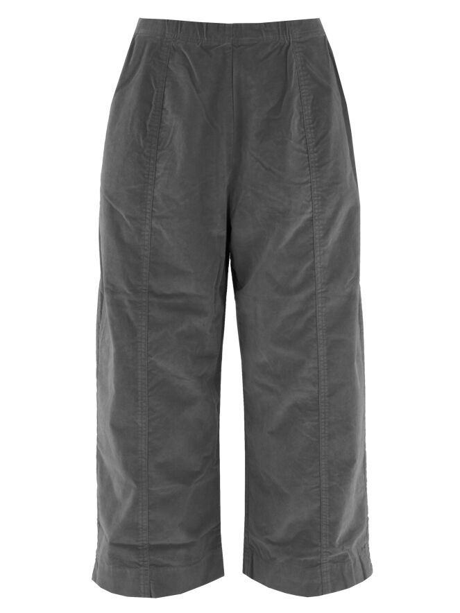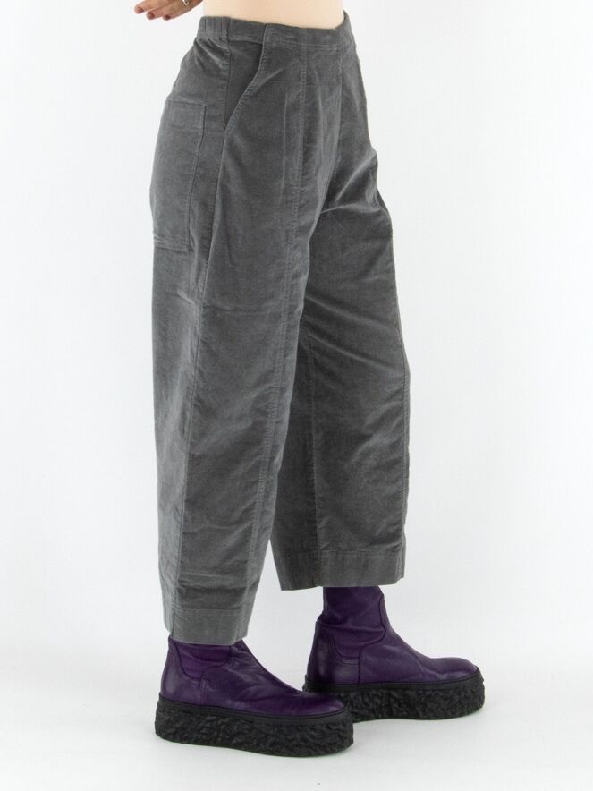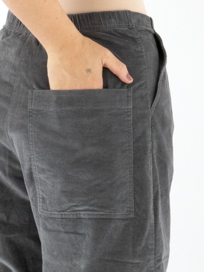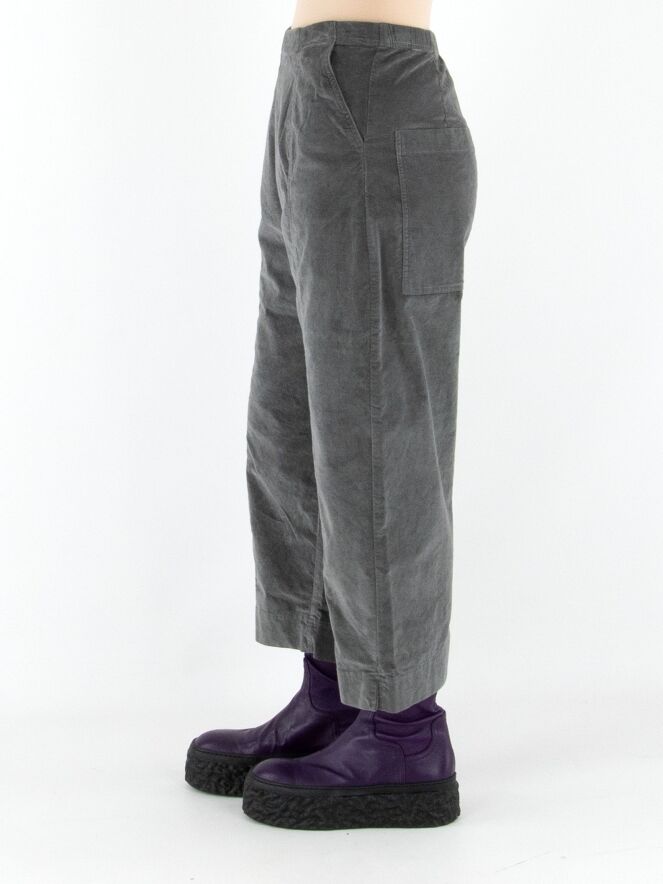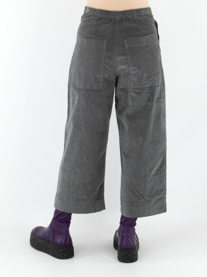 Un pantalon en velours à coupe droite de Rundholz Black Label en gris. La taille est élastiquée. Le pantalon possède des poches latérales et peut être lavé à 30 degrés.