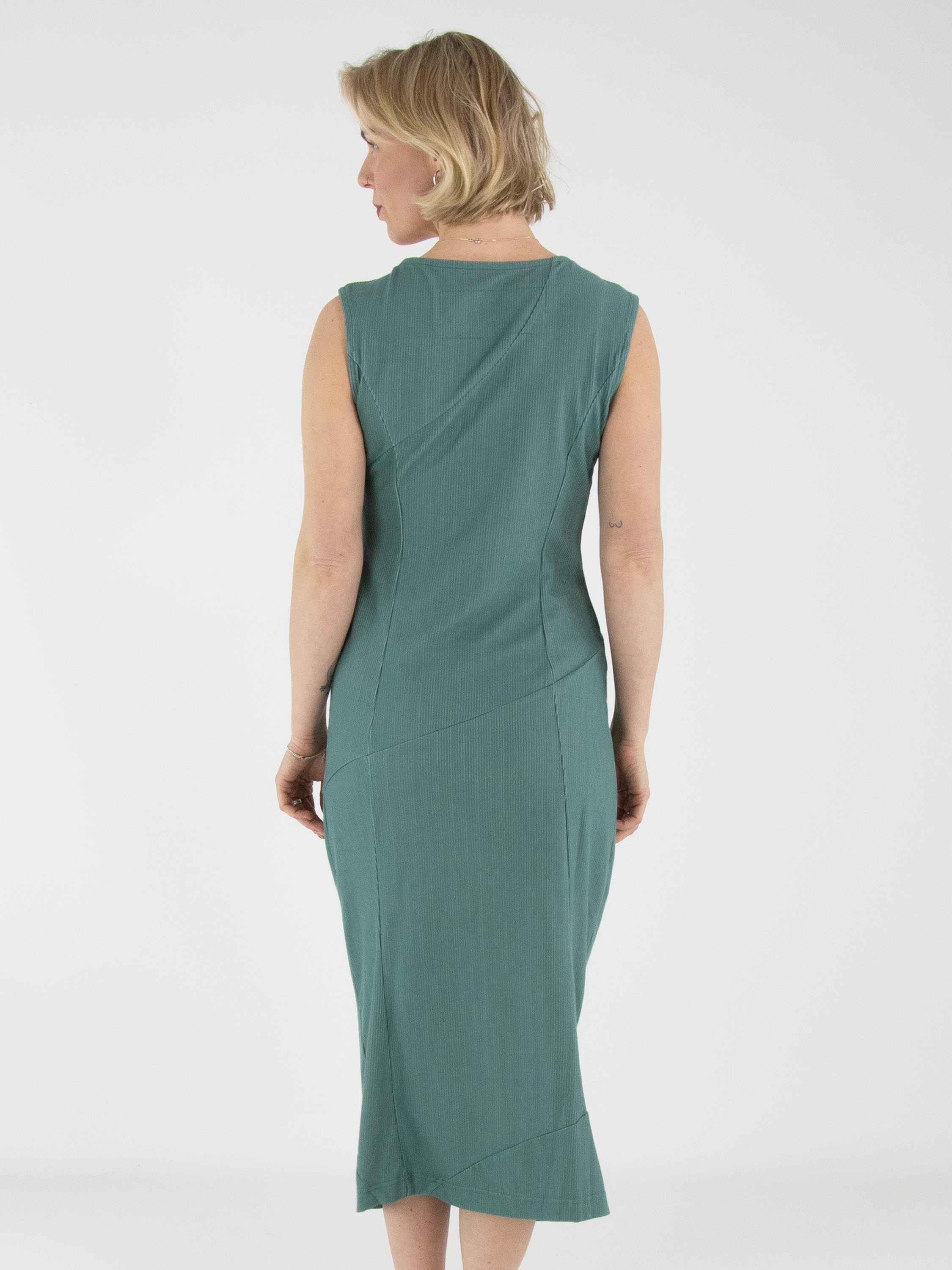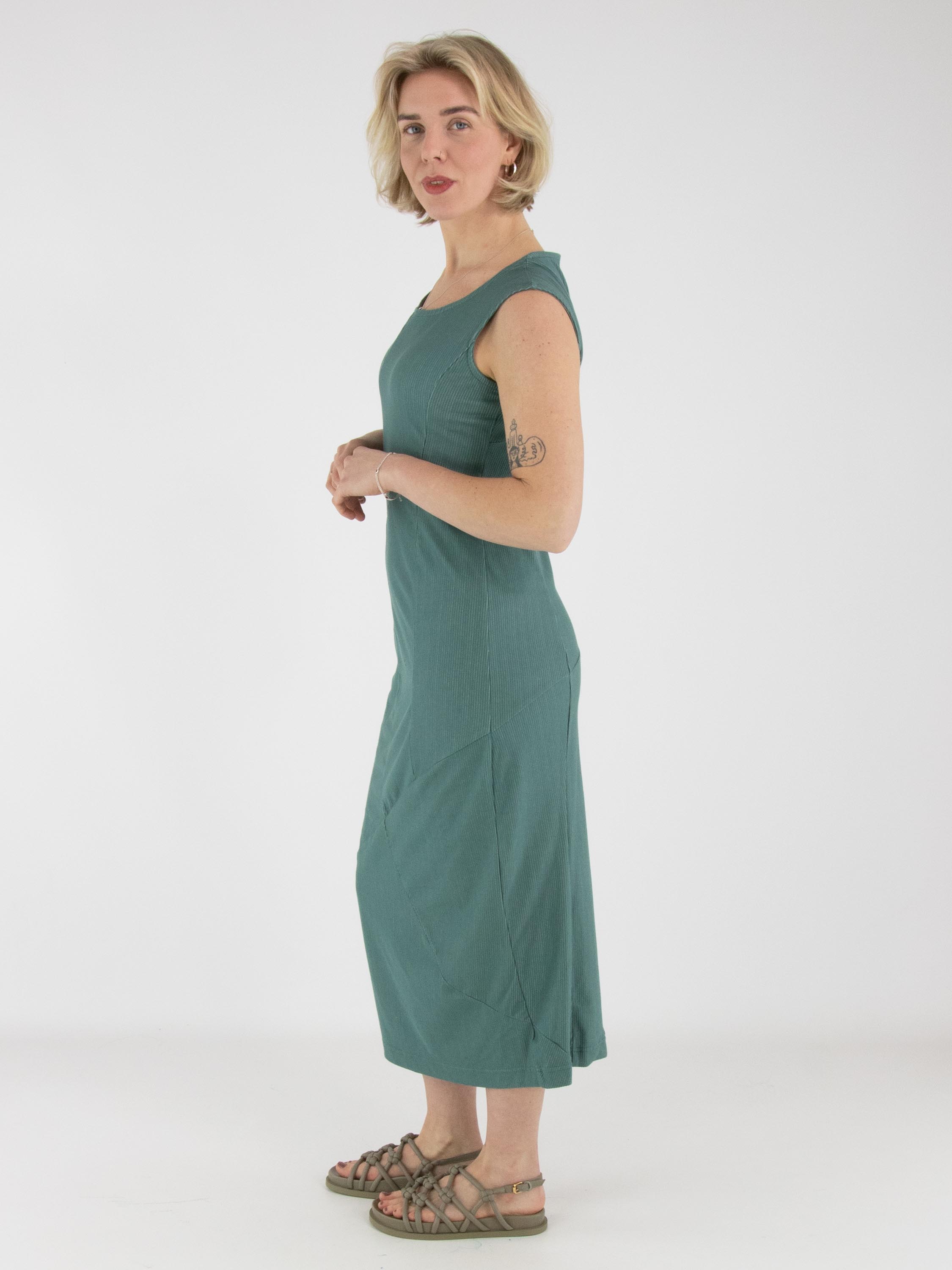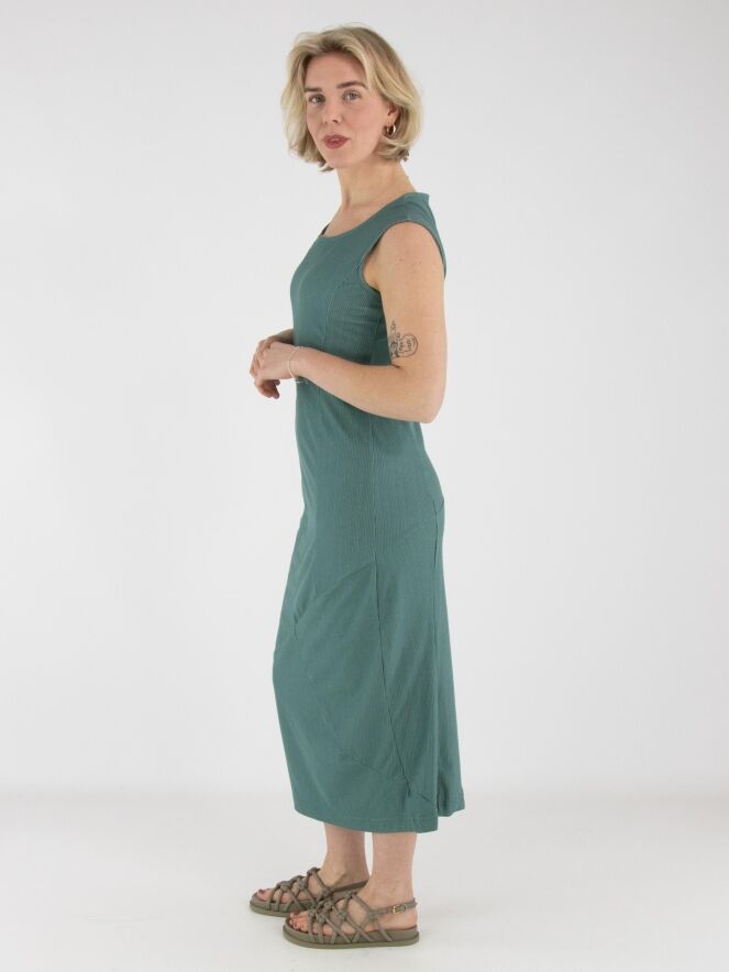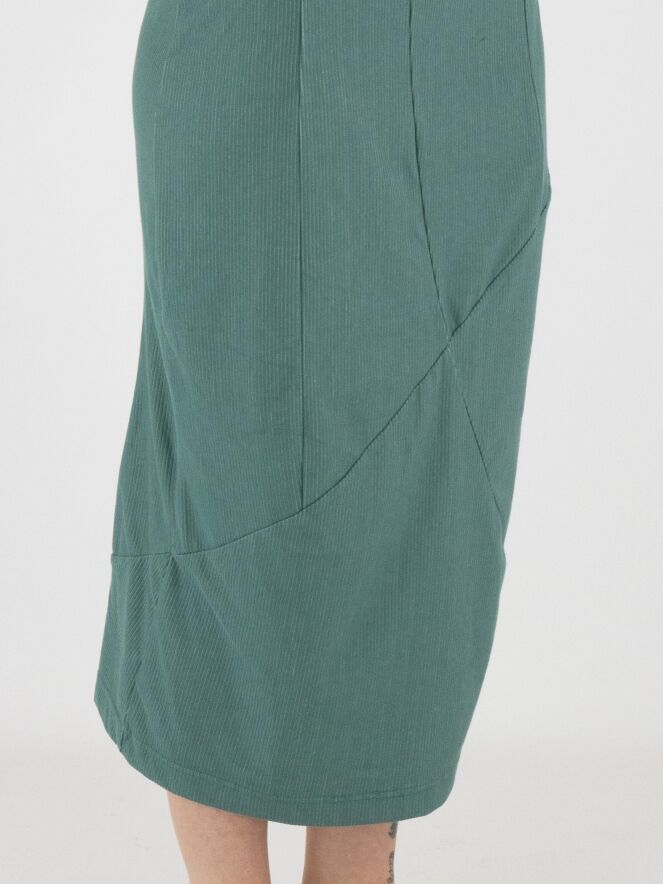 Une robe de Rundholz Black Label en vert avec une structure finement côtelée verticale. La robe présente une encolure ronde. La couture centrale part de la taille et descend en diagonale, créant un léger effet ballon. Le tissu est légèrement extensible et peut être lavé à 30 degrés.