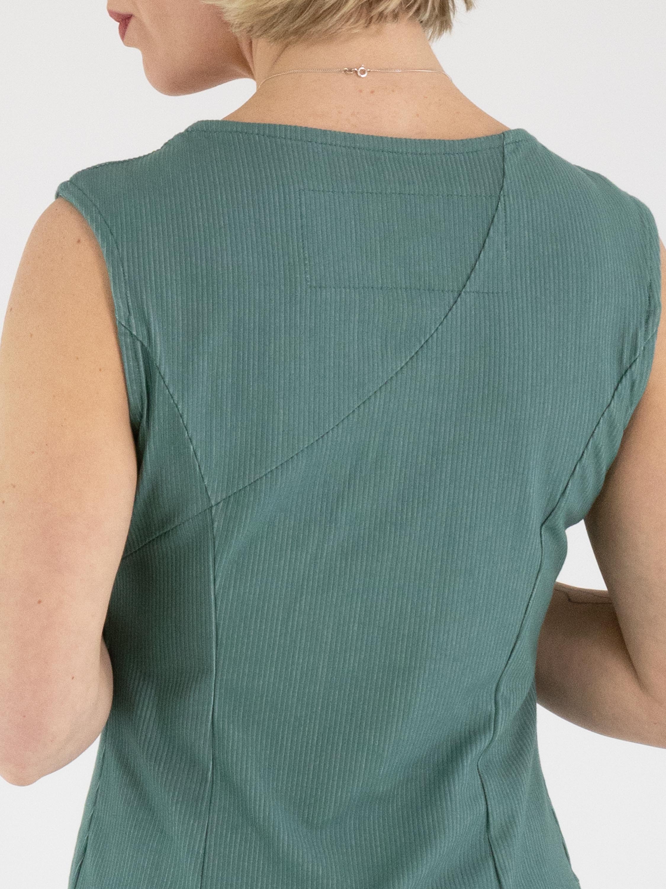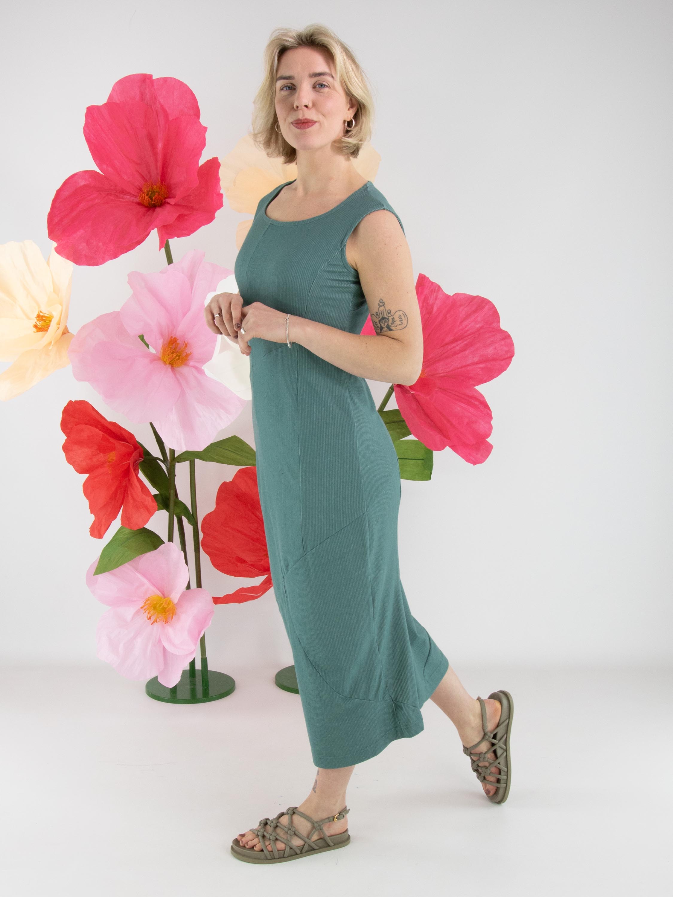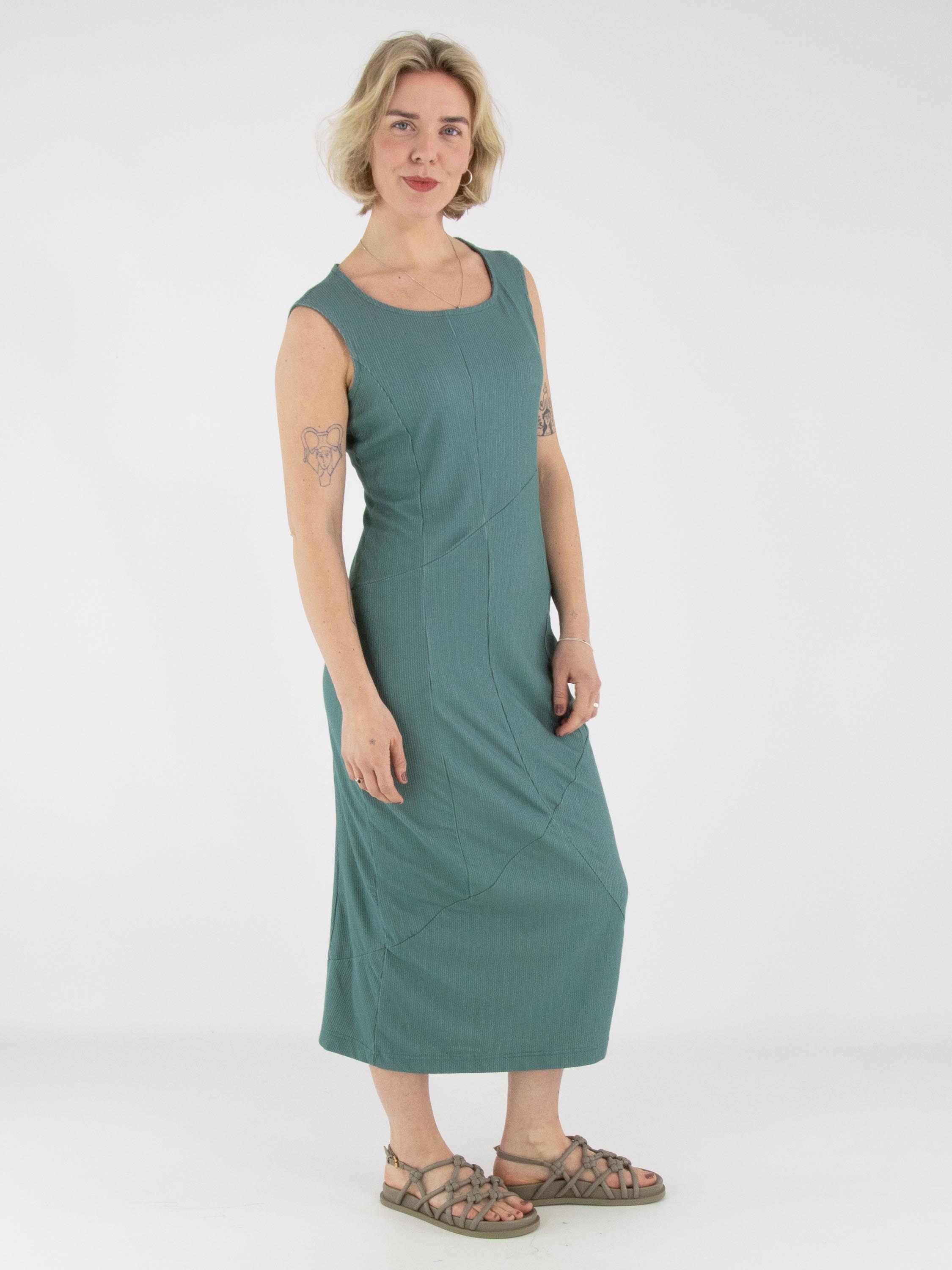 Une robe de Rundholz Black Label en vert avec une structure finement côtelée verticale. La robe présente une encolure ronde. La couture centrale part de la taille et descend en diagonale, créant un léger effet ballon. Le tissu est légèrement extensible et peut être lavé à 30 degrés.