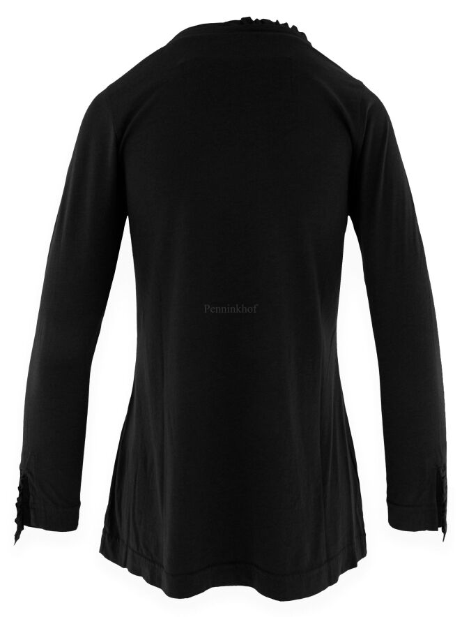 Une t shirt de la marque Rundholz black label dans la couleur noire. Le bord de l'encolure ronde est en partie orné d'une fine bordure plissée. Au bout des manches demi-longues se trouve une fente dont l'un des bords est finement plissé. Cette T shirt peut être lavée à 30 degrés.