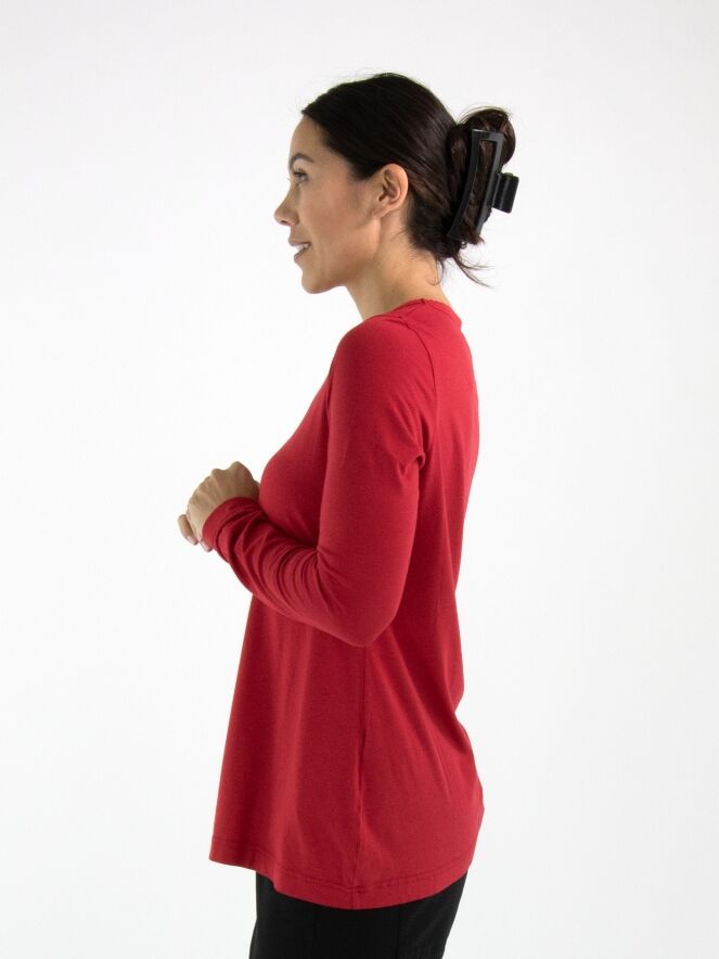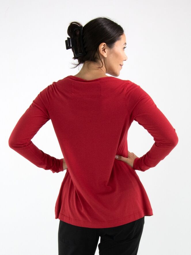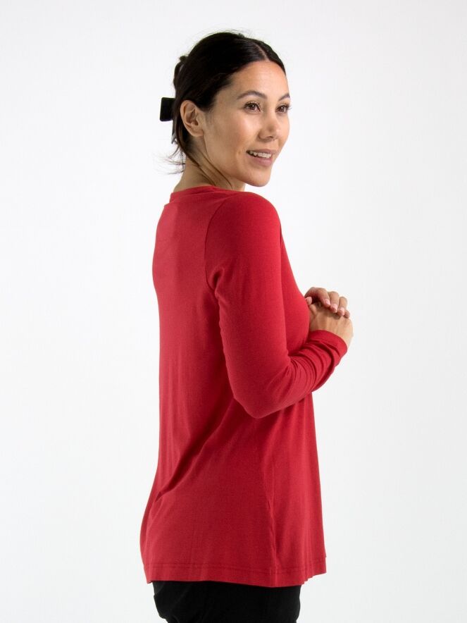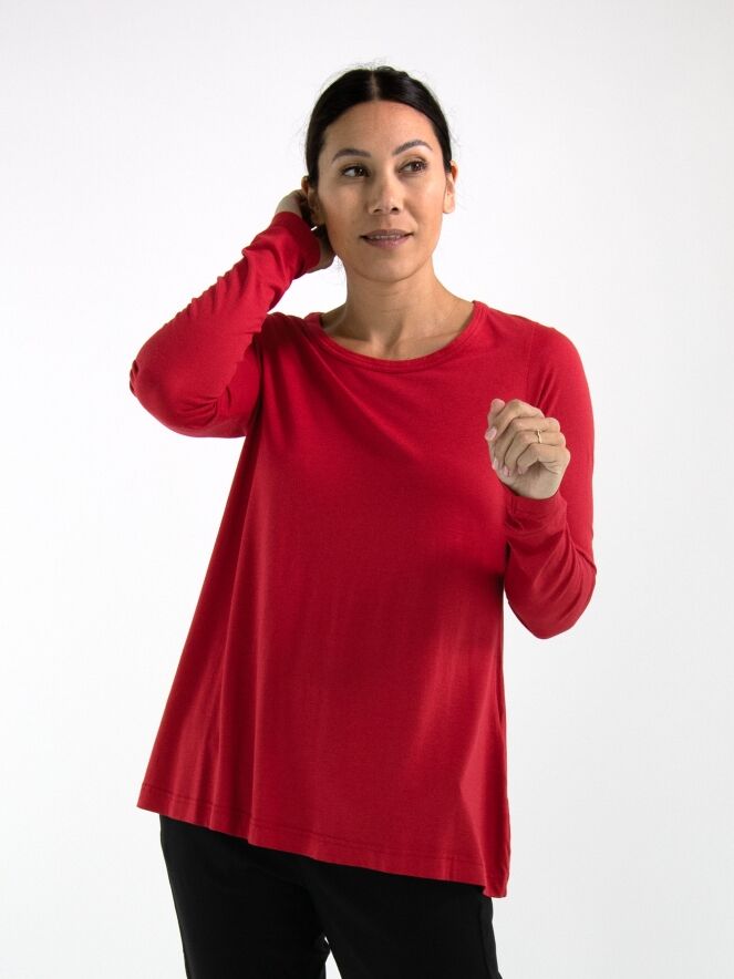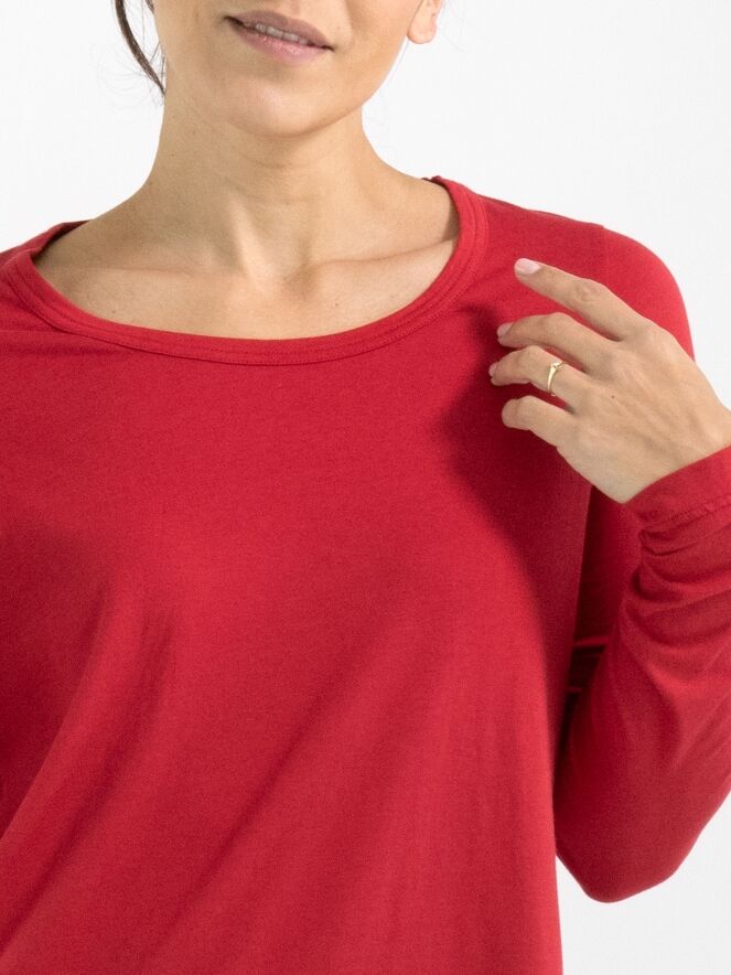 Un haut de Rundholz Black Label en rouge. Le modèle présente une encolure ronde et des manches longues. Ce haut peut être lavé à 30 degrés.