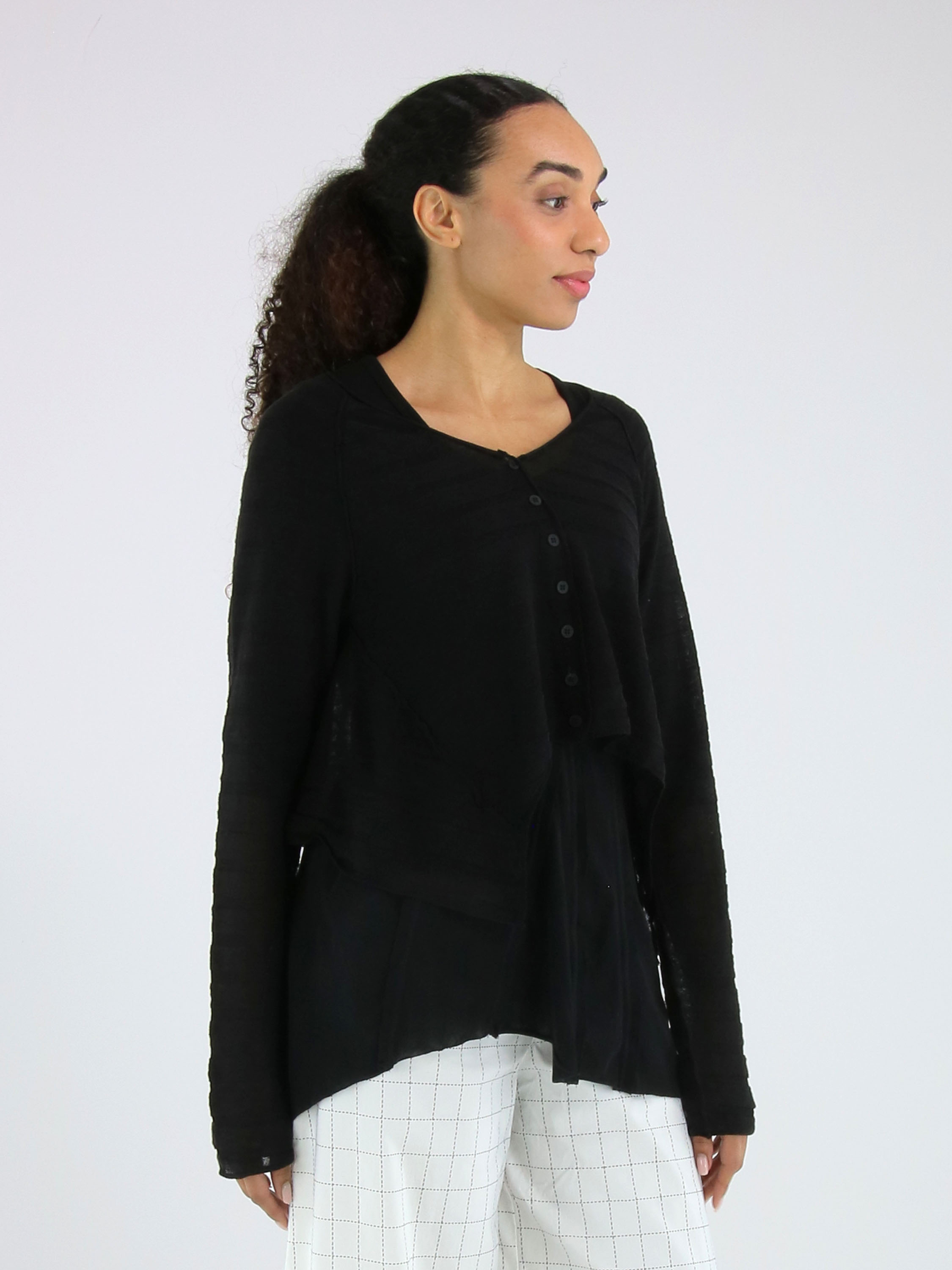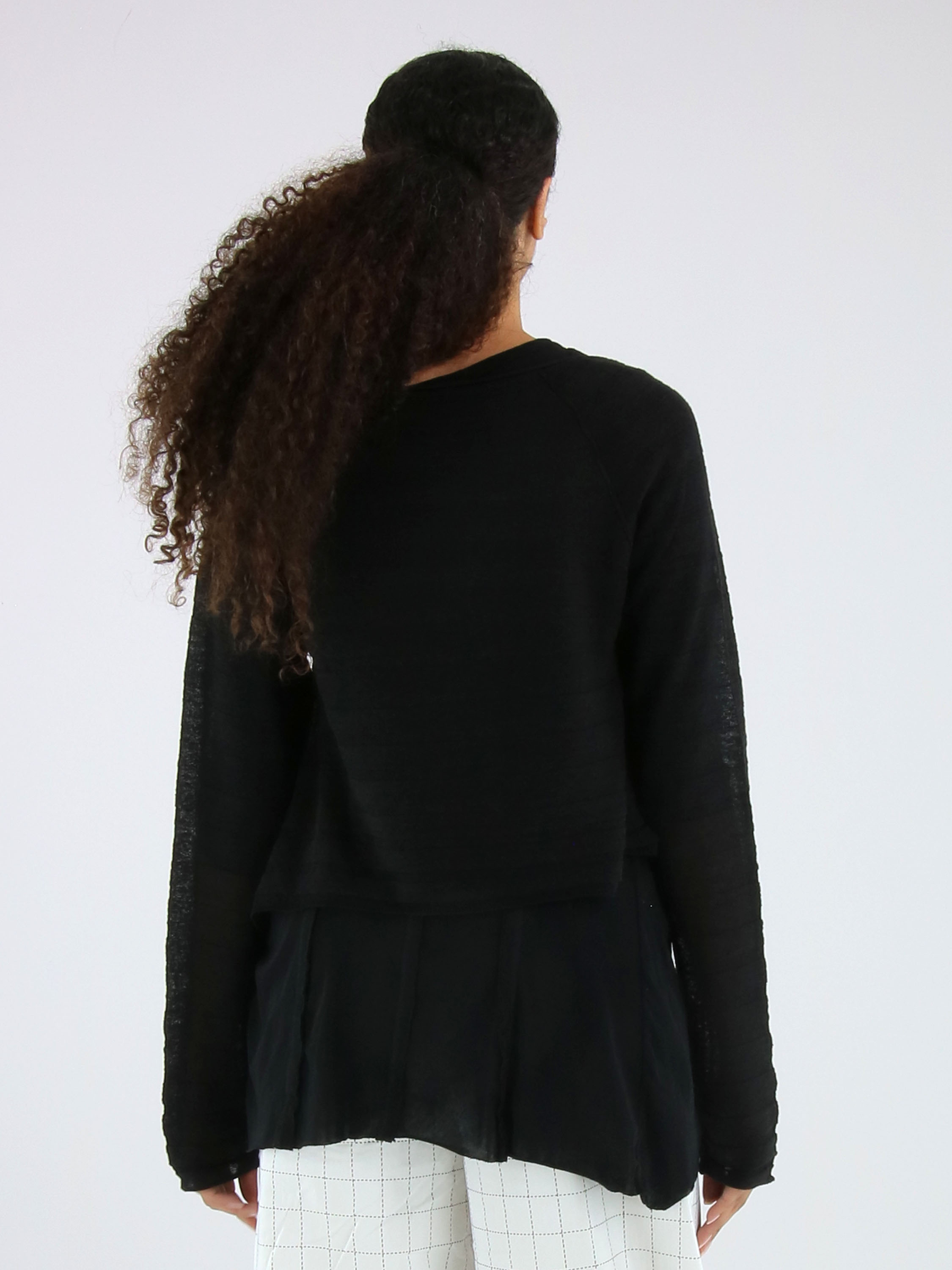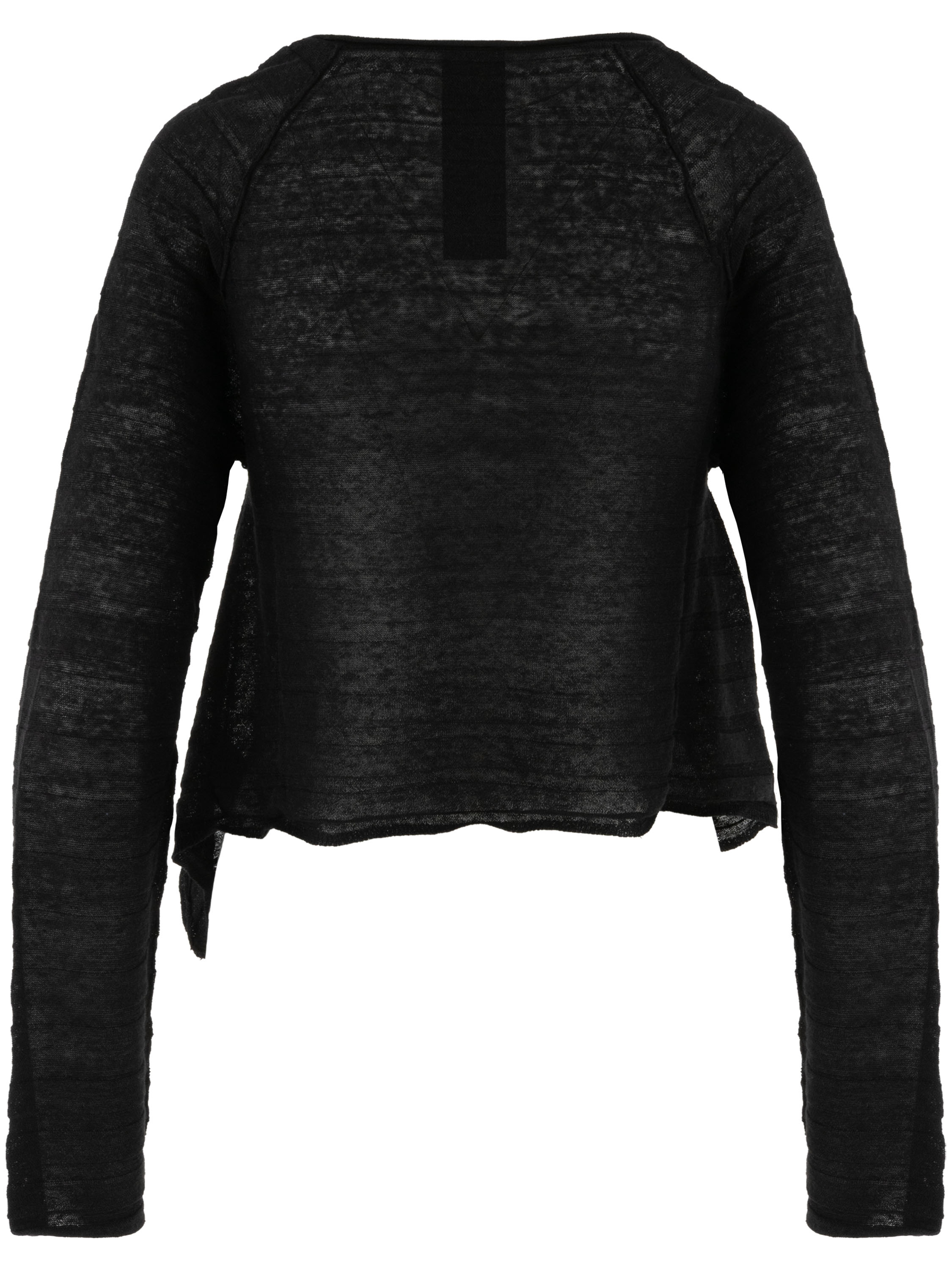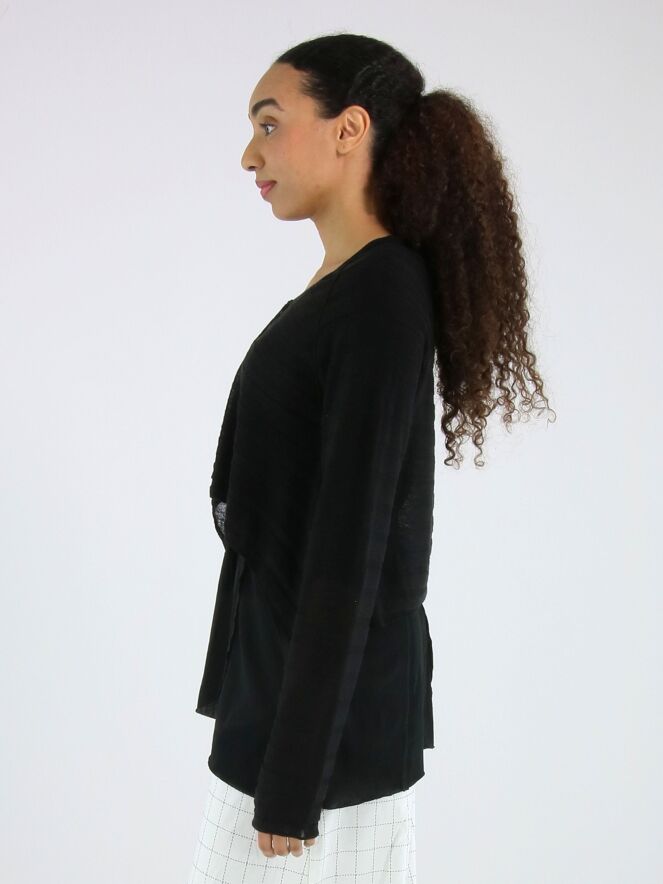 Gilet court et légèrement transparent de Rundholz Black Label en noir. Le tissu présente une structure subtilement rayée, apportant une touche raffinée et contemporaine. Les côtés sont légèrement plus longs que la partie centrale à l’ourlet, créant une silhouette moderne et originale. Ce gilet peut être lavé à 30 degrés.