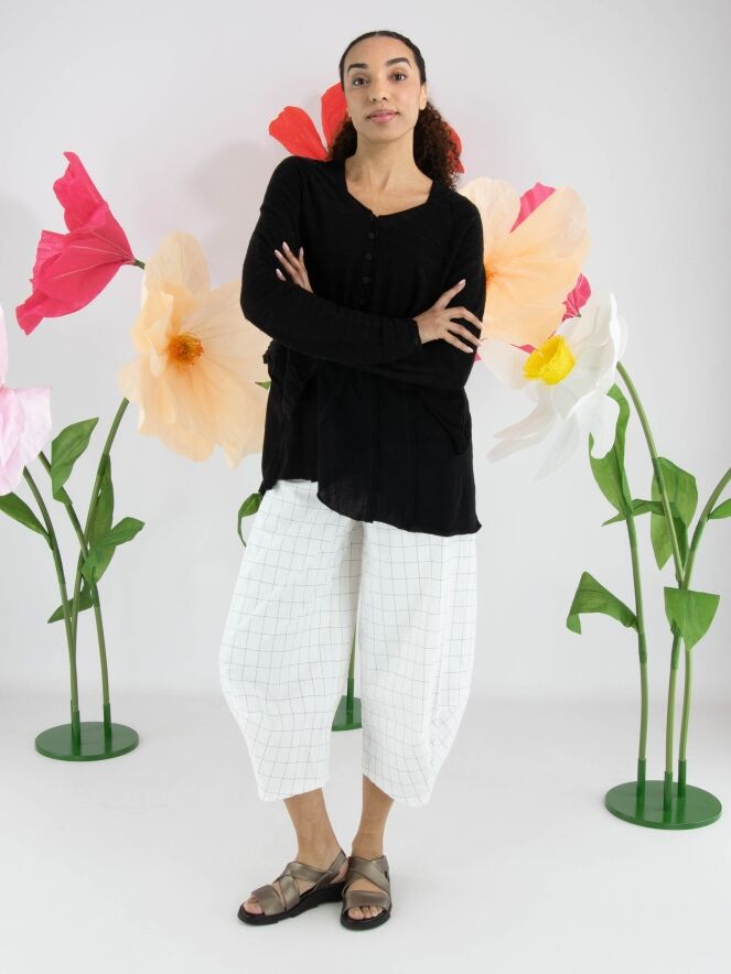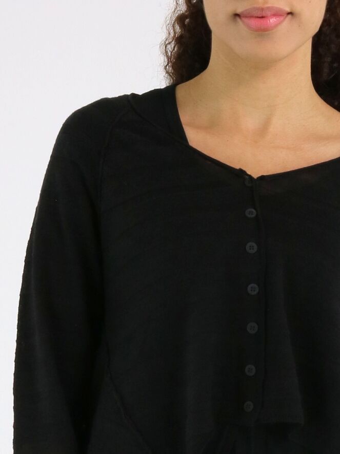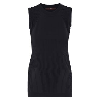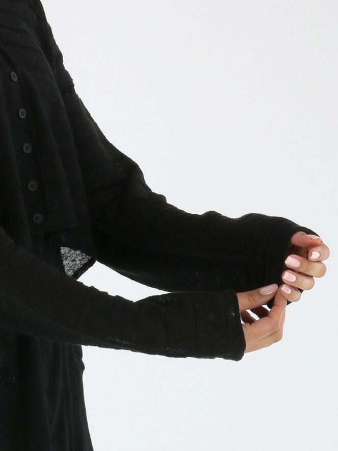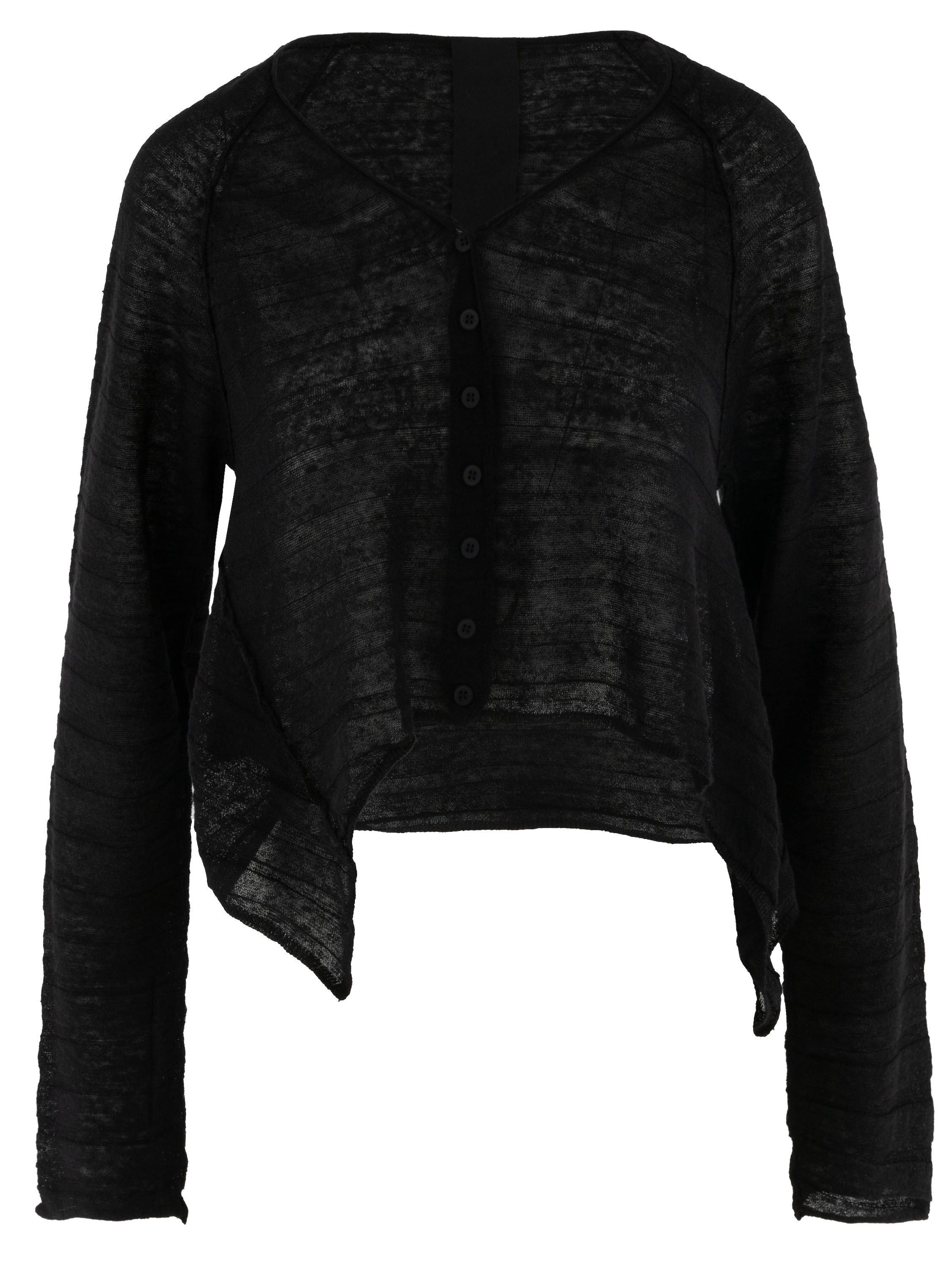 Gilet court et légèrement transparent de Rundholz Black Label en noir. Le tissu présente une structure subtilement rayée, apportant une touche raffinée et contemporaine. Les côtés sont légèrement plus longs que la partie centrale à l’ourlet, créant une silhouette moderne et originale. Ce gilet peut être lavé à 30 degrés.