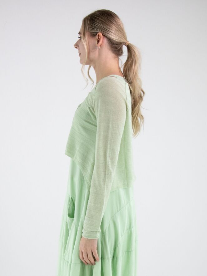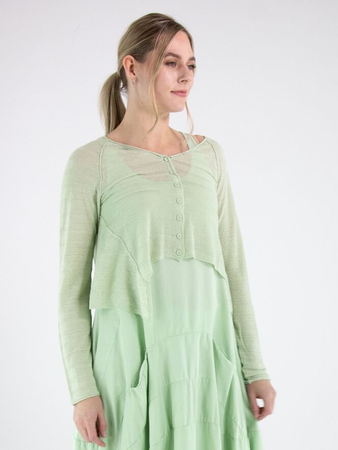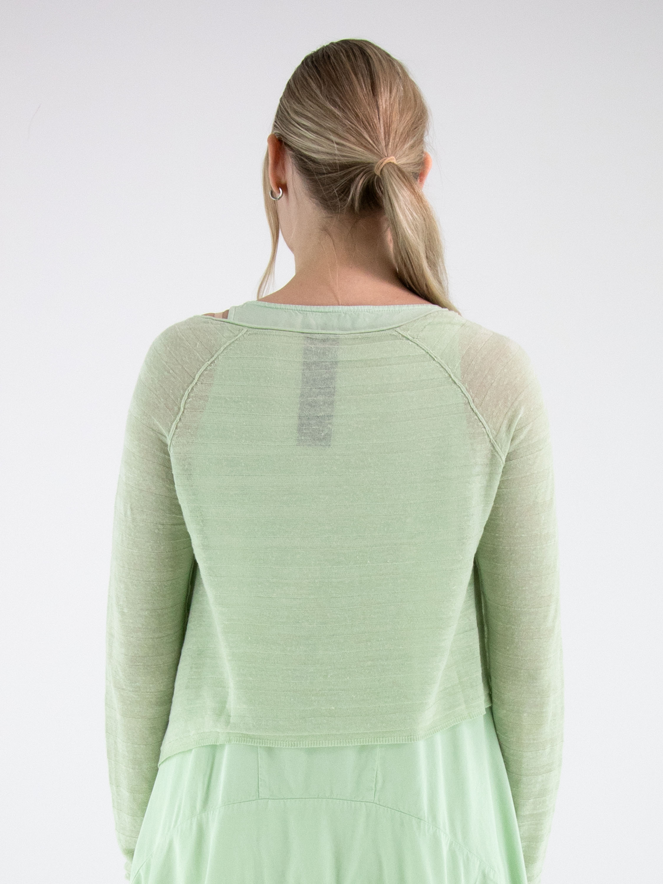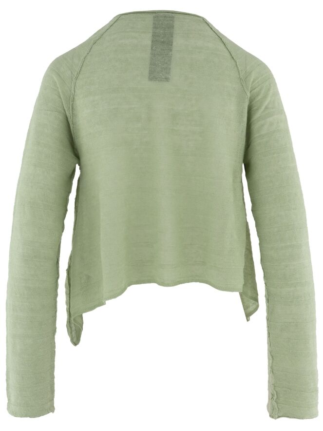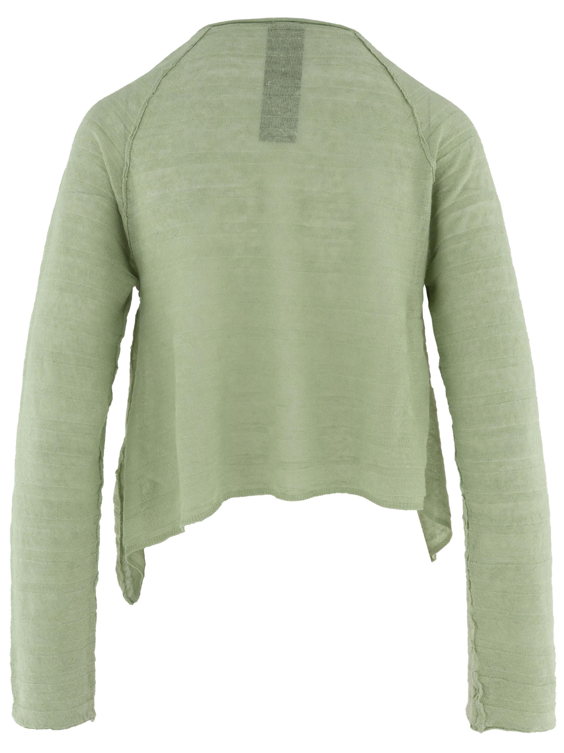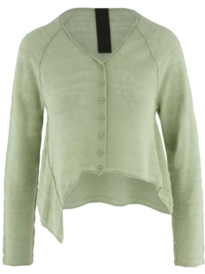 Cardigan court et légèrement transparent de Rundholz Black Label dans une teinte vert pistache fraîche. Le tissu présente une fine structure rayée qui apporte une touche moderne et raffinée. À l’ourlet, les côtés sont légèrement plus longs que la partie centrale, créant une silhouette contemporaine et originale. Ce cardigan de créateur exclusif peut être lavé à 30 degrés.