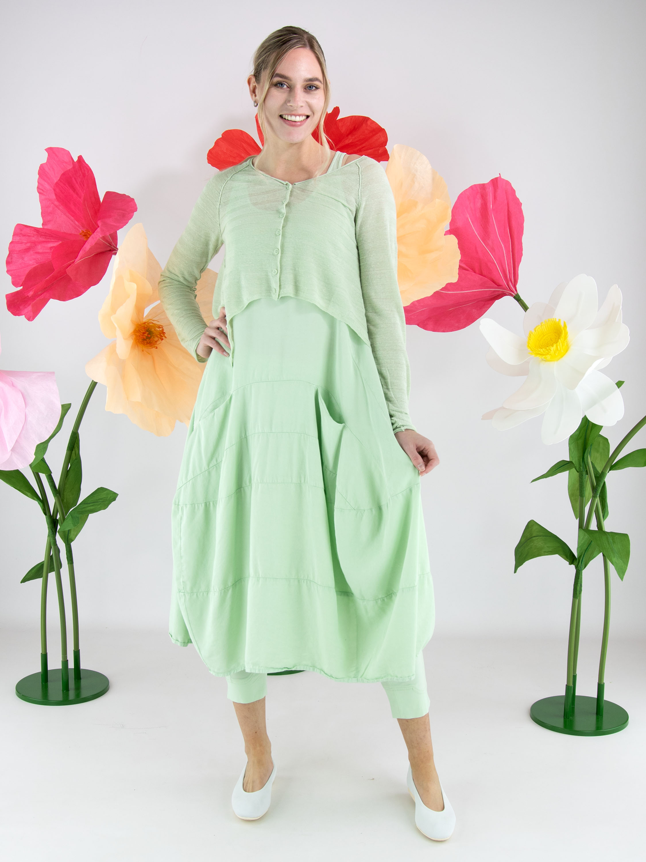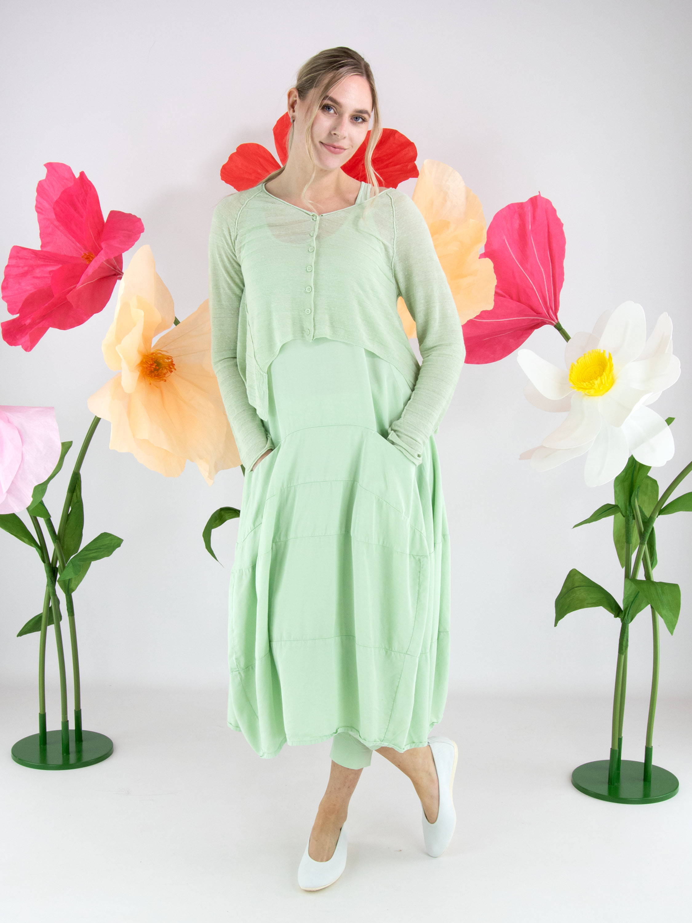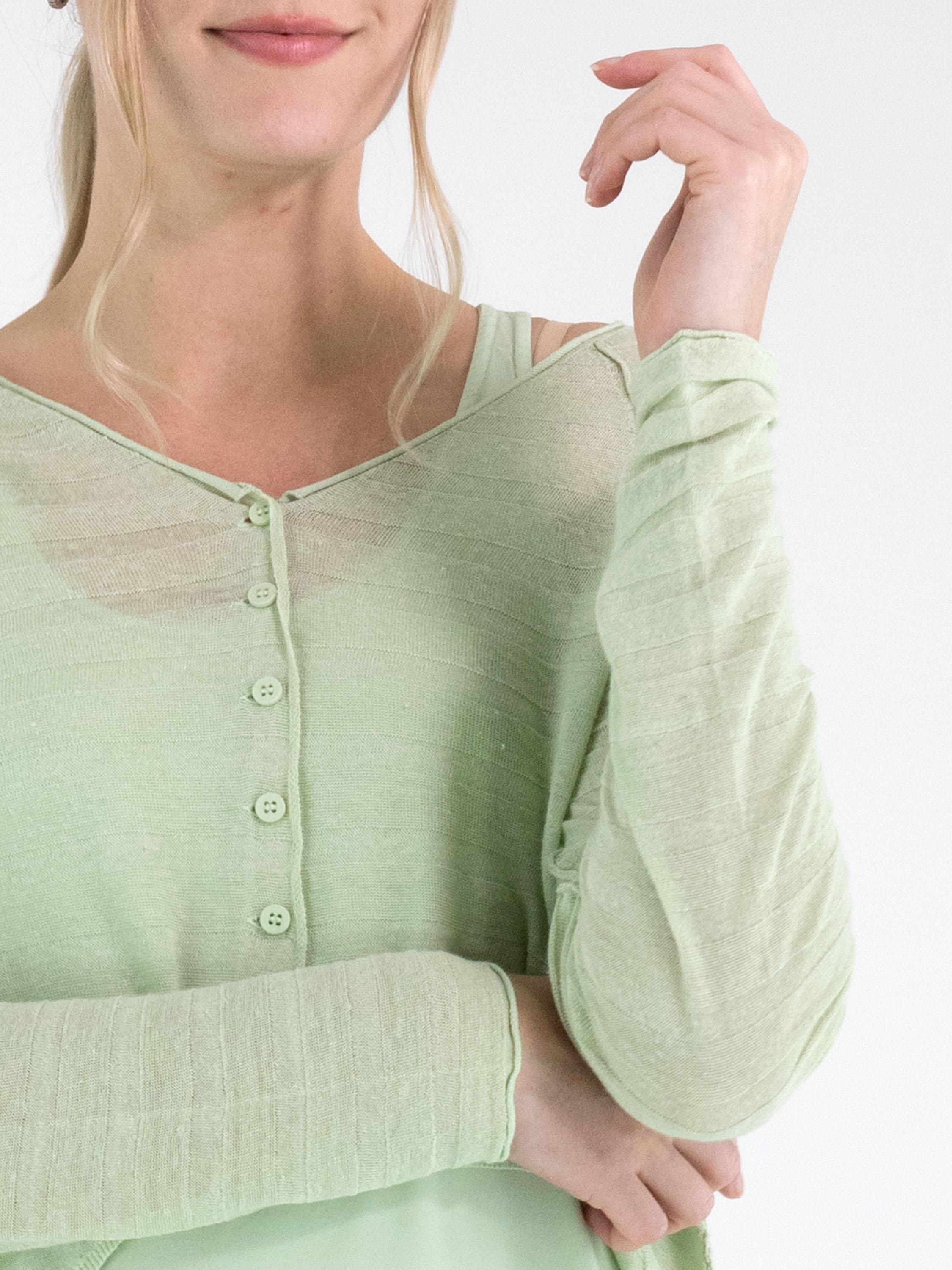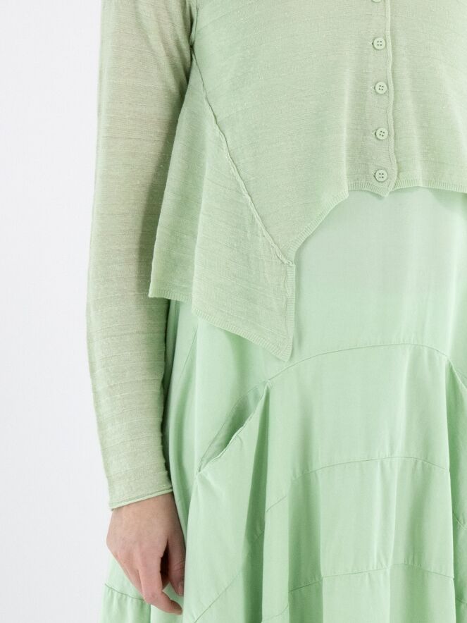 Cardigan court et légèrement transparent de Rundholz Black Label dans une teinte vert pistache fraîche. Le tissu présente une fine structure rayée qui apporte une touche moderne et raffinée. À l’ourlet, les côtés sont légèrement plus longs que la partie centrale, créant une silhouette contemporaine et originale. Ce cardigan de créateur exclusif peut être lavé à 30 degrés.