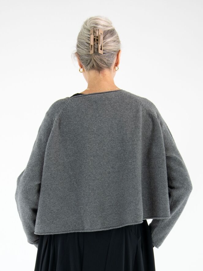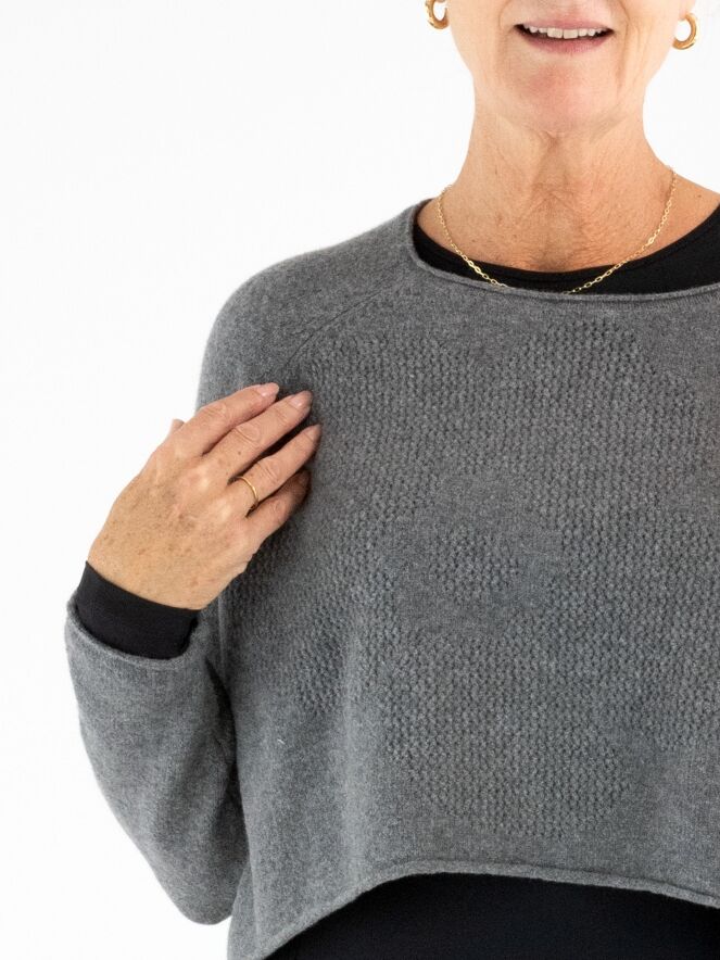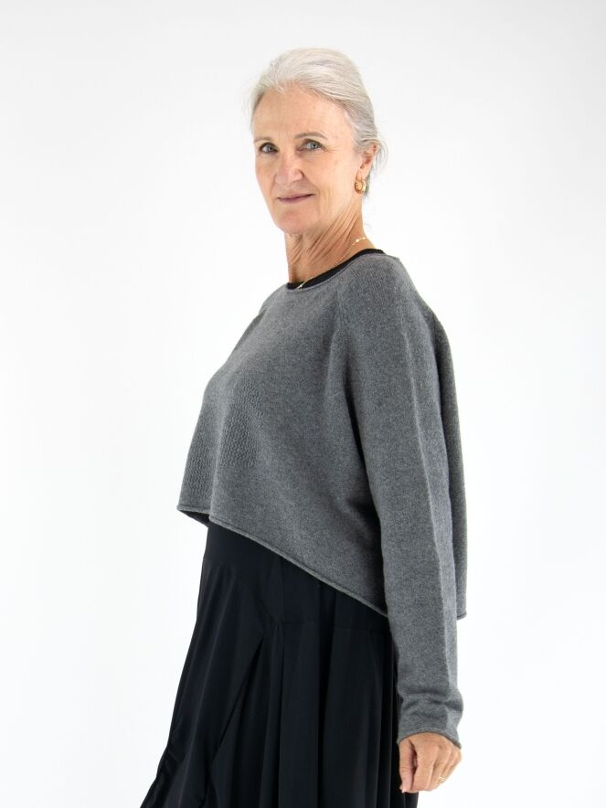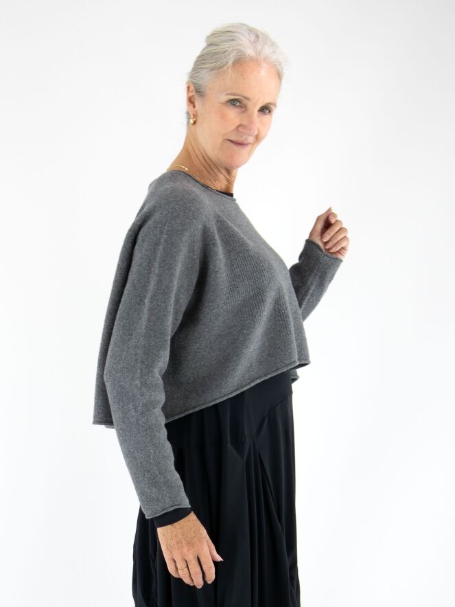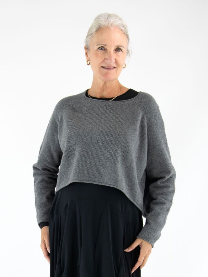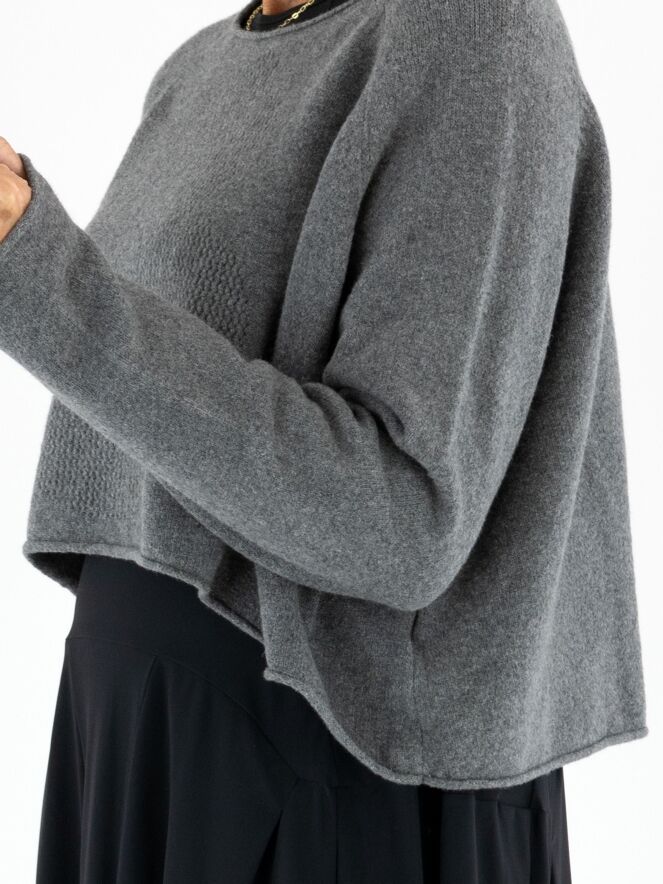 Pull court et ample de Rundholz Black Label en gris chiné. Un motif graphique est créé à l’avant grâce à différentes techniques de tricot. L’encolure ronde et l’ourlet sont côtelés. Ce pull doit être lavé à la main.