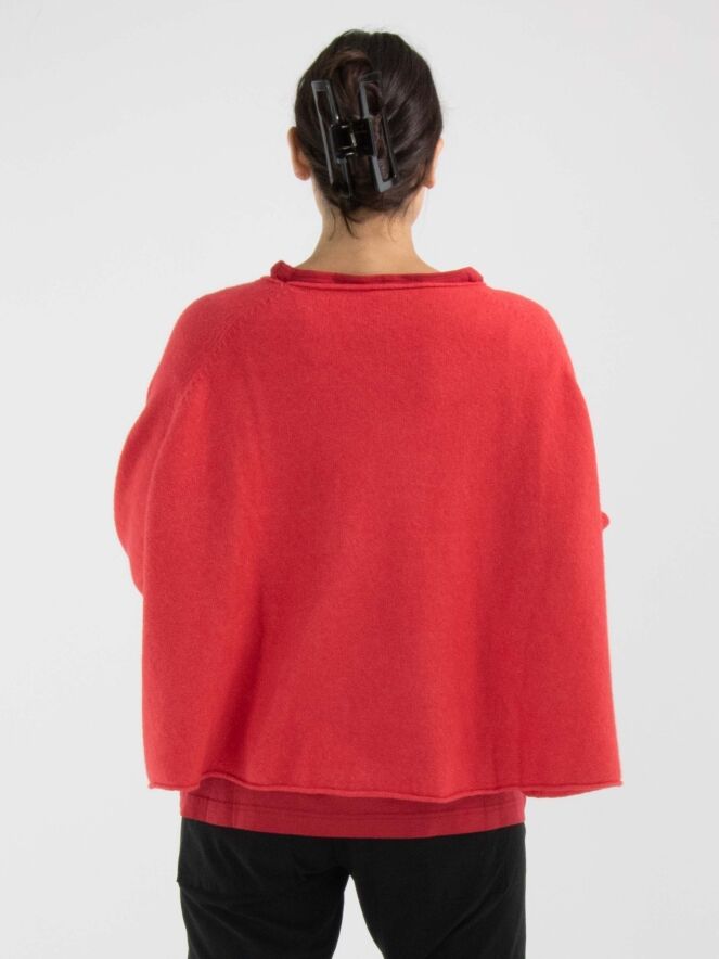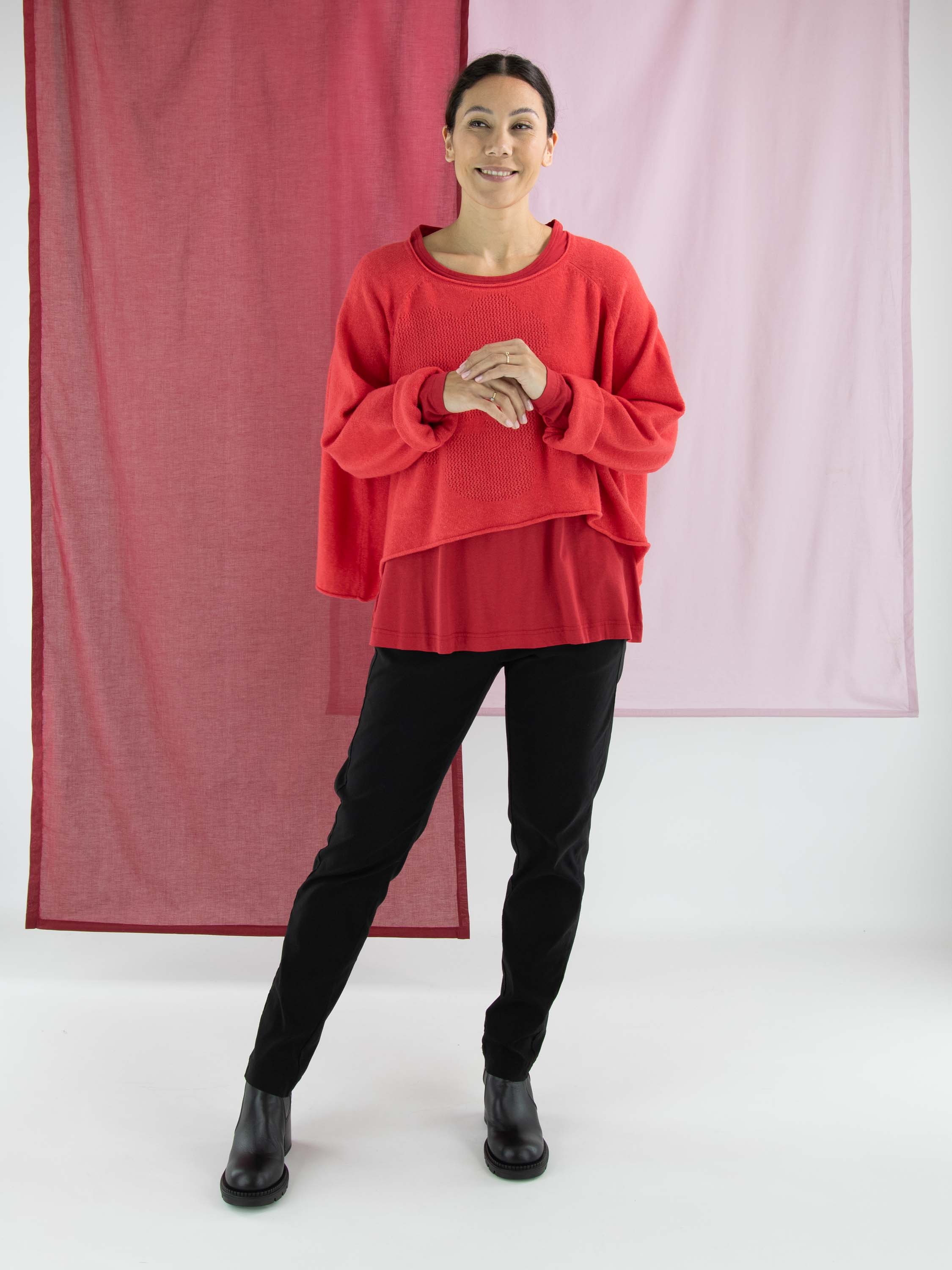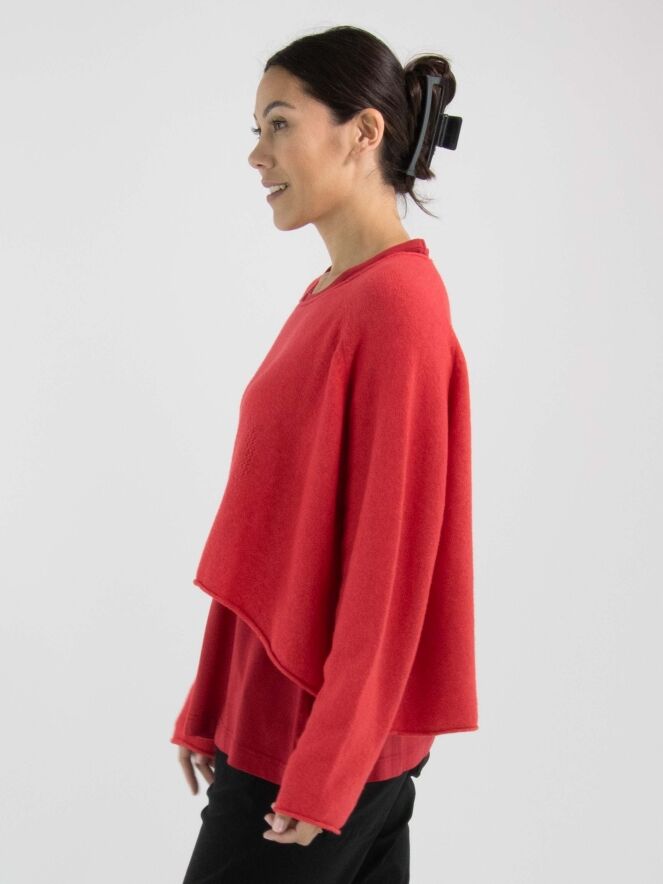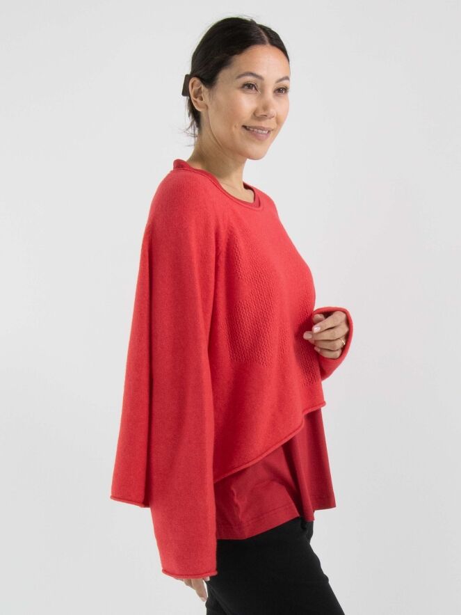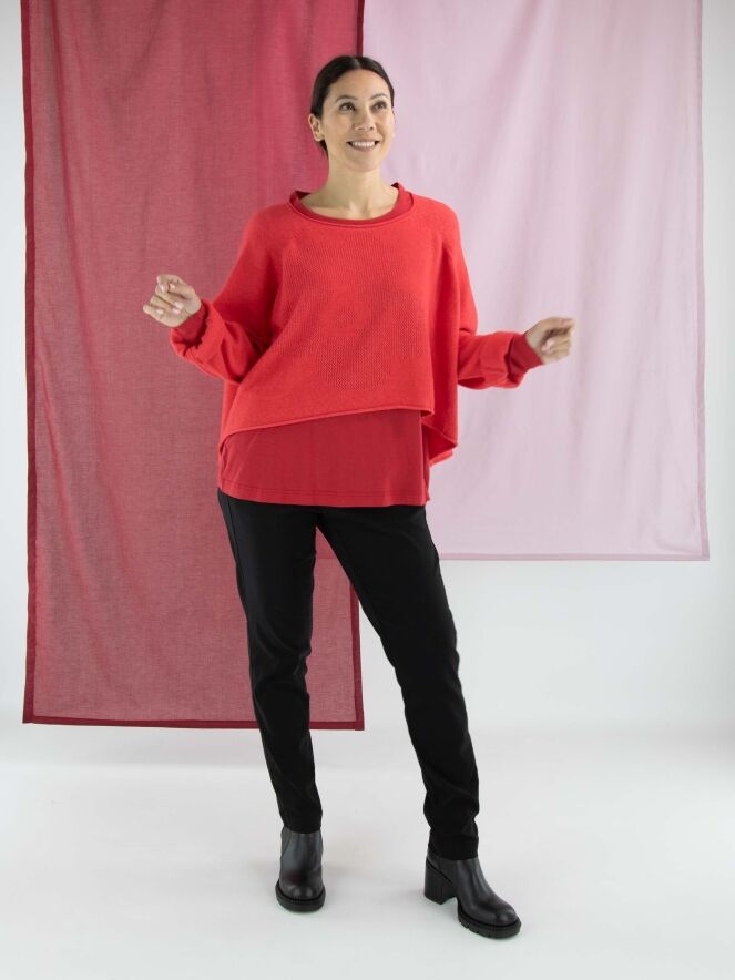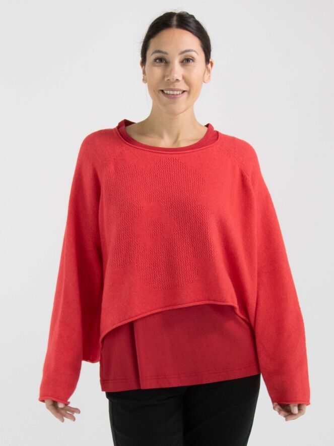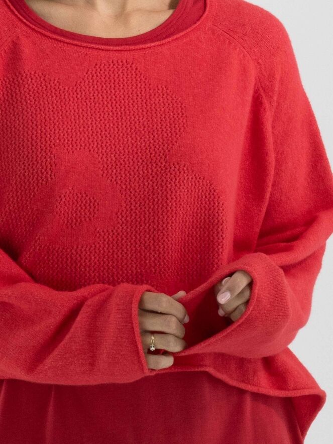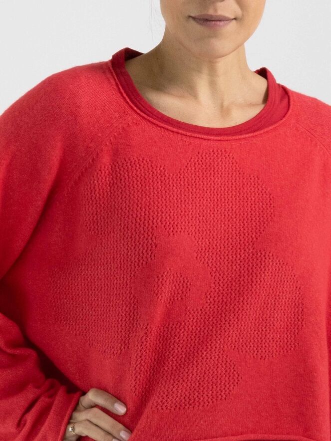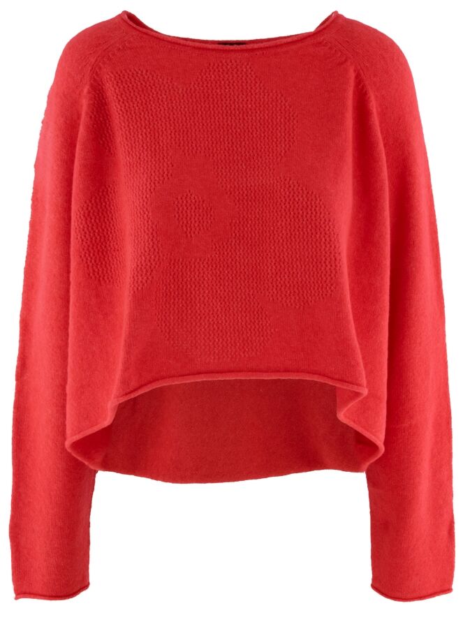 Pull court et ample de Rundholz Black Label dans une teinte rouge chiné. L’avant présente un motif graphique réalisé avec différents points de tricot. Le bord du col rond et de l’ourlet est froncé. Ce pull doit être lavé à la main.