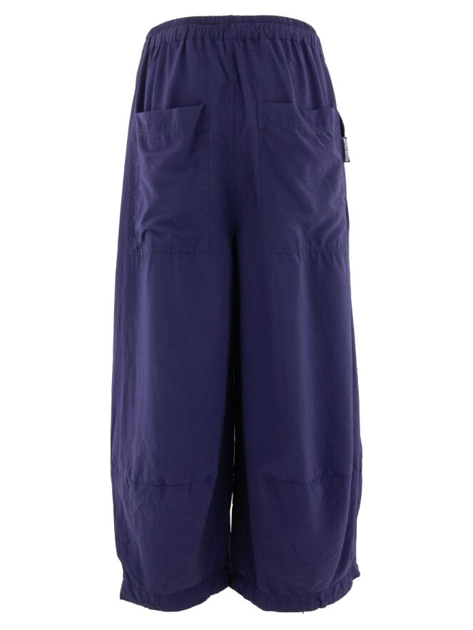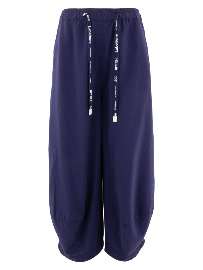 Pantalon large de Rundholz Black Label en bleu indigo. Il y a une bande élastique finement plissée avec un cordon de serrage dans un traitement tunnel à la taille. Au niveau du mollet, il y a une couture dans les jambes, après quoi les jambes se resserrent légèrement vers le bas. Ce pantalon peut être lavé à la main.