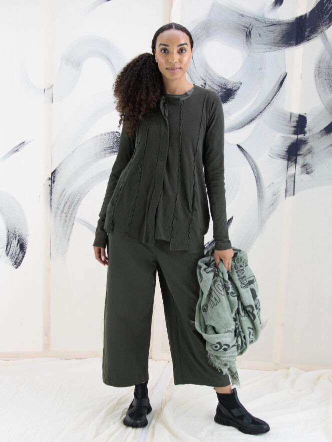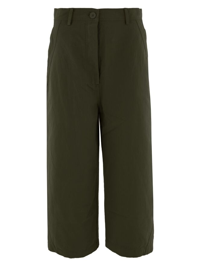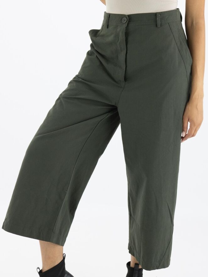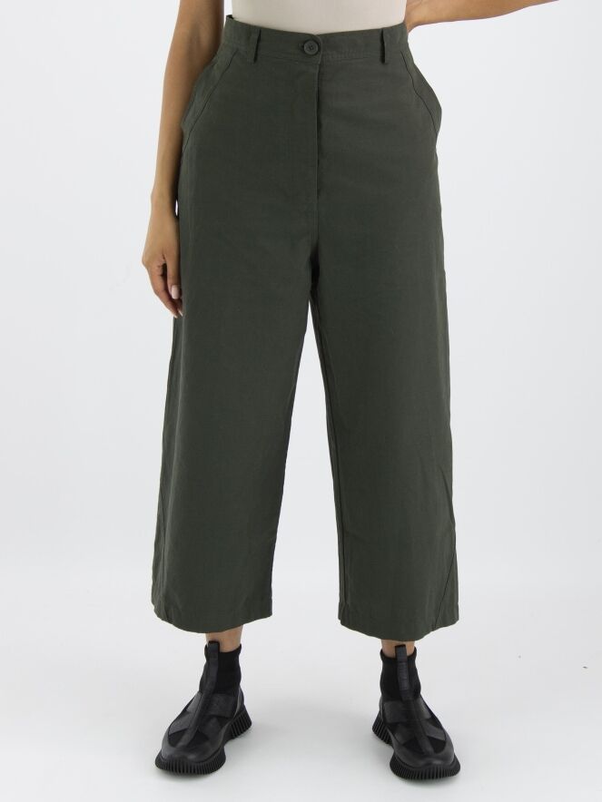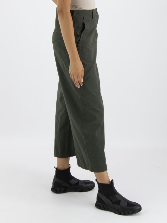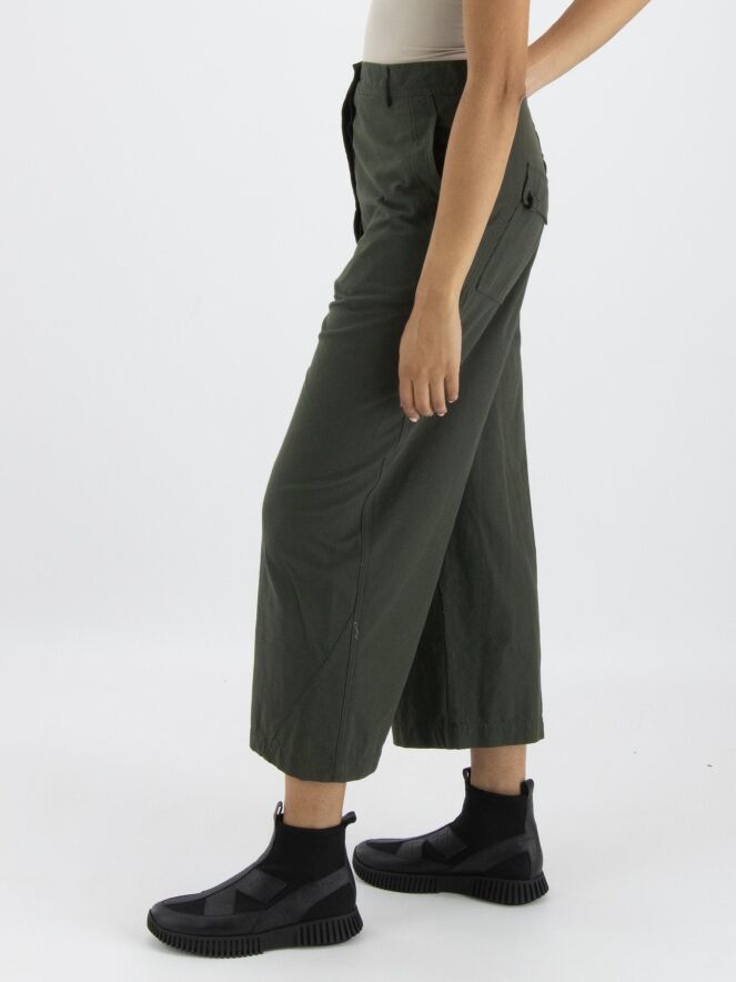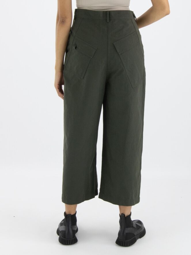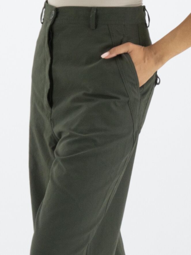 Un pantalon large à coupe droite de Rundholz Black Label de couleur kaki. Le pantalon a des poches fendues et peut être lavé à 30 degrés.