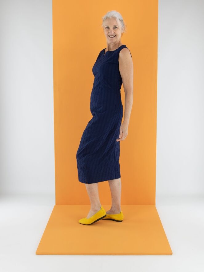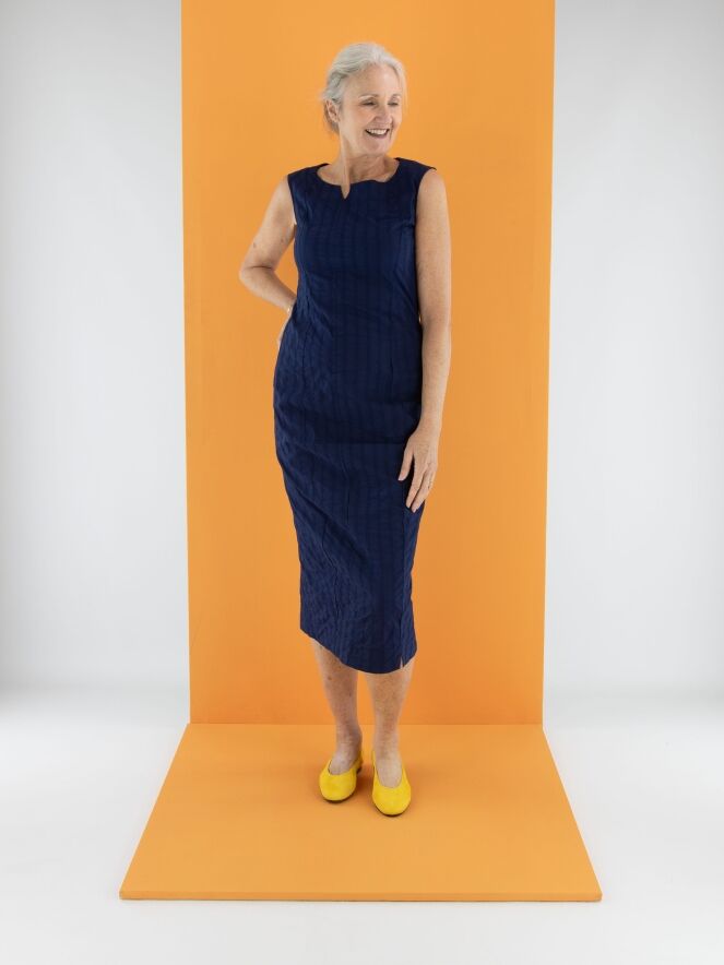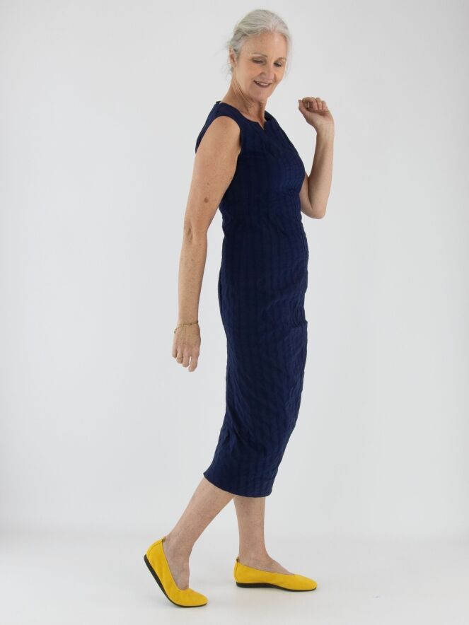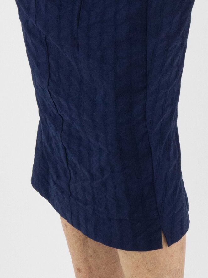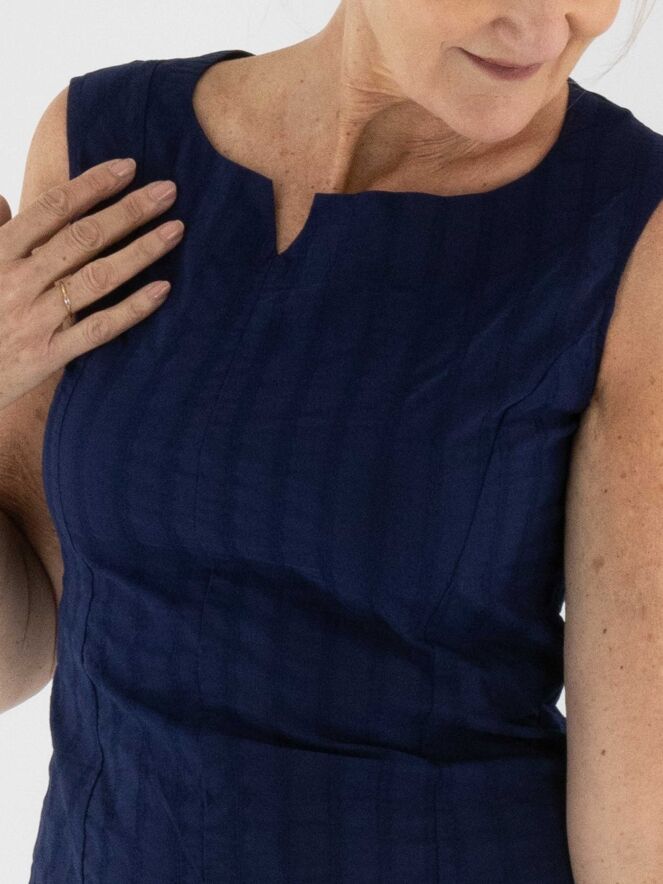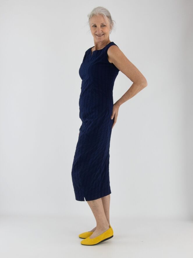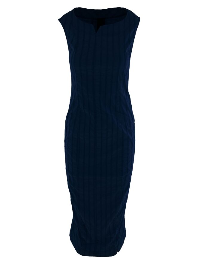 Une robe légèrement cintrée de Rundholz Black Label en bleu marine. La robe présente un motif de rayures verticales avec des coutures apparentes. Une petite fente est placée au centre de l'encolure ronde. Cette robe peut être lavée à 30 degrés.