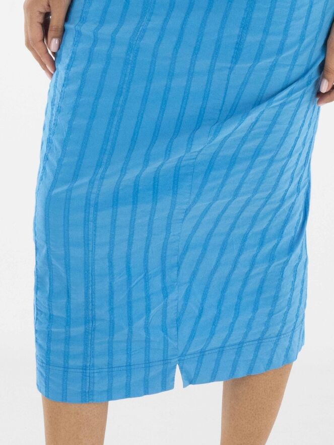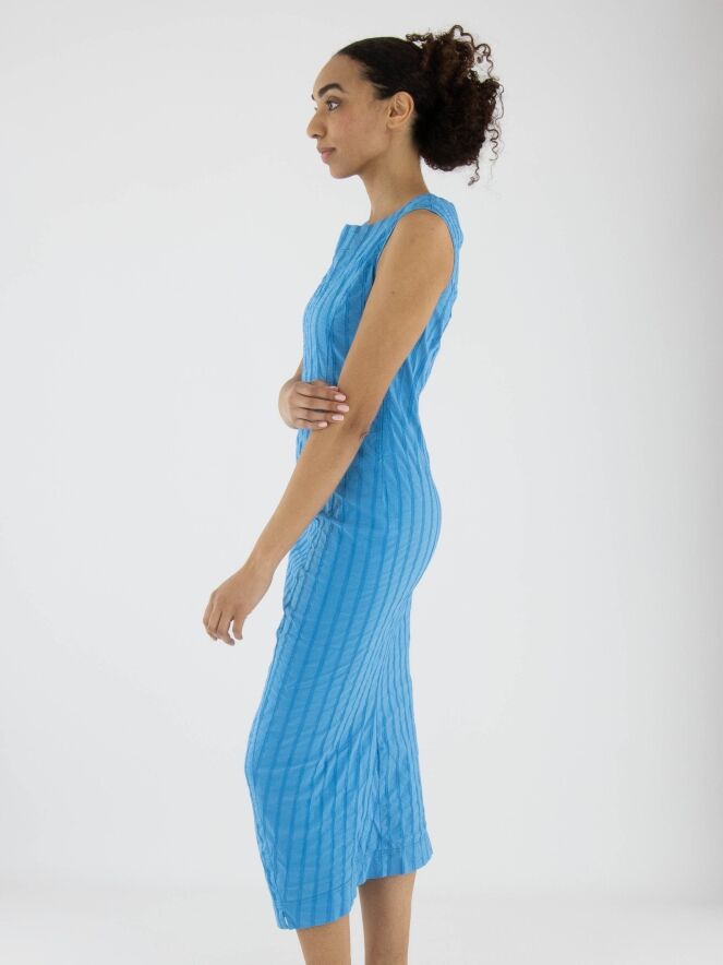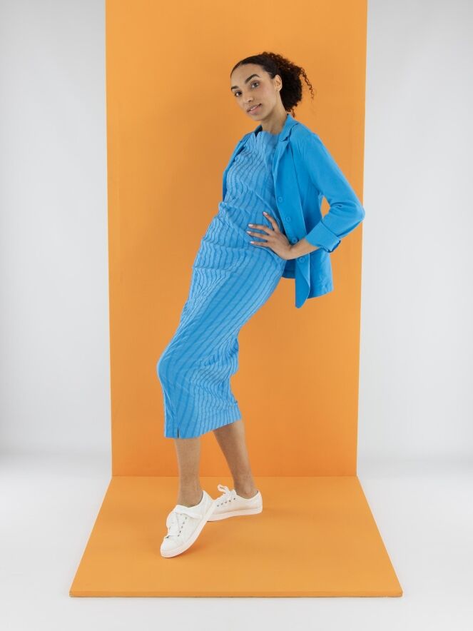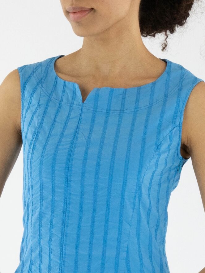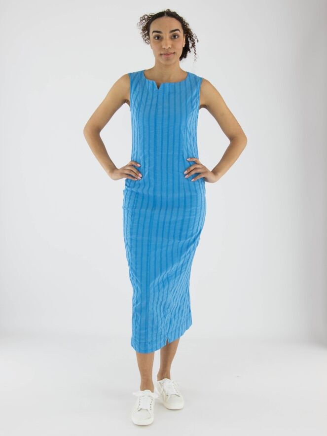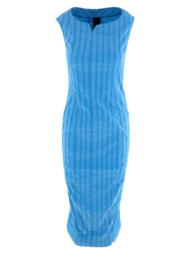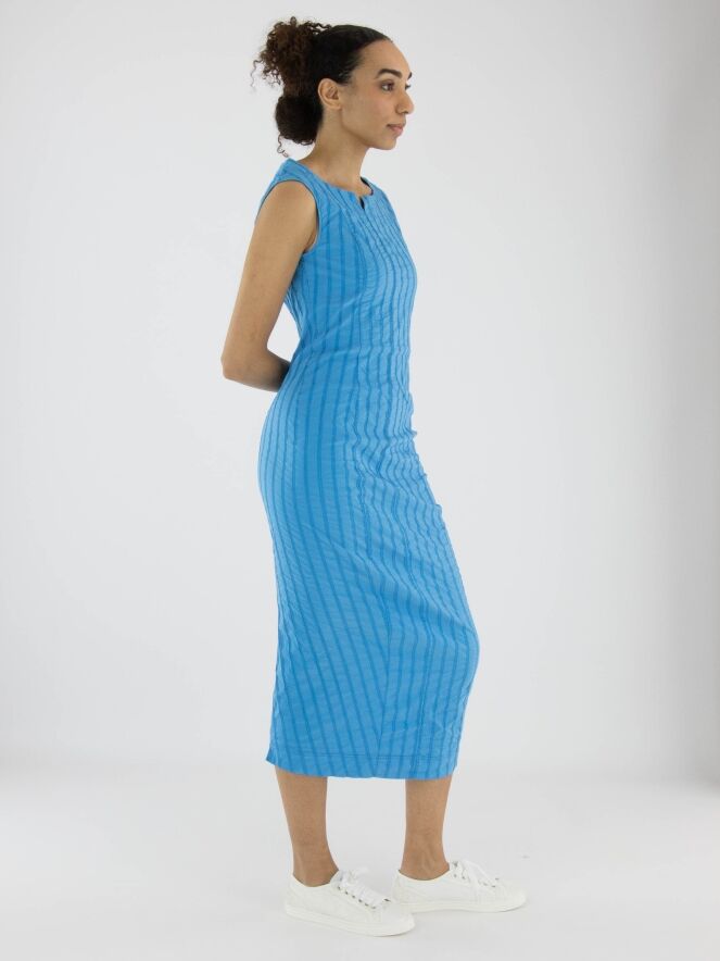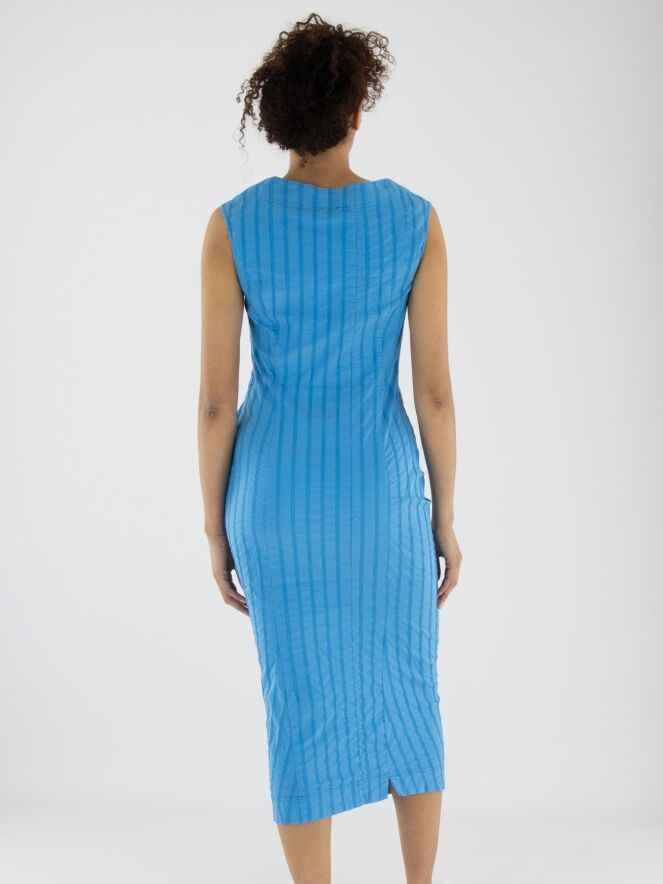 Une robe légèrement cintrée de Rundholz Black Label en bleu vif. La robe présente un motif de rayures verticales avec des surpiqûres. Une petite fente est située au centre de l'encolure ronde. Cette robe peut être lavée à 30 degrés.